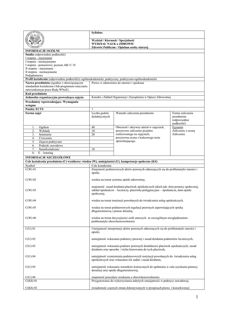Syllabus Wydział / Kierunek / Specjalność WYDZIAŁ NAUK o ZDROWIU Zdrowie Publiczne / Opiekun osoby starszej INFORMACJE OGÓLNE Studia (odpowiednie podkreślić) I stopnia - stacjonarne I stopnia - niestacjonarne I stopnia - pomostowe: poziom AB/ C/ D II stopnia - stacjonarne II stopnia - niestacjonarne Podyplomowe Profil kształcenia (odpowiednie podkreślić): ogólnoakademicki, praktyczny, praktyczno-ogólnoakademicki Nazwa przedmiotu (zgodnie z obowiązującym Prawo w odniesieniu do starości i opiekuna standardem kształcenia i/lub programem nauczania zatwierdzonym przez Radę WNoZ). Kod przedmiotu Katedra i Zakład Organizacji i Zarządzania w Opiece Zdrowotnej Jednostka organizacyjna prowadząca zajęcia Przedmioty wprowadzające. Wymagania wstępne Punkty ECTS Forma zajęć 1. 2. 3. 4. 5. 6. 7. 8. Ogółem Wykłady Seminaria Ćwiczenia Zajęcia praktyczne Praktyki zawodowe Samokształcenie E – learning 1 Liczba godzin dydaktycznych 40 10 20 Warunki zaliczenia przedmiotu Obecność i aktywny udział w zajęciach, pozytywne zaliczenie projektu realizowanego na zajęciach, pozytywna ocena z końcowego testu sprawdzającego. Forma zaliczenia przedmiotu (odpowiednie podkreślić) Egzamin Zaliczenie z oceną Zaliczenie 10 INFORMACJE SZCZEGÓŁOWE Cele kształcenia przedmiotu (C) wynikowe: wiedza (W), umiejętności (U), kompetencje społeczne (KS) Symbol Cele kształcenia C(W) 01 Znajomość podstawowych aktów prawnych odnoszących się do problematyki starości i opieki, C(W) 02 wiedza na temat systemu opieki zdrowotnej, C(W) 03 znajomość zasad działania placówek opiekuńczych takich jak: dom pomocy społecznej, zakład opiekuńczo – leczniczy, placówka pielęgnacyjno – opiekuńcza, dom opieki społecznej, C(W) 04 wiedza na temat instytucji powołanych do świadczenia usług opiekuńczych, C(W) 05 wiedza na temat podstawowych regulacji prawnych zapewniających opiekę długoterminową i pomoc doraźną, C(W) 06 wiedza na temat decyzyjności osób starszych ze szczególnym uwzględnieniem problematyki ubezwłasnowolnienia C(U) 01 Umiejętność interpretacji aktów prawnych odnoszących się do problematyki starości i opieki, C(U) 02 umiejętność wskazania podstawy prawnej i zasad działania podmiotów leczniczych, C(U) 03 umiejętność wskazania podstaw prawnych działalności placówek opiekuńczych, zasad działania oraz sposobu i trybu kierowania do tych placówek, C(U) 04 umiejętność wymienienia podstawowych instytucji powołanych do świadczenia usług opiekuńczych oraz wskazania ich zadań i zasad działania, C(U) 05 umiejętność wskazania warunków koniecznych do spełnienia w celu uzyskania pomocy doraźnej oraz opieki długoterminowej, C(U) 06 C(KS) 01 znajomość procedury orzekania o ubezwłasnowolnieniu Przygotowanie do wykorzystania nabytych umiejętności w praktyce zawodowej, C(KS) 02 świadomość częstych zmian dokonywanych w przepisach prawa i konsekwencji 1 stosowania nieaktualnych regulacji prawnych, C(KS) 03 praca zespołowa (w grupach). Przewidywane efekty kształcenia studenta w zakresie wiedzy (W), umiejętności (U), kompetencji społecznych (KS). Przewidywane efekty kształcenia studenta (EK): wiedza (W), umiejętności (U), kompetencje społeczne (KS). Potrafi wskazać podstawowe akty prawne odnoszące się do problematyki starości i opieki, Odniesienie do celów kształcenia (symbol) C(W) 01 EK (W) 02 rozumie podstawowe zasady działania systemu opieki zdrowotnej, C(W) 02 EK (W) 03 zna zasady działania placówek opiekuńczych C(W) 03 EK (W) 04 zna podstawy prawne i zasady działania instytucji powołanych do świadczenia usług opiekuńczych, C(W) 04 EK (W) 05 posiada wiedzę odnośnie podstawowych regulacji prawnych zapewniających opiekę długoterminową i pomoc doraźną, C(W) 05 EK (W) 06 posiada wiedzę na temat decyzyjności osób starszych C(W) 06 EK (U) 01 Posiada umiejętność interpretacji przepisów prawa, C(U)01 EK (U) 02 potrafi wskazać podstawy prawne i zasady działania podmiotów leczniczych, C(U) 02 EK (U) 03 potrafi wskazać podstawy prawne działania placówek opiekuńczych, C(U) 03 EK (U) 04 potrafi wymienić podstawowe instytucje powołane do świadczenia usług opiekuńczych , C(U) 04 EK (U) 05 potrafi wymienić warunki konieczne do uzyskania odpowiedniego rodzaju opieki, C(U) 05 EK (U) 06 potrafi wskazać procedurę mającą zastosowanie przy orzekaniu o ubezwłasnowolnieniu C(U) 06 EK (KS) 01 wykazuje gotowość stosowania posiadanej wiedzy z prawa pracy w praktyce zawodowej, C(KS)1 EK (KS) 02 rozumie potrzebę ciągłego aktualizowania wiedzy z uwagi na częste zmiany w przepisach prawa, C(KS) 02 EK (KS) 03 rozumie potrzebę współdziałania w procesie zapewnienia odpowiedniej opieki osobom starszym C(KS) 03 Symbol EK (W) 01 Treści programowe (TP): opis przedmiotu wynikający z obowiązującego standardu kształcenia i/lub programu nauczania zatwierdzonego przez Radę WNoZ Symbol Forma realizacji treści kształcenia: np. wykład, seminaria, Odniesienie do efektów ćwiczenia, zajęcia praktyczne, praktyki zawodowe, kształcenia (symbol) samokształcenie, E- learning TP1 Wymienienie i krótka charakterystyka EK(W)01, EK(W)02, Wykład, samokształcenie polegające na zapoznaniu się ze podstawowych aktów prawnych odnoszących się EK(W)04, wskazanymi aktami prawnymi do problematyki starości i opieki; podstawy EK(U)01, EK(U)02, prawne działalności leczniczej. EK(U)03, EK(KS)01, EK(KS)02 TP2 seminarium, samokształcenie polegające na zapoznaniu się ze Omówienie zasad działania placówek EK(W)03, EK(W)04, wskazanymi aktami prawnymi opiekuńczych takich jak: dom pomocy społecznej, EK(W)05, zakład opiekuńczo – leczniczy, placówka EK(U)03, EK(U)04, pielęgnacyjno – opiekuńcza, dom opieki EK(U)05, EK(KS)01, społecznej. Profile wskazanych wyżej placówek. EK(KS)02, EK(KS)03 Sposób i tryb kierowania do placówek opiekuńczych. Warunki zapewnienia opieki długoterminowej i pomocy doraźnej,Z