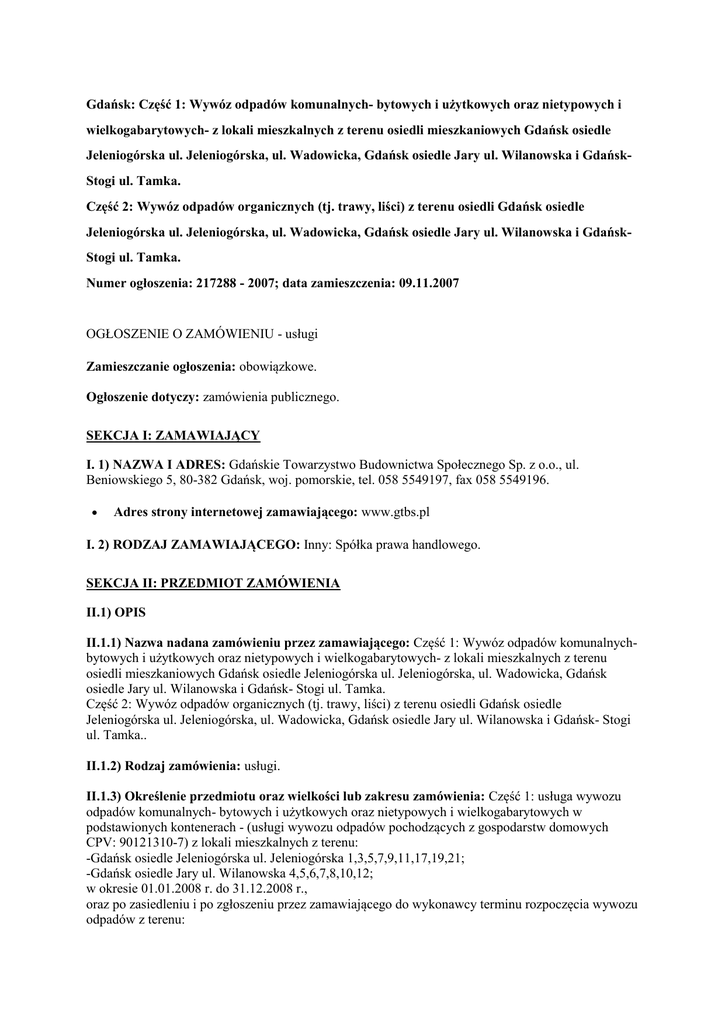 Gdańsk: Część 1: Wywóz odpadów komunalnych- bytowych i użytkowych oraz nietypowych i wielkogabarytowych- z lokali mieszkalnych z terenu osiedli mieszkaniowych Gdańsk osiedle Jeleniogórska ul. Jeleniogórska, ul. Wadowicka, Gdańsk osiedle Jary ul. Wilanowska i GdańskStogi ul. Tamka. Część 2: Wywóz odpadów organicznych (tj. trawy, liści) z terenu osiedli Gdańsk osiedle Jeleniogórska ul. Jeleniogórska, ul. Wadowicka, Gdańsk osiedle Jary ul. Wilanowska i GdańskStogi ul. Tamka. Numer ogłoszenia: 217288 - 2007; data zamieszczenia: 09.11.2007 OGŁOSZENIE O ZAMÓWIENIU - usługi Zamieszczanie ogłoszenia: obowiązkowe. Ogłoszenie dotyczy: zamówienia publicznego. SEKCJA I: ZAMAWIAJĄCY I. 1) NAZWA I ADRES: Gdańskie Towarzystwo Budownictwa Społecznego Sp. z o.o., ul. Beniowskiego 5, 80-382 Gdańsk, woj. pomorskie, tel. 058 5549197, fax 058 5549196. Adres strony internetowej zamawiającego: www.gtbs.pl I. 2) RODZAJ ZAMAWIAJĄCEGO: Inny: Spółka prawa handlowego. SEKCJA II: PRZEDMIOT ZAMÓWIENIA II.1) OPIS II.1.1) Nazwa nadana zamówieniu przez zamawiającego: Część 1: Wywóz odpadów komunalnychbytowych i użytkowych oraz nietypowych i wielkogabarytowych- z lokali mieszkalnych z terenu osiedli mieszkaniowych Gdańsk osiedle Jeleniogórska ul. Jeleniogórska, ul. Wadowicka, Gdańsk osiedle Jary ul. Wilanowska i Gdańsk- Stogi ul. Tamka. Część 2: Wywóz odpadów organicznych (tj. trawy, liści) z terenu osiedli Gdańsk osiedle Jeleniogórska ul. Jeleniogórska, ul. Wadowicka, Gdańsk osiedle Jary ul. Wilanowska i Gdańsk- Stogi ul. Tamka.. II.1.2) Rodzaj zamówienia: usługi. II.1.3) Określenie przedmiotu oraz wielkości lub zakresu zamówienia: Część 1: usługa wywozu odpadów komunalnych- bytowych i użytkowych oraz nietypowych i wielkogabarytowych w podstawionych kontenerach - (usługi wywozu odpadów pochodzących z gospodarstw domowych CPV: 90121310-7) z lokali mieszkalnych z terenu: -Gdańsk osiedle Jeleniogórska ul. Jeleniogórska 1,3,5,7,9,11,17,19,21; -Gdańsk osiedle Jary ul. Wilanowska 4,5,6,7,8,10,12; w okresie 01.01.2008 r. do 31.12.2008 r., oraz po zasiedleniu i po zgłoszeniu przez zamawiającego do wykonawcy terminu rozpoczęcia wywozu odpadów z terenu: - Gdańsk osiedle Jeleniogórska ul. Wadowicka 1- planowany termin zasiedlenia styczeń 2008 r.; - Gdańsk osiedle Jeleniogórska ul. Wadowicka 3- planowany termin zasiedlenia czerwiec 2008 r.; - Gdańsk osiedle Jeleniogórska ul. Jeleniogórska (budynki nr 23 i 24) planowany termin zasiedlenia lipiec 2008 r.; - Gdańsk- Stogi ul. Tamka 8- planowany termin zasiedlenia kwiecień 2008 r.; - Gdańsk- Stogi ul Tamka 10- planowany termin zasiedlenia styczeń 2008 r. Liczba mieszkań w zasobach GTBS oraz szacunkowa ilość osób: Osiedle Jeleniogórska: - Budynek nr 1- ul. Jeleniogórska 1-liczba mieszkań 60- 224 osób, - Budynek nr 2- ul. Jeleniogórska 3- liczba mieszkań 88- 215 osób, - Budynek nr 3- ul. Jeleniogórska 5- liczba mieszkań 102-299 osoby, - Budynek nr 4- ul. Jeleniogórska 7- liczba mieszkań 32-90 osób, - Budynek nr 5- ul. Jeleniogórska 9- liczba mieszkań 32-91 osób, - Budynek nr 6- ul. Jeleniogórska 11- liczba mieszkań 28-88 osób, - Budynek nr 7- ul. Jeleniogórska 17-liczba mieszkań 28- 51 osób, - Budynek nr 8- ul. Jeleniogórska 19- liczba mieszkań 28- 102 osób, - Budynek nr 9- ul. Jeleniogórska 21-liczba mieszkań 32-91 osób. Osiedle Jary: - Budynki nr 1 i 2- ul. Wilanowska 10- liczba mieszkań 123- 349 osób, - Budynek nr 3- ul. Wilanowska 4- liczba mieszkań 52- 186 osób, - Budynek nr 4- ul. Wilanowska 4- liczba mieszkań 39- 85 osób, - Budynek nr 5- ul. Wilanowska 4- liczba mieszkań 52- 112 osób, - Budynek nr 6- ul. Wilanowska 8- liczba mieszkań 36- 100 osób, - Budynek nr 7- ul. Wilanowska 6- liczba mieszkań 36- 100 osób, - Budynek nr 8- ul. Wilanowska 12- liczba mieszkań 79- 148 osób. - Budynek nr 9- ul. Wilanowska 7- liczba mieszkań 35- 112 osób, - Budynek nr10- ul. Wilanowska 5- liczba mieszkań 48- 149 osób. Razem: Lokale mieszkalne- 930, Szacunkowa liczba osób- 2592. Liczba mieszkań w budynkach GTBS w budowie oraz szacunkowa ilość osób: Osiedle Jeleniogórska: - Budynek nr 23- ul. Jeleniogórska- liczba mieszkań 36- 100 osób. - Budynek nr 24- ul. Jeleniogórska- liczba mieszkań 36- 100 osób. - Budynek nr 29- ul. Wadowicka 3- liczba mieszkań 36- 100 osób. - Budynek nr 30- ul. Wadowicka 1- liczba mieszkań 36- 100 osób. Gdańsk- Stogi ul. Tamka 8 i 10: - Budynek nr 101- ul. Tamka 8- liczba mieszkań 52- 145 osób. - Budynek nr 102- ul. Tamka 10- liczba mieszkań 36- 100 osób. Razem: Lokale mieszkalne- 232, Szacunkowa liczba osób- 645. Część 2: usługa wywozu odpadów organicznych tj. trawy, liści itp. (usługi transportu odpadów CPV: 90121200-3) z terenu osiedli Gdańsk osiedle Jeleniogórska ul. Jeleniogórska i ul. Wadowicka, Gdańsk osiedle Jary ul. Wilanowska i Gdańsk- Stogi ul. Tamka w podstawionych kontenerach w okresie 01.01.2008 r. do 31.12.2008 r. Wykonawca zobowiązany jest po telefonicznym zgłoszeniu przez pracownika Zamawiającego, do podstawienia kontenera o pojemności 7m3 w wskazane miejsce oraz do jego wywozu nie później niż 24 godziny po jego podstawieniu. Szacunkowa liczba zamawianych kontenerów- 50. Szczegółowy zakres praw i obowiązków związanych z realizacją zamówienia określa wzór umowy: załącznik nr 3 do SIWZ- część 1 zamówienia, załącznik nr 4 do SIWZ- część 2 zamówienia. II.1.4) Wspólny Słownik Zamówień (CPV): 90.12.13.10-7, 90.12.12.00-3. II.1.5) Czy dopuszcza się złożenie oferty częściowej: Tak, ilość części: 2. II.1.6) Czy dopuszcza się złożenie oferty wariantowej: Nie. II.2) CZAS TRWANIA ZAMÓWIENIA LUB TERMIN WYKONANIA: data zakończenia: 31.12.2008. SEKCJA III: INFORMACJE O CHARAKTERZE PRAWNYM, EKONOMICZNYM, FINANSOWYM I TECHNICZNYM III.1) WARUNKI DOTYCZĄCE ZAMÓWIENIA Informacja na temat wadium: nie wymagane. III.2) WARUNKI UDZIAŁU Opis warunków udzia