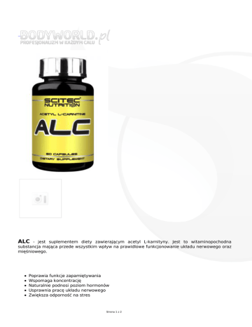 ALC - jest suplementem diety zawierającym acetyl L-karnityny. Jest to witaminopochodna substancja mająca przede wszystkim wpływ na prawidlowe funkcjonowanie układu nerwowego oraz mięśniowego. Poprawia funkcje zapamiętywania Wspomaga koncentrację Naturalnie podnosi poziom hormonów Usprawnia pracę układu nerwowego Zwiększa odporność na stres Strona 1 z 2 ALC dostarcza organizmowi grup acetylowych potrzebnych do produkcji acetylocholiny. Acetylocholina to bardzo ważny neurotransmiter w układzie nerwowym. Zwiazek ten co ważne silnie oddziałuje na wydzielanie dopaminy, neuroprzekaźnika, który jest odpowiedzialny za procesy myślowe, nastrój, a także odporność na stres. Utrzymuje ponadto prawidłową aktywność NGF, czynnika odpowiedzialnego za prawidłowe funkcjonowanie wszystkich neuronów. Scitec ALC wykazuje bezpośredni wpływ na funkjonowanie wszelakich przemian energetycznych w naszych komórkach nerwowych. Acetylokarnityna zwiększa ilość przekaźników nerwowych acetylocholiny, co ma bezpośrednie przełożenie na poprawę procesu zapamiętywania. Jednocześnie ma pozytywny wpływ na hamowanie procesu uszkodzeń hipokampa, czyli najważniejszej częsci mózgu, która odpowiedzialna jest za przesyłanie świeżo zapamiętanych informacji trafiajacych do kory mózgowej w której to ulegają utrwaleniu. Niekorzystne procesy dotyczące hipokampa nasilają się z wiekiem oraz w warynkach dużego stresu. Niski poziom ALC może korelować ze znacznie zwiększoną podatnością na depresje, gdyż acetyl L-karnityna oddziałuje bardzo wszechstronnie na produkcję dopaminy. Ten neuroprzekaźnik warunkuje doskonały nastrój oraz samopoczucie. ALC pobudza wydzielanie tego neuroprzekaźnika przez neurony do usprawnia jej łączenie z komórkami. Kolejną pozytywną funkcją ALC jest pozystywny wpływ na odchudzanie. Między innymi dostarcza L-karnityny, kluczowego związku, kótry jest odpowiedzialny za proces transportu oraz spalania kwasów tłuszczowych w naszym organiźmie. Co więcej Scitec ALC dostarcza grup acetylowych do kondensacji octanów, jest to bardzo ważny etap syntezy testosteronu, dlatego też, zalecany jest on jako dodatkowy suplement w cyklach anabolicznych razem z tribulusami czy ZMA. Scitec ALC a dokładnie acetylowy ester L-karnityny, podnosi naturalny poziom testosteronu (wpływ anaboliczny) oraz zmniejsza wysoki poziom kortyzolu (wpływ antykataboliczny). Scitec ALC jest szczególnie zalecany osobom aktywnym umysłowo i fizycznie oraz osobom w podeszłym wieku. Strona 2 z 2