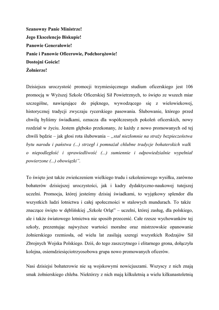 Szanowny Panie Ministrze! Jego Ekscelencjo Biskupie! Panowie Generałowie! Panie i Panowie Oficerowie, Podchorążowie! Dostojni Goście! Żołnierze! Dzisiejsza uroczystość promocji trzymiesięcznego studium oficerskiego jest 106 promocją w Wyższej Szkole Oficerskiej Sił Powietrznych, to święto ze wszech miar szczególne, nawiązujące do pięknego, wywodzącego się z wielowiekowej, historycznej tradycji zwyczaju rycerskiego pasowania. Ślubowanie, którego przed chwilą byliśmy świadkami, oznacza dla współczesnych pokoleń oficerskich, nowy rozdział w życiu. Jestem głęboko przekonany, że każdy z nowo promowanych od tej chwili będzie – jak głosi rota ślubowania – „stał niezłomnie na straży bezpieczeństwa bytu narodu i państwa (...) strzegł i pomnażał chlubne tradycje bohaterskich walk o niepodległość i sprawiedliwość (...) sumiennie i odpowiedzialnie wypełniał powierzone (...) obowiązki”. To święto jest także zwieńczeniem wielkiego trudu i szkoleniowego wysiłku, zarówno bohaterów dzisiejszej uroczystości, jak i kadry dydaktyczno-naukowej tutejszej uczelni. Promocja, której jesteśmy dzisiaj świadkami, to wyjątkowy splendor dla wszystkich ludzi lotnictwa i całej społeczności w stalowych mundurach. To także znaczące święto w dęblińskiej „Szkole Orląt” – uczelni, której zasług, dla polskiego, ale i także światowego lotnictwa nie sposób przecenić. Całe rzesze wychowanków tej szkoły, prezentując najwyższe wartości moralne oraz mistrzowskie opanowanie żołnierskiego rzemiosła, od wielu lat zasilają szeregi wszystkich Rodzajów Sił Zbrojnych Wojska Polskiego. Dziś, do tego zaszczytnego i elitarnego grona, dołączyła kolejna, osiemdziesięciotrzyosobowa grupa nowo promowanych oficerów. Nasi dzisiejsi bohaterowie nie są wojskowymi nowicjuszami. Wszyscy z nich znają smak żołnierskiego chleba. Niektórzy z nich mają kilkuletnią a wielu kilkunastoletnią zawodową służbę wojskową w korpusie podoficerskim. Ich wspólną cechą jest to, że nie spoczęli na przysłowiowych laurach, ale stale podnosili swoje kwalifikacje zawodowe osiągając w końcu to o czym marzyli – pierwsze gwiazdki oficerskie. Wybrali niezwykle trudną, ale i piękną w swojej wymowie drogę życiową - zostali oficerami Wojska Polskiego w zaszczytnej służbie naszej Ojczyźnie. To odpowiedzialny i odważny krok w przyszłość, bowiem zawód żołnierza wymaga szczególnego hartu ducha, niezliczonych poświęceń i wyrzeczeń. To zawód dla wybrańców, których z jednej strony - nobilitują dokonania historii, a z drugiej określają wyzwania przyszłości. Mam nieodparte przekonanie, że wszyscy nasi absolwenci sprostają stawianym im zadaniom i oczekiwaniom - udowadnia to ich dotychczasowa postawa życiowa, zaangażowanie w zdobywaniu i pogłębianiu wiedzy oraz nabyte już zawodowe doświadczenie. Głęboko też wierzę, iż wszyscy nasi nowi oficerowie będąc spadkobiercami pięknych oficerskich i lotniczych tradycji staną się też ich godnymi kontynuatorami, kreując przy tym nowe wzory i postawy. Cóż można więcej powiedzieć nowo promowanym na progu ich zapewne wieloletniej służby oficerskiej. Mogę jedynie powtórzyć głęboką i mądrą myśl za jednym z największych umysłów ubiegłego wieku wielkim uczonym Albertem Einsteinem: „Głównym powołaniem człowieka jest raczej służyć, niż zmuszać do posłuchu” Dostojni Goście! Panie i Panowie Oficerowie! Siły Powietrzne są w trakcie przeobrażeń organizacyjnych i strukturalnych zmiany swojego oblicza, wśród których nadal priorytetem są prace wdrożeniowe i szkoleniowe wielozadaniowego samolotu bojowego i innych statków powietrznych. Czekają nas wkrótce nie mniej poważne zadania związane z pozyskaniem nowych przeciwlotniczych systemów rakietowych średniego i dalekiego zasięgu. Podobne wyzwania stoją także przed pozostałymi rodzajami sił zbrojnych, do których trafi trzydziestu dziewięciu dzisiejszych absolwentów. Jednostki do których otrzymaliście przydział, już na Was czekają, planując efektywnie wykorzystać zdobyte przez Was umiejętności. Szanowni Państwo! Dzisiejsza uroczystość to powód do dumy i satysfakcji nie tylko dla tegorocznych absolwentów. To także znakomita sposobność, aby podziękować współtwórcom tego sukcesu. Dlatego dziękuję Komendzie Wyższej Szkoły Oficerskiej Sił Powietrznych i Senatowi uczelni, wdzięczny jestem także nauczycielom akademickim i instruktorom, a także dowódcom wszystkich szczebli bez Waszego wysiłku niemożliwa byłaby realizacja marzeń o szlifach oficerskich stojących przed nami nowo promowanych oficerów. Wszystkim razem i każdemu z osobna składam za to najlepsze podziękowania. Radość z dzisiejszego święta szczególnie mocno przeżywają najbliżsi naszych nowo promowanych oficerów – dziękuje im za wytrwałość i wspieranie dążeń naszych dzisiejszych bohaterów. Pani i Panowie oficerowie – drodzy Absolwenci! Przed Wami ciekawy, ale i trudny okres pracy i zmagań na pierwszych samodzielnych stanowiskach oficerskich w jednostkach wojskowych. Dlatego życzę Wam wytrwałości w osiąganiu zawodowych celów i realizacji żołnierskich marzeń, samych sukcesów i kolejnych gwiazdek oficerskich, a przy tym nieustającego zdrowia i poczucia satysfakcji z wybranej drogi. Niech spełniają się Wam wszelkie marzenia i nie omija Was szczęście i pomyślność w życiu osobistym. Odnosząc się z szacunkiem do całego Waszego dorobku, gratuluję dotychczasowych osiągnięć, życząc zarazem by dalsza służba stanowiła źródło niekończącej się satysfakcji i pomyślności. Dziękuję za uwagę.