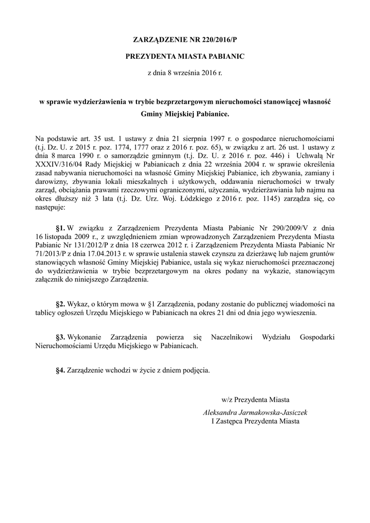 ZARZĄDZENIE NR 220/2016/P PREZYDENTA MIASTA PABIANIC z dnia 8 września 2016 r. w sprawie wydzierżawienia w trybie bezprzetargowym nieruchomości stanowiącej własność Gminy Miejskiej Pabianice. Na podstawie art. 35 ust. 1 ustawy z dnia 21 sierpnia 1997 r. o gospodarce nieruchomościami (t.j. Dz. U. z 2015 r. poz. 1774, 1777 oraz z 2016 r. poz. 65), w związku z art. 26 ust. 1 ustawy z dnia 8 marca 1990 r. o samorządzie gminnym (t.j. Dz. U. z 2016 r. poz. 446) i Uchwałą Nr XXXIV/316/04 Rady Miejskiej w Pabianicach z dnia 22 września 2004 r. w sprawie określenia zasad nabywania nieruchomości na własność Gminy Miejskiej Pabianice, ich zbywania, zamiany i darowizny, zbywania lokali mieszkalnych i użytkowych, oddawania nieruchomości w trwały zarząd, obciążania prawami rzeczowymi ograniczonymi, użyczania, wydzierżawiania lub najmu na okres dłuższy niż 3 lata (t.j. Dz. Urz. Woj. Łódzkiego z 2016 r. poz. 1145) zarządza się, co następuje: §1. W związku z Zarządzeniem Prezydenta Miasta Pabianic Nr 290/2009/V z dnia 16 listopada 2009 r., z uwzględnieniem zmian wprowadzonych Zarządzeniem Prezydenta Miasta Pabianic Nr 131/2012/P z dnia 18 czerwca 2012 r. i Zarządzeniem Prezydenta Miasta Pabianic Nr 71/2013/P z dnia 17.04.2013 r. w sprawie ustalenia stawek czynszu za dzierżawę lub najem gruntów stanowiących własność Gminy Miejskiej Pabianice, ustala się wykaz nieruchomości przeznaczonej do wydzierżawienia w trybie bezprzetargowym na okres podany na wykazie, stanowiącym załącznik do niniejszego Zarządzenia. §2. Wykaz, o którym mowa w §1 Zarządzenia, podany zostanie do publicznej wiadomości na tablicy ogłoszeń Urzędu Miejskiego w Pabianicach na okres 21 dni od dnia jego wywieszenia. §3. Wykonanie Zarządzenia powierza się Nieruchomościami Urzędu Miejskiego w Pabianicach. Naczelnikowi Wydziału Gospodarki §4. Zarządzenie wchodzi w życie z dniem podjęcia. w/z Prezydenta Miasta Aleksandra Jarmakowska-Jasiczek I Zastępca Prezydenta Miasta