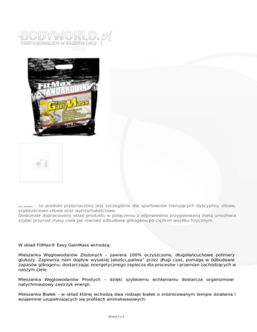 - to produkt przeznaczony jest szczególnie dla sportowców trenujących dyscypliny siłowe, szybkościowo-siłowe oraz wytrzymałościowe. Doskonale dopracowany skład produktu w połączeniu z odpowiednio przygotowaną dietą umożliwia szybki przyrost masy ciała jak również odbudowę glikogenu po ciężkim wysiłku fizycznym. Easy GainMass W skład FitMax® Easy GainMass wchodzą: Mieszanka Węglowodanów Złożonych – zawiera 100% oczyszczone, długołańcuchowe polimery glukozy. Zapewnia nam dopływ wysokiej jakości„paliwa” przez długi czas, pomaga w odbudowie zapasów glikogenu; dostarczając energetycznego zaplecza dla procesów i przemian zachodzących w naszym ciele. Mieszanka Węglowodanów Prostych – dzięki szybkiemu wchłanianiu dostarcza organizmowi natychmiastowy zastrzyk energii. Mieszanka Białek – w skład której wchodzą dwa rodzaje białek o zróżnicowanym tempie działania i wzajemnie uzupełniających się profilach aminokwasowych: Strona 1 z 3 4000 mg L-GLUTAMINY, 4000 mg KREATYNY I 1000 mg TAURYNY W PORCJI MIESZANKA WYSOKIEJ JAKOŚCI IZOLATU I KONCENTRATU BIAŁEK SERWATKI WZBOGACONY O IDEALNY ZESTAW NIEZBĘDNYCH MINERAŁÓW I WITAMIN POBUDZA ORGANIZM DO PRZYROSTU CZYSTEJ MASY MIĘŚNIOWEJ Ultrafiltrowany Koncentrat Białka Serwatkowego - bardzo łatwo przyswajalny; wchłania się z przewodu pokarmowego w zaledwie kilkanaście minut, posiada szeroki profil aminokwasowy oraz wysoką wartość biologiczną. Ultra i Mikrofiltrowany Izolat Białka Serwatkowego – czas wchłaniania rzędu kilku minut, charakteryzuje się najwyższą wartość biologiczną; idealny w dietach masowych w celu uzyskania odpowiedniej masy miesniowej umożliwiający natychmiastowe dostraczenie odpowiedniego składu aminokwasów naszemu organizmowi. Mikronizowany Monohydrat Kreatyny - wpływa na szereg czynników dotyczących naszego organizmu: Bierze udział w transporcie i odbudowie ATP – ATP pełni funkcję nośnika energii w naszym organizmie, bez niego przebieg większości reakcji, poczynając od prostych syntez po skurcz mięśnia, byłby niemożliwy. Kreatyna dzięki umiejętności wiązania grup fosforanowych (przemienia się wtedy w fosfokreatynę) uczestniczy w transporcie i odbudowie ATP. Zwiększa tempo syntezy protein – dzięki zwiększeniu ilości wody zatrzymywanej w komórkach mięśniowych przyczynia się do powstania bardziej anabolicznego (sprzyjającego wzrostowi) środowiska. Hamuje katabolizm – dzięki swoim zdolnościom buforującym pomaga w utrzymaniu odpowiedniego poziomu pH w mięśniach. Jest to o tyle istotne, że większość enzymów, odpowiedzialnych za rozpad tkanki mięśniowej może działać tylko w bardzo kwaśnym środowisku. Wykazuje właściwości antyoksydacyjne – pomaga zwalczyć, niebezpieczne dla zdrowia, wolne rodniki. Dodatkowo zapobiega szeregowi szkodliwych efektów powstających z powodu utleniania podczas wysiłku Pomaga chronić serce – zarówno w sposób bezpośredni, ponieważ w sercu znajduje się duże stężenie kreatyny, jak i pośrednio poprzez regulowanie poziomu cholesterolu i ochronę przed skutkami nadmiernego stresu. L-Glutamina - najpowszechniej występujący w organizmie aminokwas, pełniący szereg bardzo ważnych funkcji: wpływa na proces uzupełniania glikogenu, poprzez zwiększenie tempa jego syntezy w wątrobie, jak również przez bezpośrednią konwersje do glukozy, wpływa pozytywnie na tempo syntezy białek oraz ogranicza ich rozpad, wzmacnia system odpornościowy i przeciwdziała chorobom, które mogłyby utrudnić trening, odgrywa ważną role w procesie transaminacji (umożliwia syntezę nowych aminokwasów); przekształcana jest w kwas glutaminowy stanowiący źródło energii dla tkanki nerwowej oraz pełni szereg innych, ważnych funkcji fizjologicznych. Mikronizowana L-Tauryna - pomaga w regulacji poziomu cukru we krwi, wykazuje działanie anty kataboliczne (ogranicza proces rozpadu białek), zwiększa stężenie azotu w organizmie oraz pomaga obniżyć poziom cholesterolu. Bardzo istotny jest fakt, że L-tauryna stymuluje Strona 2 z 3 trzustkę do wydzielania insuliny. Czyni to jednak w inny sposób niż glukoza, a tym samym zmniejsza ryzyko powstania insulino odporności, która prowadzi do rozwoju cukrzycy. Dzięki temu możemy cieszyć się wszystkimi zaletami insuliny – silnego anabolika – bez obawy o nasze zdrowie. FitMax® Easy GainMass został wzbogacony o idealny zestaw witamin i minerałów, które są niezbędne do prawidłowego funkcjonowania procesów metabolicznych. Strona 3 z 3