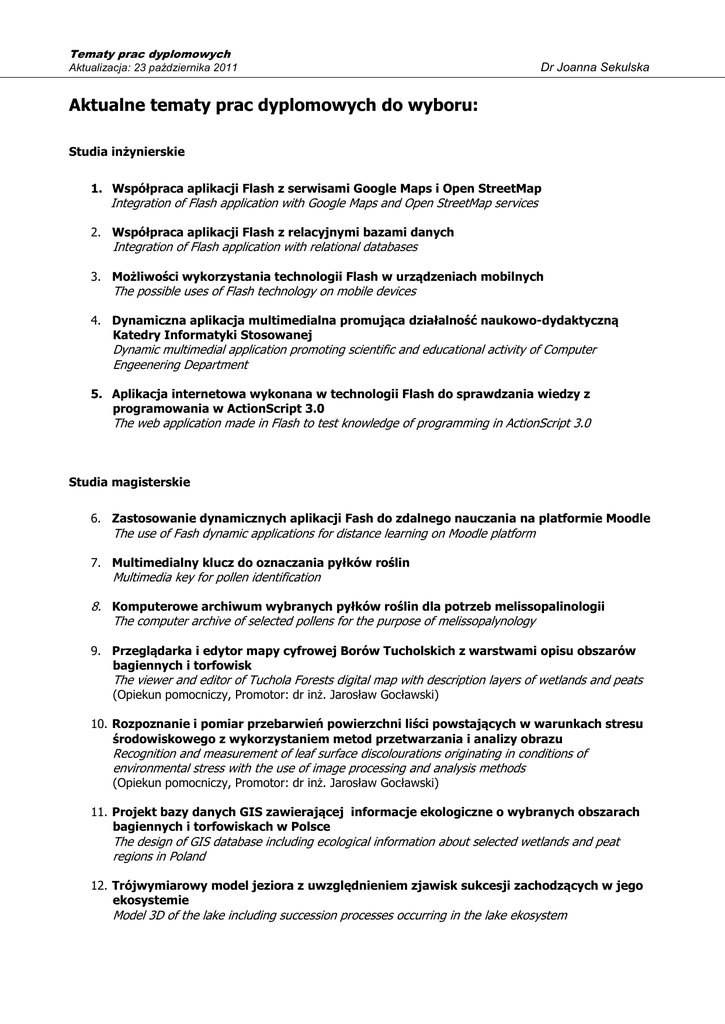 Tematy prac dyplomowych Aktualizacja: 23 października 2011 Dr Joanna Sekulska Aktualne tematy prac dyplomowych do wyboru: Studia inżynierskie 1. Współpraca aplikacji Flash z serwisami Google Maps i Open StreetMap Integration of Flash application with Google Maps and Open StreetMap services 2. Współpraca aplikacji Flash z relacyjnymi bazami danych Integration of Flash application with relational databases 3. Możliwości wykorzystania technologii Flash w urządzeniach mobilnych The possible uses of Flash technology on mobile devices 4. Dynamiczna aplikacja multimedialna promująca działalność naukowo-dydaktyczną Katedry Informatyki Stosowanej Dynamic multimedial application promoting scientific and educational activity of Computer Engeenering Department 5. Aplikacja internetowa wykonana w technologii Flash do sprawdzania wiedzy z programowania w ActionScript 3.0 The web application made in Flash to test knowledge of programming in ActionScript 3.0 Studia magisterskie 6. Zastosowanie dynamicznych aplikacji Fash do zdalnego nauczania na platformie Moodle The use of Fash dynamic applications for distance learning on Moodle platform 7. Multimedialny klucz do oznaczania pyłków roślin Multimedia key for pollen identification 8. Komputerowe archiwum wybranych pyłków roślin dla potrzeb melissopalinologii The computer archive of selected pollens for the purpose of melissopalynology 9. Przeglądarka i edytor mapy cyfrowej Borów Tucholskich z warstwami opisu obszarów bagiennych i torfowisk The viewer and editor of Tuchola Forests digital map with description layers of wetlands and peats (Opiekun pomocniczy, Promotor: dr inż. Jarosław Gocławski) 10. Rozpoznanie i pomiar przebarwień powierzchni liści powstających w warunkach stresu środowiskowego z wykorzystaniem metod przetwarzania i analizy obrazu Recognition and measurement of leaf surface discolourations originating in conditions of environmental stress with the use of image processing and analysis methods (Opiekun pomocniczy, Promotor: dr inż. Jarosław Gocławski) 11. Projekt bazy danych GIS zawierającej informacje ekologiczne o wybranych obszarach bagiennych i torfowiskach w Polsce The design of GIS database including ecological information about selected wetlands and peat regions in Poland 12. Trójwymiarowy model jeziora z uwzględnieniem zjawisk sukcesji zachodzących w jego ekosystemie Model 3D of the lake including succession processes occurring in the lake ekosystem Tematy prac dyplomowych Aktualizacja: 23 października 2011 Dr Joanna Sekulska 13. Półautomatyczna metoda pomiaru i archiwizacja wybranych cech teksturalnych okrzemek The semi-automatic measurement method and archiving of selected textural features of diatoms (Opiekun pomocniczy, Promotor: dr inż. Jarosław Gocławski) 14. Algorytm oceny ilościowej stopnia nekrozy liści dla określonych gatunków roślin The algorithm of necrosis level quantitative estimation for certain plant species (Opiekun pomocniczy, Promotor: dr inż. Jarosław Gocławski) Studia inżynierskie (starsze aktualne tematy) 15. Multimedialne materiały dydaktyczne wykonane techniką Flash (temat jest bardzo ogólny, należy sprecyzować przedmiot i zakres materiału, do którego przygotowane zostaną materiały dydaktyczne. Określić formę prezentacji i poznawania materiału – np. lekcje z częścią teoretyczną i praktycznymi ćwiczeniami, ewentualne dołączenie gier i quizów, itp.). Do wykorzystania narzędzia: XML, PHP, Flash, ActionScript 3.0, itp. 16. Wykorzystanie technik grafiki komputerowej do przygotowania multimedialnych materiałów promujących kierunki dokształcania w Katedrze Informatyki Stosowanej (treść materiałów dotyczących kursów i studiów podyplomowych należy opracować graficznie oraz odpowiednio dobrać technikę połączenia ich w formie jednej prezentacji multimedialnej – należy zastosować tu połączenie grafiki wektorowej, bitmapowej, filmów, muzyki, animacji i programowania w ActionScript 3.0. Koniecznie widziana jest osoba ze zmysłem plastycznym i znajomością obsługi programów graficznych, w tym Flash lub podobne, gdyż materiały są przygotowywane w celu ich faktycznego rozpowszechniania w miejscach publicznych, urzędach itp.). 17. Techniki tworzenia gier w technologii Flash Należy wykonać praktyczny projekt gry z zastosowaniem technik Flash. Konieczna jest umiejętność programowania (mile widziana w ActionScript). 18. Aplikacja do wyszukiwania pustych i pełnych komórek okrzemek w preparatach mikroskopowych (Opiekun pomocniczy, Promotor: dr inż. Radosław Wajman) 19. Zastosowanie analizy tekstur do rozpoznawania gatunków okrzemek (Opiekun pomocniczy, Promotor: dr inż. Radosław Wajman) 20. Multimedialny klucz do oznaczania i katalogowania organizmów jednokomórkowych Opiekun pomocniczy, Promotor: dr inż. Radosław Wajman) 21. Zastosowanie algorytmów szkieletyzacji do ekstrakcji charakterystycznych cech organizmów jednokomórkowych. Opiekun pomocniczy, Promotor: dr inż. Radosław Wajman) Studia magisterskie (starsze aktualne tematy) 22. Trójwymiarowa wizualizacja mikroorganizmów na przykładzie okrzemek Three-dimensional visualization of microorganisms based on the diatom example 23. Trójwymiarowa symulacja procesu zalewania terenów przyrzecznych podczas wezbrań rzeki Three-dimensional mode of simulation of flooding of neighbouring terrains during the river’s flood