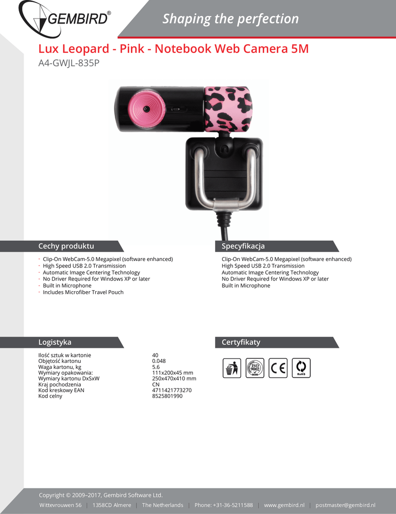 Lux Leopard - Pink - Notebook Web Camera 5M A4-GWJL-835P Cechy produktu Specyfikacja - Clip-On WebCam-5.0 Megapixel (software enhanced) High Speed USB 2.0 Transmission Automatic Image Centering Technology No Driver Required for Windows XP or later Built in Microphone Clip-On WebCam-5.0 Megapixel (software enhanced) High Speed USB 2.0 Transmission Automatic Image Centering Technology No Driver Required for Windows XP or later Built in Microphone Includes Microfiber Travel Pouch Logistyka Certyfikaty Ilość sztuk w kartonie Objętość kartonu Waga kartonu, kg Wymiary opakowania: Wymiary kartonu DxSxW Kraj pochodzenia Kod kreskowy EAN Kod celny 40 0.048 5.6 111x200x45 mm 250x470x410 mm CN 4711421773270 8525801990 Copyright © 2009–2017, Gembird Software Ltd. ! " # $ ! "
