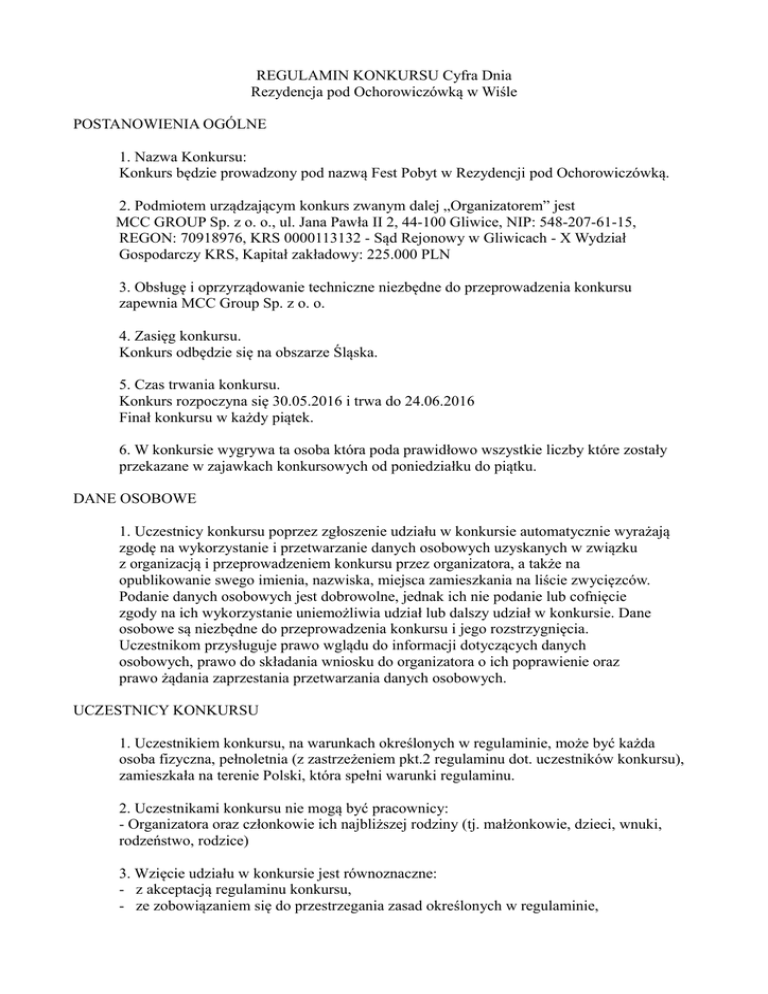 REGULAMIN KONKURSU Cyfra Dnia Rezydencja pod Ochorowiczówką w Wiśle POSTANOWIENIA OGÓLNE 1. Nazwa Konkursu: Konkurs będzie prowadzony pod nazwą Fest Pobyt w Rezydencji pod Ochorowiczówką. 2. Podmiotem urządzającym konkurs zwanym dalej „Organizatorem” jest MCC GROUP Sp. z o. o., ul. Jana Pawła II 2, 44-100 Gliwice, NIP: 548-207-61-15, REGON: 70918976, KRS 0000113132 - Sąd Rejonowy w Gliwicach - X Wydział Gospodarczy KRS, Kapitał zakładowy: 225.000 PLN 3. Obsługę i oprzyrządowanie techniczne niezbędne do przeprowadzenia konkursu zapewnia MCC Group Sp. z o. o. 4. Zasięg konkursu. Konkurs odbędzie się na obszarze Śląska. 5. Czas trwania konkursu. Konkurs rozpoczyna się 30.05.2016 i trwa do 24.06.2016 Finał konkursu w każdy piątek. 6. W konkursie wygrywa ta osoba która poda prawidłowo wszystkie liczby które zostały przekazane w zajawkach konkursowych od poniedziałku do piątku. DANE OSOBOWE 1. Uczestnicy konkursu poprzez zgłoszenie udziału w konkursie automatycznie wyrażają zgodę na wykorzystanie i przetwarzanie danych osobowych uzyskanych w związku z organizacją i przeprowadzeniem konkursu przez organizatora, a także na opublikowanie swego imienia, nazwiska, miejsca zamieszkania na liście zwycięzców. Podanie danych osobowych jest dobrowolne, jednak ich nie podanie lub cofnięcie zgody na ich wykorzystanie uniemożliwia udział lub dalszy udział w konkursie. Dane osobowe są niezbędne do przeprowadzenia konkursu i jego rozstrzygnięcia. Uczestnikom przysługuje prawo wglądu do informacji dotyczących danych osobowych, prawo do składania wniosku do organizatora o ich poprawienie oraz prawo żądania zaprzestania przetwarzania danych osobowych. UCZESTNICY KONKURSU 1. Uczestnikiem konkursu, na warunkach określonych w regulaminie, może być każda osoba fizyczna, pełnoletnia (z zastrzeżeniem pkt.2 regulaminu dot. uczestników konkursu), zamieszkała na terenie Polski, która spełni warunki regulaminu. 2. Uczestnikami konkursu nie mogą być pracownicy: - Organizatora oraz członkowie ich najbliższej rodziny (tj. małżonkowie, dzieci, wnuki, rodzeństwo, rodzice) 3. Wzięcie udziału w konkursie jest równoznaczne: - z akceptacją regulaminu konkursu, - ze zobowiązaniem się do przestrzegania zasad określonych w regulaminie, - z potwierdzeniem, że uczestnik spełnia wszystkie warunki niezbędne do wzięcia udziału w konkursie. KOMISJA KONKURSOWA 1. W celu zapewnienia prawidłowej organizacji i przebiegu konkursu, a w szczególności w celu dokonania oceny prawidłowości zgłoszeń do konkursu oraz dokonania wyboru zwycięzców konkursu, Organizator powoła 1 osobową Komisję Konkursową. W skład Komisji Konkursowej wejdzie osoba wytypowane przez Organizatora. PRZEBIEG KONKURSU 1. Konkurs rozpoczyna się 30.05.2016 i trwa do 24.06.2016 2. Finał konkursu w piątek. 3. Uczestnik zgłasza chęć wzięcia udziału w konkursie poprzez kontakt telefoniczny pod numer 32 775-22-22 . 4. Koszt połączenia telefonicznego według stawki danego operatora 5. W dniu rozstrzygnięcia konkursu Prezenter zadaje na antenie pytanie dotyczące rodzaju cyfr które zostały podane w danym tygodniu konkursu od poniedziałku do piątku. Czeka na kontakt telefoniczny słuchaczy. Ta osoba która jako pierwsza odpowie prawidłowo na zadane pytanie wygrywa nagrodę. Następnie zostanie poinformowana przez prezentera o warunkach odbioru nagrody. NAGRODY 1. Nagrodą w konkursie jest pobyt w Rezydencji pod Ochorowiczówką w Wiśle. 2. Pobyt o którym mowa w pkt. 1 obejmuje 2 noclegi ze śniadaniem dla 2 dwóch osób. 3. Zaproszenia nie będą obowiązywały: 24.06 – 31.08.2016. 4. Termin ważności zaproszenia 23.12.2016 r. . OGŁOSZENIE WYNIKÓW KONKURSU 1. Prezenter powiadomi zwycięzcę Konkursu o przyznaniu nagrody podczas kontaktu telefonicznego. Prezenter poinformuje także zwycięzcę o warunkach odbioru nagrody oraz poprosi o podanie danych, tj. imienia, nazwiska, telefonu kontaktowego. ODBIÓR NAGRÓD I PODATEK 1. Nagrody zwycięzca może odebrać w Biurze Reklamy Radia Fest w Chorzowie, w ciągu 21 dni od daty wygrania. W przypadku nieodebrania nagrody w terminie, przejdzie ona na własność Organizatora lub zostanie przekazana Fundatorowi. 2. Zwycięzca nie może domagać się zamiany wygranej nagrody na inną ani wypłaty jej równowartości w pieniądzu. 3. Organizator nie ponosi odpowiedzialności z tytułu niedotrzymania warunków przekazanych nagród zawartych w zleceniu z dnia 18.05.2016 r. 4. Zwycięzca konkursu jest zobowiązany do dokonania wcześniejszej rezerwacji pobytu podając daty planowanego pobytu. Rezerwacja można dokonać wyłącznie poprzez kontakt telefoniczny lub poprzez email wyłącznie z recepcją Rezydencja Pod Ochorowiczówką (tel.: 535 918 918, [email protected]). 5. Rezerwacja pobytu jest możliwa wyłącznie w przypadku jeśli obiekt noclegowy posiada wolne miejsca noclegowe w podanym prze zwycięzcę konkursu terminie. 6. Po zarezerwowaniu pobytu przez zwycięzcę konkursu nie ma możliwości zmiany daty pobytu na inną. A w przypadku niepojawiania się zwycięzcy konkursu w ustalonym terminie nagroda przepada. 7. Zwycięzca konkursu i osoba towarzysząca zobowiązane są do zapoznania się i przestrzegania regulaminu pobytu w Rezydencji Pod Ochorowiczówką, który jest dostępny na stronie www.podochorowiczowka.pl lub w recepcji obiektu. POSTĘPOWANIE REKLAMACYJNE 1. Reklamacje mogą być zgłaszane przez uczestników konkursu od dnia rozpoczęcia konkursu, najpóźniej w ciągu 7 dni od daty wydania nagród. Reklamacje, które wpłyną po tym terminie nie będą uwzględniane, niezależnie od daty stempla pocztowego. 2. Reklamacje rozpatruje Komisja Konkursowa. Reklamacja powinna zawierać: imię, nazwisko, dokładny adres uczestnika, przyczynę reklamacji wraz z jej uzasadnieniem oraz podpis. Reklamacja powinna zostać przesłana listem poleconym na adres redakcji. 3. Reklamacje rozpatrywane będą w ciągu 7 dn