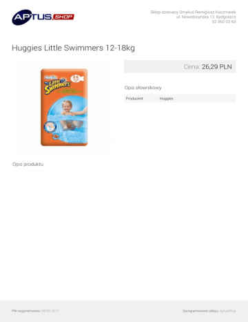 Sklep dziecięcy Smykuś Remigiusz Kaczmarek ul. Nowotoruńska 12, Bydgoszcz 52 362 02 63 Huggies Little Swimmers 12-18kg Cena: 26,29 PLN Opis słownikowy Producent Huggies Opis produktu Plik wygenerowano: 08-03-2017 Powered by TCPDF (www.tcpdf.org) Oprogramowanie sklepu: AptusShop