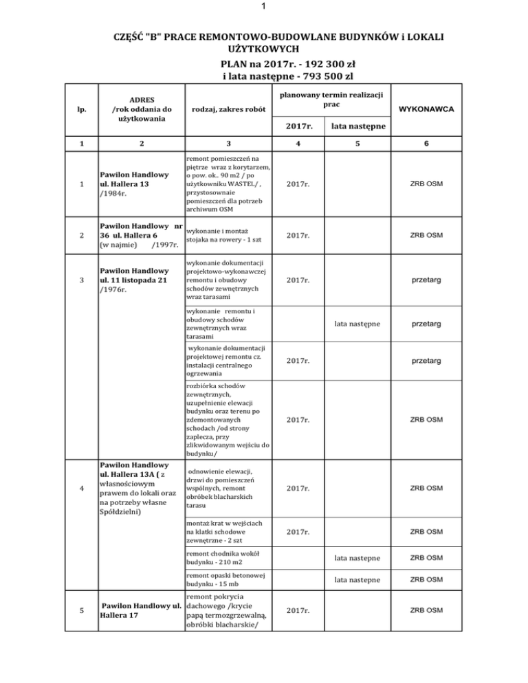 1 CZĘŚĆ "B" PRACE REMONTOWO-BUDOWLANE BUDYNKÓW i LOKALI UŻYTKOWYCH PLAN na 2017r. - 192 300 zł i lata następne - 793 500 zl lp. 1 ADRES /rok oddania do użytkowania rodzaj, zakres robót 2 planowany termin realizacji prac 2017r. lata następne 3 4 5 remont pomieszczeń na piętrze wraz z korytarzem, o pow. ok.. 90 m2 / po użytkowniku WASTEL/ , przystosownaie pomieszczeń dla potrzeb archiwum OSM 2017r. ZRB OSM 2017r. ZRB OSM 2017r. przetarg 1 Pawilon Handlowy ul. Hallera 13 /1984r. 2 Pawilon Handlowy nr wykonanie i montaż 36 ul. Hallera 6 stojaka na rowery - 1 szt (w najmie) /1997r. 3 Pawilon Handlowy ul. 11 listopada 21 /1976r. wykonanie dokumentacji projektowo-wykonawczej remontu i obudowy schodów zewnętrznych wraz tarasami wykonanie remontu i obudowy schodów zewnętrznych wraz tarasami 4 5 Pawilon Handlowy ul. Hallera 13A ( z własnościowym prawem do lokali oraz na potrzeby własne Spółdzielni) WYKONAWCA lata następne 6 przetarg wykonanie dokumentacji projektowej remontu cz. instalacji centralnego ogrzewania 2017r. przetarg rozbiórka schodów zewnętrznych, uzupełnienie elewacji budynku oraz terenu po zdemontowanych schodach /od strony zaplecza, przy zlikwidowanym wejściu do budynku/ 2017r. ZRB OSM odnowienie elewacji, drzwi do pomieszczeń wspólnych, remont obróbek blacharskich tarasu 2017r. ZRB OSM montaż krat w wejściach na klatki schodowe zewnętrzne - 2 szt 2017r. ZRB OSM remont chodnika wokół budynku - 210 m2 lata nastepne ZRB OSM remont opaski betonowej budynku - 15 mb lata nastepne ZRB OSM remont pokrycia Pawilon Handlowy ul. dachowego /krycie Hallera 17 papą termozgrzewalną, obróbki blacharskie/ 2017r. ZRB OSM 2 6 teren za Pawilonami Handlowymi ul. Hallera 15 i 17 7 Piłsudskiego 19/ część docieplenie cokołu użytkowa /apteka budynku remont nawierzchni z kostki betonowej utwardzenie placu płytami ekoażur - 50 m2 8 lata następne przetarg 2017r. ZRB OSM 2017r. przetarg Pawilon Handlowy remont nawierzchni placu ul. Dzieci Polskich 11 manewrowego - polożenie asfaltu ( w najmie) lata następne przetarg wykonanie chodnika z kostki polbruk wzdłuż szczytu pawilonu, od strony ul. Witosa lata następne przetarg odnowienie elewacji budynku lata następne ZRB OSM 9 Pawilon Handlowy ul. Goworowska 13A miejscowa naprawa elewacji - 2 m2 2017r. ZRB OSM 10 Pawilon Handlowy ul. Goworowska 24 miejscowy remont pokrycia dachu - krycie papą termozgrzewalna 2017r. ZRB OSM 11 utwardzenie placu od strony zaplecza - płytami ekoażur -95m2; remont nawierzchni asfaltowej 218m2; lata następne przetarg Zaplecze Zakładu Remontowobudynek nr 1 - portieria: Budowlanego OSM ul. docieplenie ścian - 41m2; Targowa 41 lata następne ZRB OSM lata następne ZRB OSM termomodernizacja budynku administracyjnosocjalnego -668,06m2 /docieplenie ścian styropianem , wymiana obrobek blacharskich, remont daszków wejściowych, remont opaski/ 3 4 5 6