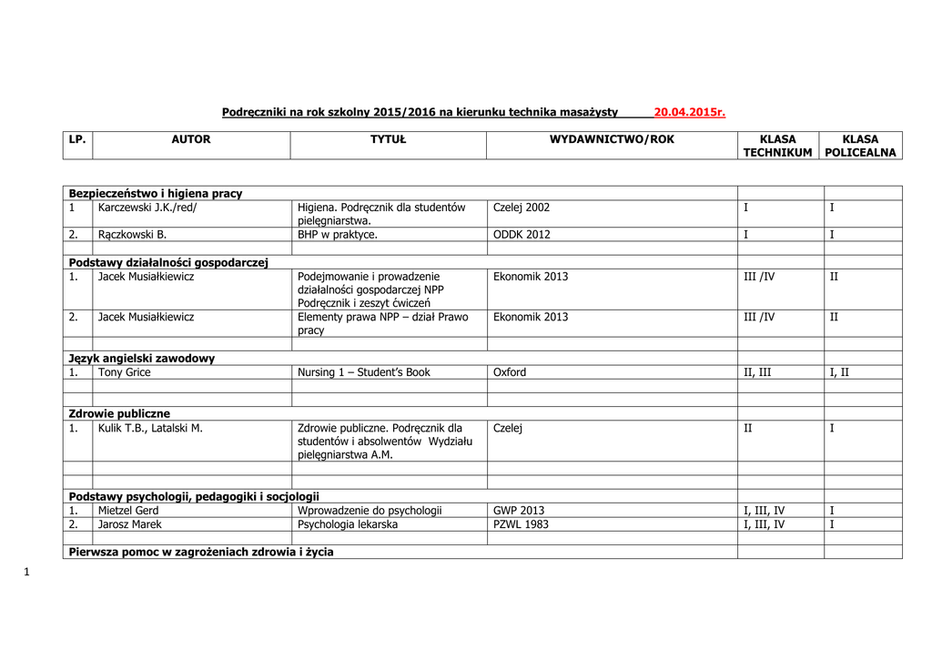 Podręczniki na rok szkolny 2015/2016 na kierunku technika masażysty LP. AUTOR Bezpieczeństwo i higiena pracy 1 Karczewski J.K./red/ 2. Rączkowski B. Podstawy działalności gospodarczej 1. Jacek Musiałkiewicz 2. Jacek Musiałkiewicz Język angielski zawodowy 1. Tony Grice Zdrowie publiczne 1. Kulik T.B., Latalski M. TYTUŁ WYDAWNICTWO/ROK KLASA TECHNIKUM KLASA POLICEALNA Higiena. Podręcznik dla studentów pielęgniarstwa. BHP w praktyce. Czelej 2002 I I ODDK 2012 I I Podejmowanie i prowadzenie działalności gospodarczej NPP Podręcznik i zeszyt ćwiczeń Elementy prawa NPP – dział Prawo pracy Ekonomik 2013 III /IV II Ekonomik 2013 III /IV II Nursing 1 – Student’s Book Oxford II, III I, II Zdrowie publiczne. Podręcznik dla studentów i absolwentów Wydziału pielęgniarstwa A.M. Czelej II I GWP 2013 PZWL 1983 I, III, IV I, III, IV I I Podstawy psychologii, pedagogiki i socjologii 1. Mietzel Gerd Wprowadzenie do psychologii 2. Jarosz Marek Psychologia lekarska Pierwsza pomoc w zagrożeniach zdrowia i życia 1 20.04.2015r. 1. Czapniewska Brygida 2. Scott H.Plantz E.John Wipfler 3. Mikołajczak Adam Organizacja ochrony zdrowia 1. Kulik T.B., Latalski M. Technologie informatyczne 1. Koba Grażyna Teoretyczne podstawy masażu 1. Adam Zborowski 2. Adam Zborowski 3. Adam Zborowski 4. Adam Zborowski 5. 7. Michael Földi, Roman Strößenreuther, red. wyd. pol. Marek Woźniewski Tadeusz Kasperczyk, Leszek Magiera, Dariusz Mucha, Robert Walaszek Zygmunt Prochowicz 8. Art Rigs 6. 9. Jacek Wierzbicki Anatomia z fizjologią 1. Elżbieta Suder, Szymon Brużewicz 2. 2 Aleksander Michajlik, Witold Ramotowski Pierwsza pomoc Medycyna ratunkowa Pierwsza pomoc ilustrowany poradnik Literatura 2013 Urban& Partner 2009 Publicat 2012 I I I I I I Zdrowie publiczne. Podręcznik dla studentów i absolwentów Wydziału pielęgniarstwa A.M. Czelej III I Informatyka dla szkół ponadgimnazjalnych. Zakres podstawowy. Migra II II Drenaż limfatyczny Masaż klasyczny Masaż segmentalny Masaż w wybranych jednostkach chorobowych cz. 1, 2, 3 Podstawy manualnego drenażu limfatycznego Masaż z elementami rehabilitacji Wydawnictwo Wydawnictwo Wydawnictwo Wydawnictwo Podstawy masażu leczniczego Masaż tkanek głębokich. Wizualny przewodnik po technikach Podstawy masażu Anatomia człowieka - podręcznik i atlas dla studentów licencjatów medycznych Anatomia i fizjologia człowieka AZ, AZ, AZ, AZ, Kraków Kraków Kraków Kraków 2008, 2008, 2007, 2010, wyd. wyd. wyd. wyd. 3 4 3 2 KL. KL. KL. KL. II, III I, II II, III II, III, IV II I, II II I, II Elsevier Urban & Partner, Wrocław 2005, wyd. 1 KL.II II REHMED, Kraków 2003, wyd. 1 KL.II, III I, II Wydawnictwo Lekarskie PZWL, Warszawa 2009, wyd. 5 2008, wyd. 1 KL. I I KL.IV II Petrus, Kraków 2013 KL.I I Górnicki Wydawnictwo Medyczne, Wrocław 2008, wyd. 2 I, II, III, IV I, II Wydawnictwo Lekarskie PZWL, Warszawa 2009, wyd. 5 I, II, III, IV I, II 3. Zofia Ignasiak 4. 5. Zofia Ignasiak Ludmiła Borodulin-Nadzieja 6. Władysław Traczyk 7. 8. R.L.Drake, A.W.Vogl E.Suder, Sz.Brużewicz 9. L.Borodulin-Nadzieja Zarys fizjoterapii 1. Wojciech Kasprzak, Tadeusz Mika Elsevier Urban & Partner, Wrocław 2008, wyd. 1 II, III, IV II Elsevier Urban & Partner, Wrocław 2007, wyd. 1 Górnicki Wydawnictwo Medyczne, Wrocław 2005, wyd. 1 Wydawnictwo Lekarskie PZWL, Warszawa 2005, wyd. 8 Elsevier Urban & Partner, Wrocław 2010 Górnicki Wydawnictwo Medyczne Wrocław I, II I, II, III, IV I I, II I, II, III, IV I, II I, II, III, IV I, II, III, IV I, II I, II Górnicki Wydawnictwo Medyczne Wrocław I, II, III, IV I, II Fizykoterapia Wydawnictwo PZWL KL.II Fizykoterapia, medycyna uzdrowiskowa i SPA Fizjoterapia z elementami klinicznymi tom 1-2 Podstawy fizjoterapii cz. 1 i 2 Wydawnictwo Lekarskie PZWL, Warszawa 2008, wyd. 1 Wydawnictwo Lekarskie PZWL, Warszawa 2008, wyd. 1 Kasper, Kraków 2004, wyd. 4 KL.II SEM. II, III, IV SEM. III, IV KL.II SEM. III, IV KL.II SEM.II, III, IV SEM.II, III, IV Anatomia Graya t. 1, 2, 3 Anatomia człowieka (podręcznik i atlas dla licencjatów medycznych) Fizjologia człowieka (podręcznik i atlas dla licencjatów medycznych) 2. Wojciech Kasprzak, Agata Mańkowska 3. 4. Gerard Straburzyński, Anna Straburzyńska-Lupa Janusz Nowotny 5. Stefan Kruś Patologia. Podręcznik dla licencjackich studiów medycznych KL Wydawnictwo Lekarskie PZWL, Warszawa 2003, wyd. 1 KL.II 6. K.Milanowska, W.Dega Rehabilitacja medyczna PZWL 2003 KL.II 7. T.Skolimowski AWF Wrocław 2012 KL.II 8. W.Kasprzak Badania czynnościowe narządu ruchu w fizjoterapii Fizjoterapia kliniczna PZWL 2010 KL.II 9. J,Z. Kilar, P. Lizis Wybrane zagadnienia kliniczne 3 Anatomia narządów wewnętrznych i układu nerwowego człowieka Anatomia układu ruchu Fizjologia człowieka - podręcznik dla studentów licencjatów medycznych Fizjologia człowieka w zarysie Leczenie ruchem Cz I Badanie narządu ruchu w rehabilitacji Wydawnictwo Kasper Kraków 1996 KL.II SEM.I ,II, III, IV SEM. I, II SEM. II, III, IV SEM.I ,II 1. T.Gaździk 2. Stefan Kruś Pracownia masażu 1. Adam Zborowski 2. Adam Zborowski 3. Adam Zborowski 4. Adam Zborowski 5. 6. 7. Michael Földi, Roman Strößenreuther, red. wyd. pol. Marek Woźniewski Zygmunt Prochowicz 8. Tadeusz Kasperczyk, Leszek Magiera, Dariusz Mucha, Robert Walaszek R.Pawelec, E.Szczuka, W.Laber 9. Wojciech Kasprzak, Agata Mańkowska 10. Zofia Ignasiak Wybrane zagadnienia z fizjoterapii 1. Wojciech Kasprzak, Tadeusz Mika 4 Ortopedia i traumatologia – podręcznik dla studentów Patologia. Podręcznik dla licencjackich studiów medycznych Wyd. PZWL II, III Wydawnictwo Lekarskie PZWL, Warszawa 2003, wyd. 1 II, III, IV Drenaż limfatyczny Masaż klasyczny Masaż segmentarny Masaż w wybranych jednostkach chorobowych cz. 1, 2, 3 Podstawy manualnego drenażu limfatycznego Podstawy masażu leczniczego Wydawnictwo Wydawnictwo Wydawnictwo Wydawnictwo KL.II KL.III KL.I KL.III KL.III, KLIV SEM. II, III SEM. I, II SEM. III, IV Elsevier Urban & Partner, Wrocław 2005, wyd. 