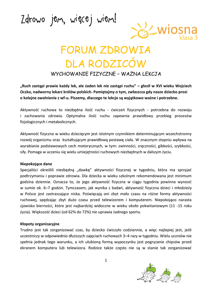 FORUM ZDROWIA DLA RODZICÓW WYCHOWANIE FIZYCZNE – WAŻNA LEKCJA „Ruch zastąpi prawie każdy lek, ale żaden lek nie zastąpi ruchu” – głosił w XVI wieku Wojciech Oczko, nadworny lekarz królów polskich. Pamiętajmy o tym, zwłaszcza gdy nasze dziecko prosi o kolejne zwolnienie z wf-u. Piszemy, dlaczego te lekcje są wyjątkowo ważne i potrzebne. Aktywność ruchowa to niezbędna ilość ruchu - ćwiczeń fizycznych - potrzebna do rozwoju i zachowania zdrowia. Optymalna ilość ruchu zapewnia prawidłowy przebieg procesów fizjologicznych i metabolicznych. Aktywność fizyczna w wieku dziecięcym jest istotnym czynnikiem determinującym wszechstronny rozwój organizmu oraz kształtującym prawidłową postawę ciała. W znacznym stopniu wpływa na wyrabianie podstawowych cech motorycznych, w tym: zwinności, zręczności, gibkości, szybkości, siły. Pomaga w uczeniu się wielu umiejętności ruchowych niezbędnych w dalszym życiu. Niepokojące dane Specjaliści określili niezbędną „dawkę” aktywności fizycznej w tygodniu, która ma sprzyjać podtrzymaniu i poprawie zdrowia. Dla dziecka w wieku szkolnym rekomendowana jest minimum godzina dziennie. Oznacza to, że jego aktywność fizyczna w ciągu tygodnia powinna wynosić w sumie ok. 6–7 godzin. Tymczasem, jak wynika z badań, aktywność fizyczna dzieci i młodzieży w Polsce jest zastraszająco niska. Poświęcają oni zbyt mało czasu na różne formy aktywności ruchowej, spędzając zbyt dużo czasu przed telewizorem i komputerem. Niepokojąco narasta zjawisko bierności, które jest najbardziej widoczne w wieku około pokwitaniowym (11 -15 roku życia). Większość dzieci (od 62% do 72%) nie uprawia żadnego sportu. Kłopoty organizacyjne Trudno jest tak zorganizować czas, by dziecko ćwiczyło codziennie, a więc najlepiej jest, jeśli uczestniczy w odpowiednio dłuższych zajęciach ruchowych 3–4 razy w tygodniu. Wielu uczniów nie spełnia jednak tego warunku, a ich ulubioną formą wypoczynku jest pogryzanie chipsów przed ekranem komputera lub telewizora. Rodzice także często nie są w stanie tak zorganizować 1 aktywności fizycznej dziecka, aby powyższy warunek spełnić. Z tego między innymi powodu warto docenić… szkolne lekcje wychowania fizycznego. WF – ważny i potrzebny WF w tygodniowym planie lekcji jest to ten czas, w którym dziecko na pewno będzie się ruszać, wykonywać różne ćwiczenia i zdobywać nowe umiejętności. Ruch jest potrzebny jak powietrze. Ćwicząc, dziecko przeżywa radość, rozładowuje napięcie i stres, uczy się radzić sobie z negatywnymi emocjami, odpoczywa od trudnych zadań matematycznych, językowych itp. Aplikując sobie taką „dawkę” zdrowia – hartuje organizm i adaptuje go do większego wysiłku fizycznego i umysłowego. Uwierzmy mądremu stwierdzeniu znanego lekarza, Wojciecha Oczki, który przekonywał, że „ruch zastąpi prawie każdy lek, ale żaden lek nie zastąpi ruchu”. Zwolnienie z WF-u Może zatem warto wcześniej się zastanowić, nim zaliczymy wychowanie fizyczne do grupy tzw. mało ważnych przedmiotów szkolnych i skorzystamy z przysługującego nam prawa napisania zwolnienia z lekcji wf-u (Rozporządzenie Ministra Edukacji Narodowej z 30 kwietnia 2007 r.), przychylając się do prośby naszej pociechy. Okazuje się bowiem, że z tego prawa rodzice korzystają dość chętnie. W wielu szkołach semestralne zwolnienie z lekcji wychowania fizycznego ma co czwarty uczeń, a wiele dzieci nie ćwiczy nawet przez cały rok szkolny. I nie wszystkie z tych zwolnień – nawet wystawionych przez lekarza – są uzasadnione. Niemało jest takich rodziców, którzy sami idą z dzieckiem do lekarza, by ten koniecznie „wyszukał” jakieś przeciwwskazanie do ćwiczeń. Niektórzy sami pozwalają dziecku na bierność, uznając, że lekcje wf-u, to strata czasu, który można przeznaczyć na zajęcia dodatkowe. Korepetycji można udzielić z matematyki czy angielskiego, ale braków zdrowotnych, które są wynikiem m.in. ruchowej „abstynencji”, nie da się szybko nadrobić. Pamiętajmy o tym, siadając nad kartką z długopisem w ręku, aby kolejny raz napisać zwolnienie z lekcji wf-u. Nie zapominajmy też, że te lekcje i ten nauczyciel zdejmują z nas część obowiązków wobec dziecka. Gdyby nie takie lekcje, musielibyśmy sami wypełnić mu kilka godzin w tygodniu różnorodnymi ćwiczeniami, głowiąc się jeszcze, co zrobić, żeby się nie nudziło. więcej na www.aktywniepozdrowie.pl 2