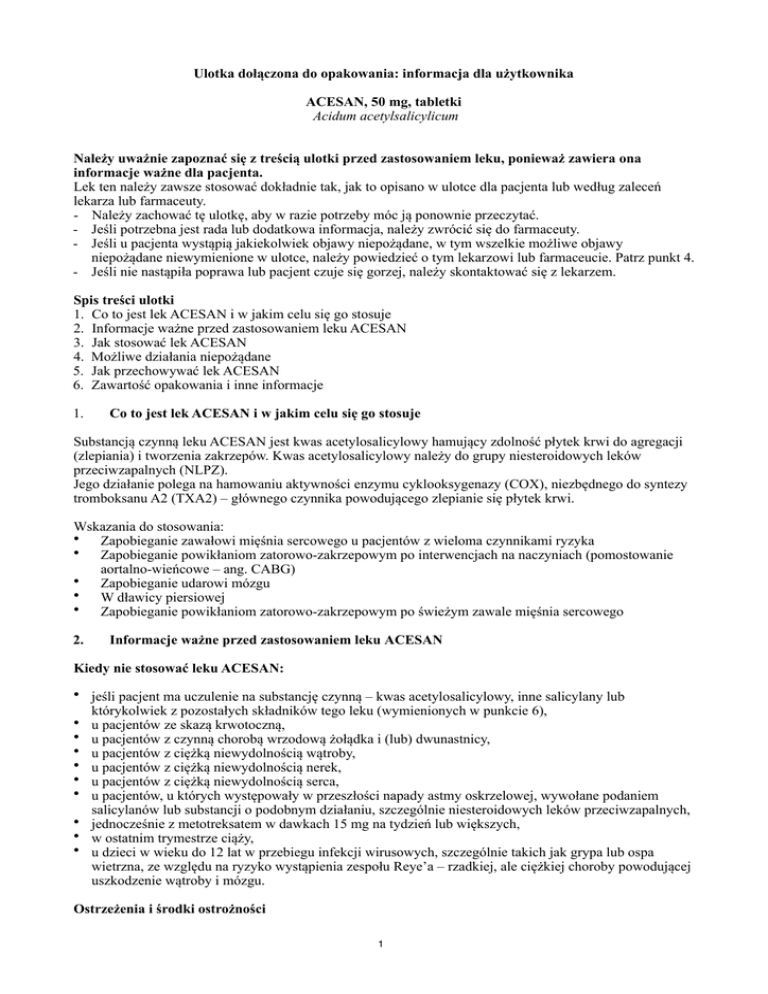 Ulotka dołączona do opakowania: informacja dla użytkownika ACESAN, 50 mg, tabletki Acidum acetylsalicylicum Należy uważnie zapoznać się z treścią ulotki przed zastosowaniem leku, ponieważ zawiera ona informacje ważne dla pacjenta. Lek ten należy zawsze stosować dokładnie tak, jak to opisano w ulotce dla pacjenta lub według zaleceń lekarza lub farmaceuty. - Należy zachować tę ulotkę, aby w razie potrzeby móc ją ponownie przeczytać. - Jeśli potrzebna jest rada lub dodatkowa informacja, należy zwrócić się do farmaceuty. - Jeśli u pacjenta wystąpią jakiekolwiek objawy niepożądane, w tym wszelkie możliwe objawy niepożądane niewymienione w ulotce, należy powiedzieć o tym lekarzowi lub farmaceucie. Patrz punkt 4. - Jeśli nie nastąpiła poprawa lub pacjent czuje się gorzej, należy skontaktować się z lekarzem. Spis treści ulotki 1. Co to jest lek ACESAN i w jakim celu się go stosuje 2. Informacje ważne przed zastosowaniem leku ACESAN 3. Jak stosować lek ACESAN 4. Możliwe działania niepożądane 5. Jak przechowywać lek ACESAN 6. Zawartość opakowania i inne informacje 1. Co to jest lek ACESAN i w jakim celu się go stosuje Substancją czynną leku ACESAN jest kwas acetylosalicylowy hamujący zdolność płytek krwi do agregacji (zlepiania) i tworzenia zakrzepów. Kwas acetylosalicylowy należy do grupy niesteroidowych leków przeciwzapalnych (NLPZ). Jego działanie polega na hamowaniu aktywności enzymu cyklooksygenazy (COX), niezbędnego do syntezy tromboksanu A2 (TXA2) – głównego czynnika powodującego zlepianie się płytek krwi. Wskazania do stosowania: • Zapobieganie zawałowi mięśnia sercowego u pacjentów z wieloma czynnikami ryzyka • Zapobieganie powikłaniom zatorowo-zakrzepowym po interwencjach na naczyniach (pomostowanie aortalno-wieńcowe – ang. CABG) • Zapobieganie udarowi mózgu • W dławicy piersiowej • Zapobieganie powikłaniom zatorowo-zakrzepowym po świeżym zawale mięśnia sercowego 2. Informacje ważne przed zastosowaniem leku ACESAN Kiedy nie stosować leku ACESAN: • jeśli pacjent ma uczulenie na substancję czynną – kwas acetylosalicylowy, inne salicylany lub którykolwiek z pozostałych składników tego leku (wymienionych w punkcie 6), • u pacjentów ze skazą krwotoczną, • u pacjentów z czynną chorobą wrzodową żołądka i (lub) dwunastnicy, • u pacjentów z ciężką niewydolnością wątroby, • u pacjentów z ciężką niewydolnością nerek, • u pacjentów z ciężką niewydolnością serca, • u pacjentów, u których występowały w przeszłości napady astmy oskrzelowej, wywołane podaniem salicylanów lub substancji o podobnym działaniu, szczególnie niesteroidowych leków przeciwzapalnych, • jednocześnie z metotreksatem w dawkach 15 mg na tydzień lub większych, • w ostatnim trymestrze ciąży, • u dzieci w wieku do 12 lat w przebiegu infekcji wirusowych, szczególnie takich jak grypa lub ospa wietrzna, ze względu na ryzyko wystąpienia zespołu Reye’a – rzadkiej, ale ciężkiej choroby powodującej uszkodzenie wątroby i mózgu. Ostrzeżenia i środki ostrożności 1 Przed rozpoczęciem stosowania leku ACESAN należy omówić to z lekarzem lub farmaceutą. Kwas acetylosalicylowy należy stosować ostrożnie: • w pierwszym i drugim trymestrze ciąży, • w okresie karmienia piersią, • w przypadku nadwrażliwości na niesteroidowe leki przeciwzapalne i przeciwreumatyczne lub inne substancje alergizujące, • podczas jednoczesnego stosowania leków przeciwzakrzepowych, • u pacjentów z zaburzoną czynnością nerek, • u pacjentów z zaburzoną czynnością wątroby, • u pacjentów, u których występowała w przeszłości choroba wrzodowa żołądka i (lub) dwunastnicy lub krwawienia z przewodu pokarmowego, • u pacjentów z niedoborem dehydrogenazy glukozo-6-fosforanowej, • przed planowanym zabiegiem chirurgicznym, ze względu na możliwość wystąpienia krwawienia. Leku Acesan nie należy stosować jako środka przeciwbólowego i przeciwgorączkowego. Kwas acetylosalicylowy może powodować skurcz oskrzeli i wywoływać napady astmy lub inne reakcje nadwrażliwości. Na takie reakcje szczególnie narażeni są pacjenci z astmą oskrzelową, przewlekłymi chorobami układu oddechowego, katarem siennym z polipami błony śluzowej nosa oraz u których występują reakcje alergiczne (np. reakcje skórne, świąd, pokrzywka) na inne substancje. Pacjenci przed zabiegami chirurgicznymi (włącznie z niewielkimi zabiegami, np. ekstrakcja zęba) powinni poinformować lekarza o przyjmowaniu leku ACESAN. Zazwyczaj zaleca się odstawienie leku na 5-7 dni przed planowanym zabiegiem chirurgicznym. Kwas acetylosalicylowy, nawet w małych dawkach, zmniejsza wydalanie kwasu moczowego z organizmu. U pacjentów ze skłonnością do zmniejszonego wydalania kwasu moczowego lek może wywołać napady dny moczanowej. Lek ACESAN a inne leki Należy powiedzieć lekarzowi lub farmaceucie o wszystkich lekach stosowanych przez pacjenta obecnie lub ostatnio, a także o lekach, które pacjent planuje stosować. Kwas acetylosalicylowy zwiększa: - działanie toksyczne metotreksatu na szpik kostny. Nie należy stosować kwasu acetylosalicylowego jednocześnie z metotreksatem stosowanym w dawkach 15 mg na tydzień lub większych; jednoczesne stosowanie metotreksatu w dawkach mniejszych niż 15 mg na tydzień wymaga zachowania szczególnej ostrożności; - działanie leków przeciwzakrzepowych (np. pochodne kumaryny, heparyna), leków trombolitycznych (rozpuszczających skrzeplinę, np. streptokinaza, urokinaza) i hamujących agregację (zlepianie) płytek krwi (np. tyklopidyna), co może powodować zwiększone ryzyko wydłużenia czasu krwawienia i krwotoków; - ryzyko wystąpienia choroby wrzodowej żołądka i (lub) dwunastnicy oraz krwawień z przewodu pokarmowego, jeśli jest stosowany jednocześnie z kortykosteroidami, innymi niesteroidowymi lekami przeciwzapalnymi, w t