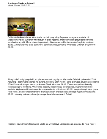 6. miejsce Śląska w Polsce! piątek, 22 maja 2015 17:52 Od 24 do 26 kwietnia we Wrocławiu, na hali przy ulicy Saperów rozegrana została 1/2 Mistrzostw Polski Juniorów Młodszych w piłce ręcznej. Pierwszy dzień przyniósł dobre dla wrocławian wyniki. Mecz otwarcia pomiędzy Warszawą, a Koninem zakończył się remisem 32:32. Z kolei zielono-biało-czerwoni, pokonali zdecydowanie Wybrzeże Gdańsk z wynikiem 29:22. Drugi dzień mógł przynieść już pierwsze rozstrzygnięcia. Wybrzeże Gdańsk pokonało 27:26 Agrykolę i zachowało szansę na awans. Niestety Start Konin - jako pierwsza drużyna w sezonie 2014/15 - w oficjalnym meczu pokonała Śląsk Wrocław 21:19. Zatem wszystko miało się rozstrzygnąć w niedzielę. Wszystkie zespoły nadal mogły awansować, wygrani walczyli o medale. Wybrzeże Gdańsk wysoko rozprawiło się z Koninem 36:22 i mogło cieszyć się z gry w Final Four. Z kolei wrocławianie w dramatycznych okolicznościach ulegli Agrykoli Warszawa 27:26 i niestety zakończyli swoje zmagania w Mistrzostwach Polski. Niestety, zawodnikom Śląska nie udało się wywalczyć upragnionego awansu do Final Four i 1/2 6. miejsce Śląska w Polsce! piątek, 22 maja 2015 17:52 powalczyć o medale. Ostatecznie z wrocławskiej grupy awansowały Wybrzeże Gdańsk oraz UKPR Agrykola Warszawa. Wszystkim, którzy wspierali drużynę przez cały sezon, pomagali nam, dopingowali – bardzo dziękujemy! Wasze wsparcie z trybun niosło nas w trudnych momentach, podrywało do walki. Na Saperów przychodziły tłumy, pojawiali się trenerzy różnych zespołów z Dolnego Śląska, a nawet sam Piotr Przybecki, kiedyś niesamowity zawodnik. Tym razem nie udało się zagrać w Final Four i ukoronować ciężkiej pracy medalem(…). Porażka w półfinałach we własnej hali bardzo nas zabolała. Chcielibyśmy mieć przekonanie, że porażka była czysto sportowa(...). Nasz zespół: częściowo przebudowany, trenujący razem 8 miesięcy, zajął 6 miejsce w kraju. W oficjalnych meczach przegraliśmy tylko 2 razy, wygraliśmy 25. Towarzysko pokonaliśmy brązowego medalistę MP – Vive Tauron Kielce, a podczas 1/2 także złotego. Szósta pozycja to nie jest wynik na miarę naszych ambicji, ale obiecujemy, że w kolejnych sezonach pod szyldem SMS Junior i Śląska Wrocław damy z siebie jeszcze więcej, zrobimy wszystko, żeby zajść jeszcze dalej - na podium. [autor: Grzegorz Jazienicki klasa 1 BLO] Galeria zdjęć - facebook.com - LINK! 2/2