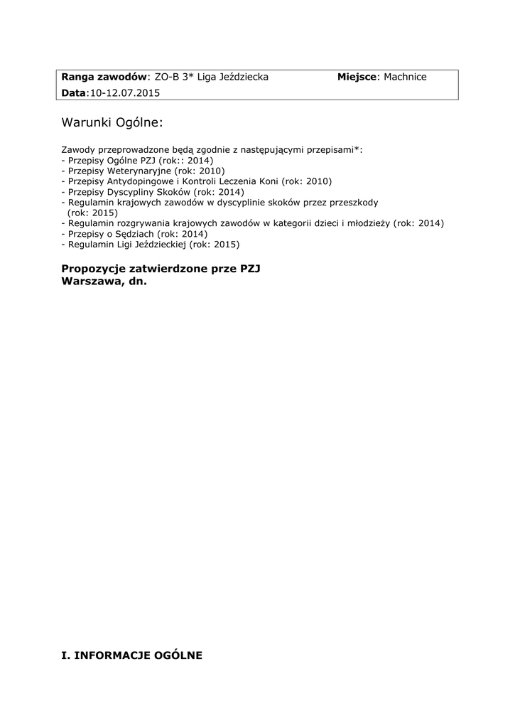 Ranga zawodów: ZO-B 3* Liga Jeździecka Miejsce: Machnice Data:10-12.07.2015 Warunki Ogólne: Zawody przeprowadzone będą zgodnie z następującymi przepisami*: - Przepisy Ogólne PZJ (rok:: 2014) - Przepisy Weterynaryjne (rok: 2010) - Przepisy Antydopingowe i Kontroli Leczenia Koni (rok: 2010) - Przepisy Dyscypliny Skoków (rok: 2014) - Regulamin krajowych zawodów w dyscyplinie skoków przez przeszkody (rok: 2015) - Regulamin rozgrywania krajowych zawodów w kategorii dzieci i młodzieży (rok: 2014) - Przepisy o Sędziach (rok: 2014) - Regulamin Ligi Jeździeckiej (rok: 2015) Propozycje zatwierdzone prze PZJ Warszawa, dn. I. INFORMACJE OGÓLNE 1. Zawody: Ranga zawodów: Liga Jeździecka ZO-B 3* Zawody halowe: Nie Kategoria wiekowa: D, MJ, J, S Data: 10-12.07.2015 Miejsce: Klub Sportowy „Śląsk” Machnice; Machnice Adres: Machnice 8; 55-114 Wisznia Mała Uczestnicy: Zgodnie z aktualnie obowiązującymi przepisami i regulaminami 2. Organizator Nazwa: Adres: Kod pocztowy: Telefon: Email : Internet: Klub Sportowy „Śląsk” Machnice 8 55-114 Wisznia Mała 882 16 43 16 Fax : 71 312 45 98 [email protected] www.ptakmachnice.pl ; www.zawodykonne.com 3. Komitet Organizacyjny Przewodniczący: Dyrektor Zawodów: Biuro Zawodów: Rzecznik Prasowy: Dyrektor Techniczny: Szef Stajni: Edward Ptak Emilia Ptak Czesław Goleń 4. Dane kontaktowe na miejscu zawodów: Adres: Machnice 8 Tel/fax.: 71 312 39 48 Telefon kom.: 882 16 43 16 II. OSOBY OFICJALNE (zgodnie z Przepisami o Sędziach wyd. 5, art.14 p.3) 1. Komisja Sędziowska: Przewodniczący: Sędzia PZJ: Członkowie: Elżbieta Strzeszewska Piotr Krysman Zofia Falińska 2. Delegat Techniczny: 3. Gospodarz Toru: Łukasz Jankowski Asystent Gospodarza Toru: Paweł Gołygowski 4. Komisarze: Grzegorz Jasiczek Wiktoria Strzeszewska 5. Delegat weterynaryjny PZJ: 6. Lekarz weterynarii zawodów: Przemysław Różycki 7. Komisja Odwoławcza: 8. Spiker: Bolesław Kuczerawy III WARUNKI TECHNICZNE Otwarcie stajni data 09.07.2015 godzina 12:00 Zebranie techniczne 10.07.2015 09:00 Przegląd Weterynaryjny 10.07.2015 09:00 Plac konkursowy/hala: podłoże: kwarcowe wymiary:75m x 55m Rozprężalnia: podłoże: kwarcowe wymiary:60m x 35m IV. WARUNKI UCZESTNICTWA 1.Uczestnictwo Zgodnie z Art. 18 p. 1-5 i Art. 29 p.1-2 Przepisów Ogólnych PZJ oraz Art. 1 p. 2 Regulaminu Dyscypliny Skoków: 2. Zgłoszenia: Termin zgłoszeń ostatecznych: 03.07.2015 Zgłoszenia prosimy wysyłać JEDYNIE poprzez stronę internetową: www.zawodykonne.com (zakładka: Machnice 1012.07.2015) Inne formy zgłoszeń nie będą ważne. W razie problemów technicznych, prosimy o kontakt na adres: [email protected] Organizator zastrzega sobie prawo do ograniczenia ilości startujących koni. Decyduje kolejność zgłoszeń z dołączonym potwierdzeniem opłaty minimalnej. Opłata minimalna wynosi 200 zł od konia. Rezerwacja boksów jest ważna TYLKO po przesłaniu informacji email z dołączonym dowodem wpłaty za boks na adres email: [email protected] Zgłoszenia są ważne tylko z dołączonym dowodem wpłaty na konto W przypadku wycofania się konia po terminie zgłoszeń ostatecznych oplaty nie podlegają zwrotowi. Opłata minimalna i opłata za boks nie są tożsame! Opłata minimalna, wniesiona w odpowiednim terminie gwaratntuje mozliwość statru w zawodach, opłata za boks gwaratnuje miejsce w wybranej stajni. W tytule wpłaty należy WYRAŹNIE zaznaczyć, czego dotyczy opłata. 3. Warunki finansowe: Wpisowe: Opłaty wpisowe: Runda Diamentowa: Runda Złota i Srebrna: Runda Brązowa (kuce): 600 zł 450 zł 300 zł Boks na całe zawody: W stajni murowanej (prestige): 300 zł W stajni murowanej: 250 zł W stajni namiotowej: 200 zł *ilość miejsc w stajniach murowanych jest ograniczona. Decyduje kolejność zgłoszeń W stajniach standard: słoma Dopłata za trociny: 50 zł za balot Program badań antydopingowych: 15 zł od konia Przyłącze do prądu: 150 zł (za całe zawody) + 50 zł (za każdy dodatkowy dzień) *Na zgłoszeniu proszę zaznaczyć, że będziecie Państwo korzystać z przyłącza prądu. (Podział strefy parkowania z prądem i bez prądu). Pasza i siano własne: T X Stajnie czynne będą od czwartku godz. 12:00 do poniedziałku godz. 8:00 Prosimy o zaznaczenie ilości rezerwowanych boksów oraz płci koni. W przypadku braku jakiejkolwiek wzmianki o boksach zgłoszenie będzie traktowane jako zgłoszenie bez boksów Minimalna wpłata od konia zgłoszonego na druku ostatecznym wynosi 200 zł i nie podlega zwrotowi w przypadku wycofania się konia po terminie zgłoszeń ostatecznych. Kara za trzymanie psa bez uwięzi na terenie zawodów - 500 zł. Konto: PKO BP S.A. 55-100 Trzebnica, ul Henryka Pobożnego 1 Wojskowy Klub Sportowy „Śląsk” Wrocław 96 1020 5297 0000 1102 0153 8164 z dopiskiem: a) za starty: (IMIĘ i NAZWISKO zawodnika, NAZWA konia, Liga Jeździecka) b) za boks: (IMIĘ i NAZWISKO zawodnika, NAZWA konia, BOKS) 4. Zakwaterowanie i wyżywienie: na koszt własny: TX Hotele (adres, telefon, fax, adres mailowy, odległość od miejsca rozgrywania Zawodów, koszt zakwaterowania, itp.) 1. Hotel Ptak Wrocław ul. Św. Wincentego 43 (15 km od miejsca rozgrywania zawodów) Pok. 1-os 150 zł Pok. 2-os 200 zł Nr tel: 71 372 12 00 (powyższe ceny obowiązują przy podaniu informacji o zawodach) W cenę wliczone jest pełne wyżywienie (śniadanie i obiadokolacja) 2. Domki w Machnicach Dostępne są 2 domki pięcioosobowe położone w Machnicach, przy hipodromie (5- 7 osób) Cena za noc: 500zł 5. INNE POSTANOWIENIA 1) Minimalna ilość startujących koni w konkursie to 10. Organizator zastrzega sobie prawo do odwołania konkursu w przypadku mniejszej ilości zgłoszonych koni. 2) Kary za brak dokumentów – według stawek PZJ. 3) Za reklamacje i odwołania obowiązuje kaucja w wys.:200 PLN 4) Dokonanie zmiany w zapisach do konkursu (po wywieszeniu list startowych) za zgodą sędziego głównego: 40 PLN 5) Wymagana dokumentacja dla koni aktualne badania i szczepi