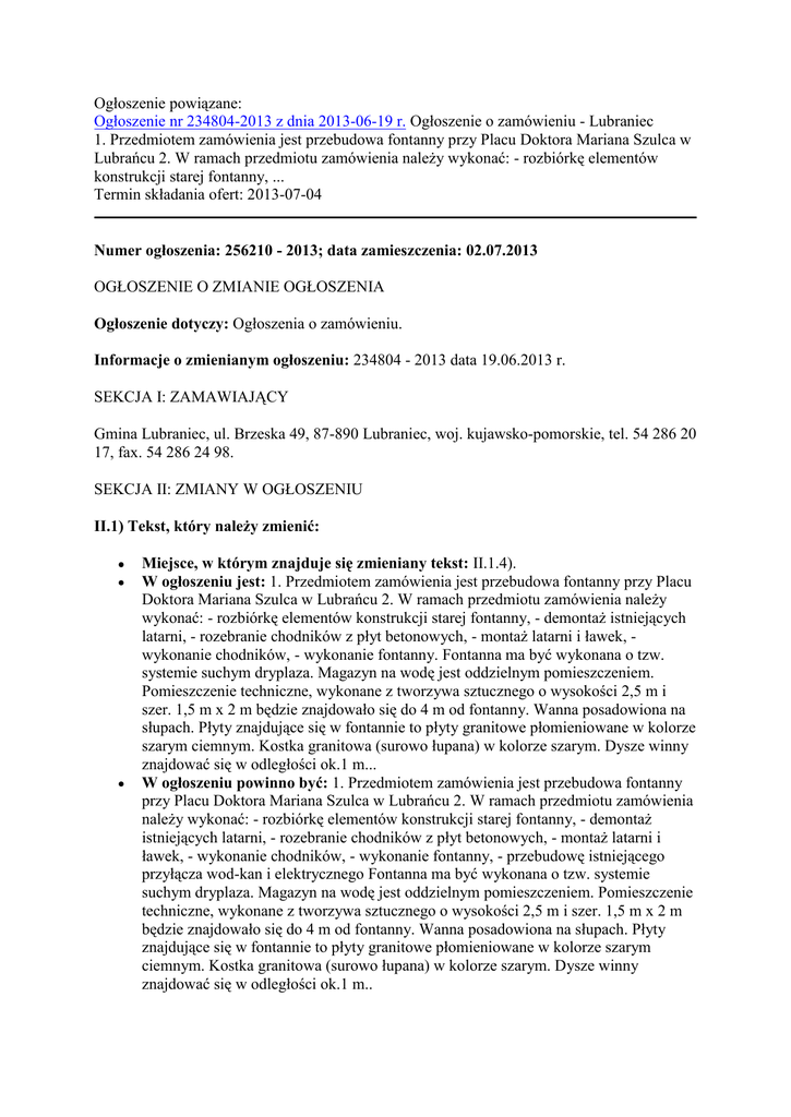 Ogłoszenie powiązane: Ogłoszenie nr 234804-2013 z dnia 2013-06-19 r. Ogłoszenie o zamówieniu - Lubraniec 1. Przedmiotem zamówienia jest przebudowa fontanny przy Placu Doktora Mariana Szulca w Lubrańcu 2. W ramach przedmiotu zamówienia należy wykonać: - rozbiórkę elementów konstrukcji starej fontanny, ... Termin składania ofert: 2013-07-04 Numer ogłoszenia: 256210 - 2013; data zamieszczenia: 02.07.2013 OGŁOSZENIE O ZMIANIE OGŁOSZENIA Ogłoszenie dotyczy: Ogłoszenia o zamówieniu. Informacje o zmienianym ogłoszeniu: 234804 - 2013 data 19.06.2013 r. SEKCJA I: ZAMAWIAJĄCY Gmina Lubraniec, ul. Brzeska 49, 87-890 Lubraniec, woj. kujawsko-pomorskie, tel. 54 286 20 17, fax. 54 286 24 98. SEKCJA II: ZMIANY W OGŁOSZENIU II.1) Tekst, który należy zmienić: Miejsce, w którym znajduje się zmieniany tekst: II.1.4). W ogłoszeniu jest: 1. Przedmiotem zamówienia jest przebudowa fontanny przy Placu Doktora Mariana Szulca w Lubrańcu 2. W ramach przedmiotu zamówienia należy wykonać: - rozbiórkę elementów konstrukcji starej fontanny, - demontaż istniejących latarni, - rozebranie chodników z płyt betonowych, - montaż latarni i ławek, wykonanie chodników, - wykonanie fontanny. Fontanna ma być wykonana o tzw. systemie suchym dryplaza. Magazyn na wodę jest oddzielnym pomieszczeniem. Pomieszczenie techniczne, wykonane z tworzywa sztucznego o wysokości 2,5 m i szer. 1,5 m x 2 m będzie znajdowało się do 4 m od fontanny. Wanna posadowiona na słupach. Płyty znajdujące się w fontannie to płyty granitowe płomieniowane w kolorze szarym ciemnym. Kostka granitowa (surowo łupana) w kolorze szarym. Dysze winny znajdować się w odległości ok.1 m... W ogłoszeniu powinno być: 1. Przedmiotem zamówienia jest przebudowa fontanny przy Placu Doktora Mariana Szulca w Lubrańcu 2. W ramach przedmiotu zamówienia należy wykonać: - rozbiórkę elementów konstrukcji starej fontanny, - demontaż istniejących latarni, - rozebranie chodników z płyt betonowych, - montaż latarni i ławek, - wykonanie chodników, - wykonanie fontanny, - przebudowę istniejącego przyłącza wod-kan i elektrycznego Fontanna ma być wykonana o tzw. systemie suchym dryplaza. Magazyn na wodę jest oddzielnym pomieszczeniem. Pomieszczenie techniczne, wykonane z tworzywa sztucznego o wysokości 2,5 m i szer. 1,5 m x 2 m będzie znajdowało się do 4 m od fontanny. Wanna posadowiona na słupach. Płyty znajdujące się w fontannie to płyty granitowe płomieniowane w kolorze szarym ciemnym. Kostka granitowa (surowo łupana) w kolorze szarym. Dysze winny znajdować się w odległości ok.1 m.. Miejsce, w którym znajduje się zmieniany tekst: IV.4.4). W ogłoszeniu jest: 04.07.2013 godzina 09:00, miejsce: Urząd Miejski w Lubrańcu ulica Brzeska 49 87-890 Lubraniec sekretariat - pokój nr 2.. W ogłoszeniu powinno być: 09.07.2013 godzina 09:00, miejsce: Urząd Miejski w Lubrańcu ulica Brzeska 49 87-890 Lubraniec sekretariat - pokój nr 2..