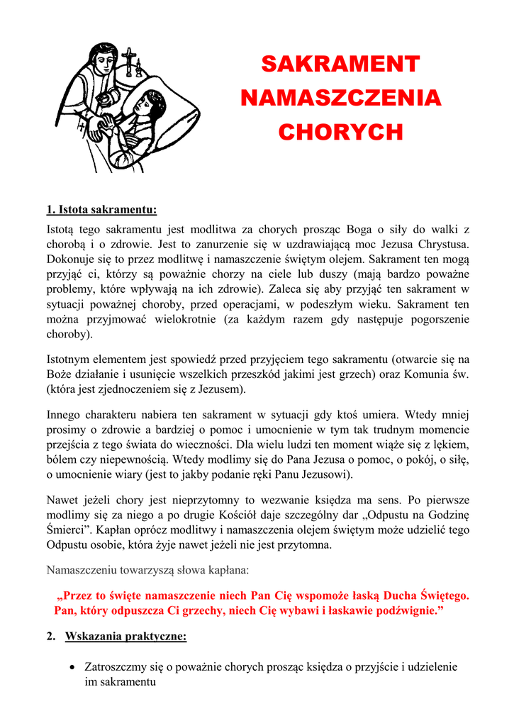 SAKRAMENT NAMASZCZENIA CHORYCH 1. Istota sakramentu: Istotą tego sakramentu jest modlitwa za chorych prosząc Boga o siły do walki z chorobą i o zdrowie. Jest to zanurzenie się w uzdrawiającą moc Jezusa Chrystusa. Dokonuje się to przez modlitwę i namaszczenie świętym olejem. Sakrament ten mogą przyjąć ci, którzy są poważnie chorzy na ciele lub duszy (mają bardzo poważne problemy, które wpływają na ich zdrowie). Zaleca się aby przyjąć ten sakrament w sytuacji poważnej choroby, przed operacjami, w podeszłym wieku. Sakrament ten można przyjmować wielokrotnie (za każdym razem gdy następuje pogorszenie choroby). Istotnym elementem jest spowiedź przed przyjęciem tego sakramentu (otwarcie się na Boże działanie i usunięcie wszelkich przeszkód jakimi jest grzech) oraz Komunia św. (która jest zjednoczeniem się z Jezusem). Innego charakteru nabiera ten sakrament w sytuacji gdy ktoś umiera. Wtedy mniej prosimy o zdrowie a bardziej o pomoc i umocnienie w tym tak trudnym momencie przejścia z tego świata do wieczności. Dla wielu ludzi ten moment wiąże się z lękiem, bólem czy niepewnością. Wtedy modlimy się do Pana Jezusa o pomoc, o pokój, o siłę, o umocnienie wiary (jest to jakby podanie ręki Panu Jezusowi). Nawet jeżeli chory jest nieprzytomny to wezwanie księdza ma sens. Po pierwsze modlimy się za niego a po drugie Kościół daje szczególny dar „Odpustu na Godzinę Śmierci”. Kapłan oprócz modlitwy i namaszczenia olejem świętym może udzielić tego Odpustu osobie, która żyje nawet jeżeli nie jest przytomna. Namaszczeniu towarzyszą słowa kapłana: „Przez to święte namaszczenie niech Pan Cię wspomoże łaską Ducha Świętego. Pan, który odpuszcza Ci grzechy, niech Cię wybawi i łaskawie podźwignie.” 2. Wskazania praktyczne: Zatroszczmy się o poważnie chorych prosząc księdza o przyjście i udzielenie im sakramentu Nawet jeżeli stan chorego jest bardzo poważny to poprośmy kapłana, który sam będzie wiedział jak chorego przygotować i jak mu wytłumaczyć istotę sakramentu Prosząc księdza powiedzmy czy chory jest świadomy i czy może przyjąć Komunię św. Przygotujmy godne miejsce: obrus, krzyż, świeczki Gdy odwiedzamy chorych w szpitalu zapytajmy czy przyjęli Duchowe lekarstwo czyli sakrament chorych W naszej parafii odwiedzamy chorych z Najświętszym Sakramentem w I sobotę miesiąca rano od 9:00. Zgłaszać można chorych w zakrystii, w kancelarii lub telefonicznie. Można to zrobić osobiście lub przez kogoś. Nie zaniedbujmy tej Bożej łaski sakramentalnego umocnienia chorych. Jest to duchowe lekarstwo. Nie jest to „Ostatnie Namaszczenie” choć czasami nim się staje.