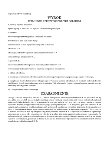 Sygnatura akt VII U 2137/14 WYROK W IMIENIU RZECZYPOSPOLITEJ POLSKIEJ P., dnia 23 stycznia 2015 roku Sąd Okręgowy w Poznaniu VII Wydział Ubezpieczeń Społecznych w składzie: Przewodniczący:SSO Małgorzata Kuźniacka-Praszczyk Protokolant:st. sek. sąd. Marta Jurga po rozpoznaniu w dniu 23 stycznia 2015 roku w Poznaniu odwołania S. P. od decyzji Zakładu Ubezpieczeń Społecznych II Oddziału w P. z dnia 21 lutego 2014 roku Nr (...) w sprawie S. P. przeciwko Zakładowi Ubezpieczeń Społecznych II Oddziałowi w P. o wydanie zaświadczenia w sprawie z zakresu ubezpieczeń społecznych 1. oddala odwołanie, 2. odstępuje od obciążania odwołującego kosztami zastępstwa procesowego pozwanego organu rentowego, 3. zasądza od Skarbu Państwa Sądu Okręgowego w Poznaniu na rzecz adwokata A. G. kwotę 60 złotych ( słownie: sześćdziesiąt złotych ) powiększoną o stawkę podatku VAT od towarów i usług, tytułem kosztów pomocy prawnej udzielonej odwołującemu z urzędu. SSO Małgorzata Kuźniacka-Praszczyk UZASADNIENIE Decyzją z dnia 21 lutego 2014 roku Nr (...) Zakład Ubezpieczeń Społecznych II Oddział w P. na podstawie art. 83 ust.1 pkt 2 oraz art. 83b ust.1 w związku z art.123 ustawy z dnia 13 października 1998 roku o systemie ubezpieczeń społecznych (tekst jednolity: Dz. U. z 2009 roku Nr 205, poz. 1585 ze zm.) oraz z art. 219 ustawy z dnia 14 czerwca 1960 roku Kodeks postępowania administracyjnego (tekst jednolity Dz. U. z 2013 roku, poz.267) odmówił S. P. wydania zaświadczenia o przebiegu ubezpieczeń społecznych za okres od 1 września 2011 roku do 31 grudnia 2011 roku. W uzasadnieniu decyzji organ rentowy stwierdził, że Sąd Okręgowy w Poznaniu w sprawie VIII U 3507/12 w punkcie 2 wyroku z dnia 29 listopada 2013 roku przekazał wniosek S. P. o wydanie zaświadczenia o przebiegu ubezpieczenia za okres od 1 września 2011 roku do 31 grudnia 2011 roku organowi rentowemu do rozpoznania. Na podstawie danych zawartych w Kompleksowym Systemie Informatycznym ZUS organ rentowy ustalił, że nie można wystawić zaświadczenia, ponieważ na koncie S. P. nie ma dokumentów zgłoszeniowych i rozliczeniowych z tytułu zatrudnienia u płatnika składek S. G.. Z powyższym rozstrzygnięciem nie zgodził się odwołujący S. P. i w przepisanym prawem terminie z zachowaniem wymaganego trybu wniósł odwołanie, wskazując, że po zapoznaniu się z treścią wyroku Sądu Okręgowego w Poznaniu z dnia 29 listopada 2013 roku wydanego w sprawie VIII U 3507/12/13 zajmie ostateczne stanowisko. W odpowiedzi na odwołanie pozwany organ rentowy wniósł o jego oddalenie, powołując argumentację faktyczną i prawną zaprezentowaną w zaskarżonej decyzji. W piśmie procesowym z dnia 23 lipca 2014 roku S. P. wniósł o uwzględnienie odwołania w całości, oddalenie odpowiedzi na odwołanie, przeprowadzenie dowodu z przesłuchania świadków wymienionych w piśmie oraz dowodu z zaświadczenia organu rentowego o przebiegu ubezpieczeń społecznych z dnia 25 maja 2012 roku na okoliczność ustalenia, że odwołujący pozostawał w stosunku pracy u płatnika składek R. G. i G. G. (1) w okresie od września 2011 roku do kwietnia 2012 roku, ewentualnie w przypadku niekorzystnego rozstrzygnięcia niniejszej sprawy o zwolnienie od kosztów sądowych, w tym obowiązku uiszczenia kosztów zastępstwa procesowego z uwagi na bardzo trudną i dramatyczną sytuację materialną. Odwołujący sprecyzował, że domaga się wydania zaświadczenia o przebiegu ubezpieczenia za okres od 1 września 2011 roku do 29 lutego 2012 roku, nadto wskazał, że w aktach rentowych znajdują się dokumenty, z których wynika, że uiszczono za niego składki za miesiące marzec i kwiecień 2012 roku, a pisemne oświadczenia świadków potwierdzają, że odwołujący wykonywał pracę od września 2011 roku. W ocenie odwołującego organ rentowy winien zastosować przepis art. 48 oraz przepis art. 48b ustawy o systemie ubezpieczeń społecznych, które stanowią, że organ rentowy ma kompetencję do ustalenia wymiaru składek z urzędu w wysokości ostatnio złożonej deklaracji rozliczeniowej, może także sporządzić z urzędu zgłoszenie do ubezpieczeń społecznych. Sąd Okręgowy w Poznaniu postanowieniem z dnia 1 sierpnia 2014 roku ustanowił dla odwołującego S. P. pełnomocnika z urzędu. W związku z pismem odwołującego z dnia 3 listopada 2014 roku Rada Adwokacka w P. wyznaczyła w miejsce adwokata J. W. adwokata K. J.. Na rozprawie w dniu 14 listopada 2014 roku Sąd na wniosek pełnomocnika odwołującego zwolnił adwokata K. J. od obowiązku zastępowania odwołującego w niniejszym postępowaniu i zwrócił się do Rady Adwokackiej w P. o wyznaczenie dla odwołującego innego pełnomocnika z urzędu. W piśmie procesowym z dnia 20 stycznia 2015 roku pełnomocnik odwołującego podtrzymała w całości dotychczasowe stanowisko w sprawie i wniosła o ustalenie istnienia ubezpieczenia społecznego w okresie od 1 września 2011 roku do 28 lutego 2012 roku z tytułu zatrudnienia w firmie (...). Sąd Okręgowy ustalił następujący stan faktyczny: Odwołujący S. P. złożył w dniu 25 maja 2012 roku wniosek o wydanie potwierdzenia okresu ubezpieczenia z tytułu zatrudnienia na umowę zlecenia u płatnika składek G. G. (1) prowadzącego działalność gospodarczą pod nazwą (...) S.C.” G. R., G. G. (2) z siedzibą w P. za okres od 1 stycznia 2012 roku do 30 kwietnia 2012 roku. W odpowiedzi na wniosek organ rentowy wydał w dniu 25 maja 2012 roku zaświadczenie potwierdzające, że odwołujący w okresie od 1 marca 2012 roku do 30 kwietnia 2012 roku podlegał ubezpieczeniom społecznym jako osoba wykonująca umowę agencyjną, umowę zlecenia u płatnika składek R. G., przy czym podstawa wymiaru składki za miesiąc marzec 2012 roku wyniosła 300,00 zł., za miesiąc kwiecień 2012 roku wyniosła 300,00 zł. Organ rentowy ustalił nadto, że na koncie odwołującego nie ma dokumentów zgłosze