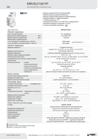 MR-EU1W1P 36 przekaŸniki nadzorcze • • • • • • • • Nadzór napiêcia AC/DC w jednej fazie ❶ Wielofunkcyjne przekaŸniki nadzorcze Nadzór wartoœci maksymalnej z funkcj¹ histerezy Napiêcie zasilania = napiêcie mierzone 1 zestyk prze³¹czny: 1P Obci¹¿alnoœæ zestyku: 5 A / 250 V AC w kategorii AC1 Obudowa modu³owa: szerokoœæ 17,5 mm Uznania, certyfikaty, dyrektywy: MR-EU1W1P Typ przekaŸnika Obwód wyjœciowy Iloœæ i rodzaj zestyków Znamionowy pr¹d obci¹¿enia Maksymalna moc ³¹czeniowa Maksymalna czêstoœæ ³¹czeñ • przy obci¹¿eniu rezystancyjnym 100 VA • przy obci¹¿eniu rezystancyjnym 1 000 VA AC1 AC1 1P - prze³¹czny 5 A / 250 V AC 1 250 VA 3 600 cykli/h 360 cykli/h wg PN-EN 60947-5-1 Obwód wejœciowy Napiêcie zasilania U Napiêcie znamionowe Un Napiêcie odpadowe Roboczy zakres napiêcia zasilania Znamionowy pobór mocy Czêstotliwoœæ znamionowa \ postaæ falowa Cykl roboczy Obwód pomiarowy • zaciski • zmienna pomiarowa • wejœcie pomiarowe • zdolnoœæ przeci¹¿eniowa • próg prze³¹czania Us • histereza H = napiêcie mierzone; zaciski: 230 V AC: E-F3 24 V AC: E-F2 24 V DC: E-F1 24 V AC/DC, 230 V AC okreœlone detekcj¹ podnapiêciow¹ (patrz obwód pomiarowy) 0,75 < Un < 1,2 230 V AC: 10,0 VA / 0,6 W 24 V AC: 1,3 VA / 0,8 W 24 V DC: 0,6 W AC: 48...63 Hz \ DC, AC sinus 100% 230 V AC: E-F3 24 V AC: E-F2 24 V DC: E-F1 DC lub AC sinus, 48...63 Hz = napiêcie zasilania ≥ 1,2 Un Max: 0,8 < Un < 1,2 Min: 0,75 < Un < 1,15 patrz informacje w tabeli zamówieñ lub nadruk na urz¹dzeniu Dane izolacji Znamionowe napiêcie udarowe Kategoria przepiêciowa Stopieñ zanieczyszczenia izolacji 4 000 V AC III wg PN-EN 60664-1 2, jeœli zabudowany 3 wg PN-EN 60664-1 Pozosta³e dane Trwa³oœæ ³¹czeniowa • w kategorii AC1 Trwa³oœæ mechaniczna (cykle) Wymiary (a x b x h) Masa Temperatura otoczenia • sk³adowania, transportu • pracy Stopieñ ochrony obudowy Wilgotnoœæ wzglêdna Odpornoœæ na udary Odpornoœæ na wibracje ≥ 2 x 105 1 000 VA ≥ 2 x 107 87 x 17,5 x 60 mm 72 g -25...+70 oC -25...+55 oC wg PN-EN 60068-1 IP 40 15...85% wg PN-EN 60721-3-3 klasa 3K3 15 g 11 ms wg PN-EN 60068-2-27 0,35 mm DA 10...55 Hz wg PN-EN 60068-2-6 Dane obwodu pomiarowego Funkcje UNDER, WIN ❷ nadzór wartoœci maksymalnej z funkcj¹ histerezy ± 5% (liczona od koñcowych wartoœci zakresów) ± 5% (liczona od koñcowych wartoœci zakresów) ± 2% ± 1% / °C 500 ms dioda LED zielona ON/OFF - sygnalizacja napiêcia zasilania dioda LED czerwona ON/OFF - sygnalizacja b³êdu ❸ dioda LED ¿ó³ta R ON/OFF - stan przekaŸnika wyjœciowego Dok³adnoœæ podstawowa Dok³adnoœæ nastawienia Powtarzalnoœæ Wp³yw temperatury Czas regeneracji Wyœwietlanie ❶ Z nastaw¹ progu. ❷ Wybierane za pomoc¹ prze³¹cznika obrotowego. ❸ Zgodnie z nastawionym progiem. www.relpol.com.pl Dzia³ Marketingu Tel./Fax +48 68 47 90 830 • Wsparcie Techniczne Tel. +48 68 47 90 820 MR-EU1W1P przekaŸniki nadzorcze Wymiary 37 Schematy po³¹czeñ Sieæ jednofazowa, 230 V AC Sieæ jednofazowa, 24 V AC 24 V DC Monta¿, konstrukcja PrzekaŸniki MR-EU1W1P przeznaczone s¹ do bezpoœredniego monta¿u na szynie 35 mm wg EN 50022. Pozycja monta¿owa: dowolna. Obudowa z samogasn¹cego tworzywa sztucznego, IP 40. Zacisk odporny na wstrz¹sy wg VBG 4 (wymagane PZ1), IP 20. Maksymalny moment dokrêcenia zacisku: 1,0 Nm. Pojemnoœæ zacisków: 1 x 0,5 do 2,5 mm2 z/bez koñcówki kabla wielo¿y³owego, 1 x 4 mm2 bez koñcówki kabla wielo¿y³owego, 2 x 0,5 do 1,5 mm2 z/bez koñcówki kabla wielo¿y³owego, 2 x 2,5 mm2 elastyczny bez koñcówki kabla wielo¿y³owego. Funkcje UNDER - nadzór wartoœci minimalnej napiêcia WIN - nadzór napiêcia w funkcji okna pomiêdzy wartoœciami MIN i MAX Gdy podane jest napiêcie zasilania U, przekaŸnik wyjœciowy R prze³¹cza siê do pozycji w³¹czonej, je¿eli nadzorowane napiêcie jest poni¿ej nastawy MIN. Gdy nadzorowane napiêcie spadnie poni¿ej nastawy MIN, przekaŸnik wyjœciowy R prze³¹cza siê do pozycji wy³¹czonej. PrzekaŸnik wyjœciowy ponownie prze³¹cza siê do pozycji w³¹czonej, je¿eli napiêcie przekroczy wartoœæ MAX. Gdy podane jest napiêcie zasilania U, przekaŸnik wyjœciowy R prze³¹cza siê do pozycji w³¹czonej, jeœli mierzone napiêcie znajduje siê w nastawionym oknie. Gdy nadzorowane napiêcie przekroczy nastawione progi MIN i MAX, przekaŸnik wyjœciowy R prze³¹czy sie do pozycji wy³¹czonej. PrzekaŸnik wyjœciowy R ponownie prze³¹cza siê do pozycji w³¹czonej, jeœli napiêcie znajdzie siê znowu w obrêbie nastawionego okna. U - napiêcie zasilania; R - przekaŸnik wyjœciowy Dzia³ Marketingu Tel./Fax +48 68 47 90 830 • Wsparcie Techniczne Tel. +48 68 47 90 820 www.relpol.com.pl