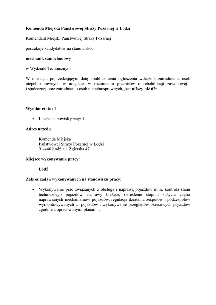 Komenda Miejska Państwowej Straży Pożarnej w Łodzi Komendant Miejski Państwowej Straży Pożarnej poszukuje kandydatów na stanowisko: mechanik samochodowy w Wydziale Technicznym W miesiącu poprzedzającym datę upublicznienia ogłoszenia wskaźnik zatrudnienia osób niepełnosprawnych w urzędzie, w rozumieniu przepisów o rehabilitacji zawodowej i społecznej oraz zatrudnianiu osób niepełnosprawnych, jest niższy niż 6%. Wymiar etatu: 1 Liczba stanowisk pracy: 1 Adres urzędu Komenda Miejska Państwowej Straży Pożarnej w Łodzi 91-446 Łódź, ul. Zgierska 47 Miejsce wykonywania pracy: Łódź Zakres zadań wykonywanych na stanowisku pracy: Wykonywanie prac związanych z obsługą i naprawą pojazdów m.in. kontrola stanu technicznego pojazdów, naprawy bieżące, określenie stopnia zużycia części naprawianych mechanizmów pojazdów, regulacja działania zespołów i podzespołów wymontowywanych z pojazdów , wykonywanie przeglądów okresowych pojazdów zgodnie z opracowanymi planami . Wymagania związane ze stanowiskiem pracy niezbędne wykształcenie: zasadnicze pozostałe wymagania niezbędne: o zawód wyuczony mechanik pojazdów samochodowych o doświadczenie powyżej 2 lat na stanowisku związanym z naprawą pojazdów samochodowych o samodzielność i własna inicjatywa o umiejętność działania w sytuacjach stresowych wymagania dodatkowe wykształcenie średnie dyspozycyjność szkolenia w zakresie przeprowadzania badań technicznych, dodatkowych badań technicznych związanych z dopuszczaniem do ruchu pojazdów. Wymagane dokumenty i oświadczenia: życiorys i list motywacyjny oświadczenie kandydata o wyrażeniu zgody na przetwarzanie danych osobowych do celów rekrutacji oświadczenie kandydata o korzystaniu z pełni praw publicznych oświadczenie kandydata o nieskazaniu prawomocnym wyrokiem za umyślne przestępstwo lub umyślne przestępstwo skarbowe kopie dokumentów potwierdzających wykształcenie kopia dokumentu potwierdzającego posiadanie polskiego obywatelstwa lub oświadczenie o posiadaniu obywatelstwa polskiego kopie świadectw pracy Inne dokumenty i oświadczenia kopia dokumentu potwierdzającego niepełnosprawność - w przypadku kandydatów, którzy zamierzają skorzystać z pierwszeństwa w zatrudnieniu w przypadku, gdy znajdą się w gronie najlepszych kandydatów Termin składania dokumentów: 12-09-2016 Miejsce składania dokumentów: Komenda Miejska Państwowej Straży Pożarnej Zgierska 47 91-446 Łódź od poniedziałku do piątku w godzinach 7.30 - 15.30 Decyduje data wpływu aplikacji do Komendy Miejskiej PSP w Łodzi Inne informacje: • Lista osób spełniających wymagania formalne wraz z terminem kolejnego etapu postępowania zostanie opublikowana do dnia 16.09.2016 roku. • Wyniki i terminy poszczególnych etapów będą publikowane na stronie Komendy Miejskiej PSP w Łodzi (www.kmpsplodz.pl). • Nie umieszczenie kandydata na liście oznacza nie zakwalifikowanie się do kolejnego etapu. • Komisja nie kontaktuje się bezpośrednio z kandydatami na etapie selekcji. • Nie stawienie się kandydata w wyznaczonym terminie dyskwalifikuje kandydata. • Dodatkowe informacje można uzyskać pod numerem telefonu (042) 61 63 034. • Oferty odrzucone zostaną komisyjnie zniszczone. • Wynagrodzenie wynosi ok. 2100,00 zł (brutto).