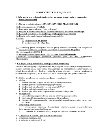 MARKETING I ZARZĄDZANIE 1. Informacje o przedmiocie (zajęciach), jednostce koordynującej przedmiot, osobie prowadzącej 1.1. Nazwa przedmiotu (zajęć): ZARZĄDZANIE I MARKETING 1.2. Forma przedmiotu: Wykłady 1.3. Przedmiot wprowadzający (poprzedzający): 1.4. Instytut/ Katedra koordynująca przedmiot (zajęcia): Zakład Kosmetologii 1.5. Kierunek kształcenia: Kosmetologia studia pierwszego stopnia 1.6. Liczba godzin zajęć przewidziana planem studiów: Wykłądy: a) stacjonarnych: 15 godzin b) niestacjonarnych: 10 godzin 1.7. Szacowany przez nauczyciela nakład pracy studenta niezbędny do osiągnięcia zakładanych efektów kształcenia (określony w godzinach): 25 godzin 1.8. Liczba punktów ECTS: 2 1.9. Osoba prowadząca przedmiot (zajęcia): mgr Izabela Kozłowska 1.10.Osoba koordynująca przedmiot (zajęcia): prof. dr hab. Aleksander Maksimczuk 2. Cel zajęć, efekty kształcenia oraz sposób ich weryfikacji Studenci zapoznają się z zagadnieniami dotyczącymi zarządzania przedsiębiorstwem, analizy ekonomicznej, planowania strategicznego ze szczególnym nastawieniem na usługi kosmetologiczne. Studenci zdobędą wiedzę również z zakresu marketingu działalności usługowej tj. m.in. analizy SWOT, marketingu mix, public relations. 2.1. Efekty kształcenia po zakończeniu kursu - w zakresie: a. wiedzy: 1. student definiuje pojęcie zarządzania przedsiębiorstwem; 2. Student potrafi objaśnić funkcje przywódcze; 3. Student potrafi scharakteryzować analizę SWOT; 4. Student definiuje pojęcie marketingu; 5. Student potrafi określić i opisać narzędzia marketingu mix; b. umiejętności: 1. Umiejętność przeprowadzenia analizy SWOT przedsiębiorstwa 2. Umiejętność stworzenia uproszczonego biznes planu; 3. Umijętność zaproponowania i zaplanowania kampanii promocyjnej usługi czy też firmy; c. kompetencji społecznych: 1. świadomość znaczenia Komunikacji interpersonalnej w prawidłowym funkcjonomowaniu przedsiębiorstwa; 2. zdolność do wdrażania efektywnego zarządzania zasobami ludzkimi ; 2.3. Określenie w skali 0-3 pkt. efektów kształcenia: a. w zakresie wiedzy: 3 pkt. b. w zakresie umiejętności: 3 pkt. c. w zakresie kompetencji personalnych i społecznych: 3 pkt. 2.4. Sposób weryfikacji (oceny) efektów kształcenia: - Zaliczenie wykładów w formie projektów grupowych 3. Treści kształcenia - tematyka poszczególnych zajęć oraz liczba godzin zajęć dotyczących danego tematu Wykłady: a) stacjonarne 1. 2. 3. 4. 5. 6. Zarządzanie przedsiębiorstwem -wprowadzenie – 2 h Analiza SWOT – 4 h Funkcje przywódcze– 2 h Motywowanie pracowników – 2h Marketing, narzędzia marketingu mix - 3 h Public relations– 2 h 1. 2. 3. 4. 5. 6. Zarządzanie przedsiębiorstwem -wprowadzenie – 1 h Analiza SWOT – 2 h Funkcje przywódcze– 2 h Motywowanie pracowników – 1h Marketing, narzędzia marketingu mix - 2 h Public relations– 2 h b) niestacjonarne 4. Literatura przedmiotu: Literatura obowiązkowa: 1. Pilarczyk B., Mruk H. /red.nauk/: Kompendium wiedzy o marketingu. Wyd. PWN, Warszawa 2007. 2. Kupiec L., Dębowski T.: Biznes plan jako instrument zarządzania firmą. Wyd. Wyższa Szkoła Finansów i Zarządzania, Białystok 2003. 3. Huczek M.: Marketing organizacji non profit. Wyd. Wyższa Szkoła Zarządzania i Marketingu w Sosnowcu, Sosnowiec 2003. 4. Koźmiński A.K., Piotrowski W. /red.nauk./: Zarządzanie: teoria i praktyka. Wyd. PWN, Warszawa 2007. 5. Bukowska – Piestrzyńska A.: Marketing usług zdrowotnych od budowania wizerunku placówki do zadowolenia klientów. Wyd. CeDeWu, Warszawa 2007. 6. Filip R.S.: Marketing specjalistycznych ambulatoryjnych usług medycznych. Wyd. Czelej, Lublin 2000. Literatura uzupełniająca: 1. Lasota M., Rychlica A., Ryś A., Stępieli W.: Public relations w ochronie zdrowia. Wyd. Vesalius, Kraków 2000. 2. Nogalski R., Rybiceki J.: Nowoczesne zarządzanie Zakładem Opieki Zdrowotnej. Wyd. Tonik, Toruń 2002. 3. Trocki M.: Warunki systemowe zarządzania opieką zdrowotną. Wyd. PZWL, Warszawa 2002. 5. Inne pomoce dydaktyczne Rzutnik multimedialny, tablica.