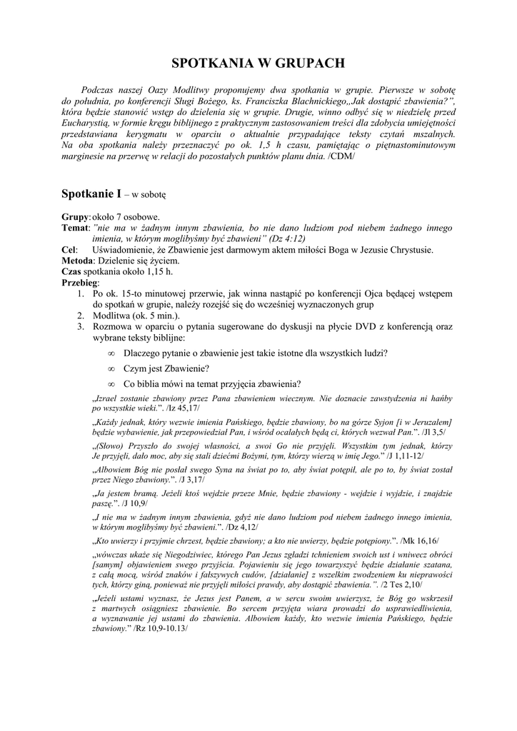 SPOTKANIA W GRUPACH Podczas naszej Oazy Modlitwy proponujemy dwa spotkania w grupie. Pierwsze w sobotę do południa, po konferencji Sługi BoŜego, ks. Franciszka Blachnickiego„Jak dostąpić zbawienia?”, która będzie stanowić wstęp do dzielenia się w grupie. Drugie, winno odbyć się w niedzielę przed Eucharystią, w formie kręgu biblijnego z praktycznym zastosowaniem treści dla zdobycia umiejętności przedstawiana kerygmatu w oparciu o aktualnie przypadające teksty czytań mszalnych. Na oba spotkania naleŜy przeznaczyć po ok. 1,5 h czasu, pamiętając o piętnastominutowym marginesie na przerwę w relacji do pozostałych punktów planu dnia. /CDM/ Spotkanie I – w sobotę Grupy: około 7 osobowe. Temat: ”nie ma w Ŝadnym innym zbawienia, bo nie dano ludziom pod niebem Ŝadnego innego imienia, w którym moglibyśmy być zbawieni” (Dz 4:12) Cel: Uświadomienie, Ŝe Zbawienie jest darmowym aktem miłości Boga w Jezusie Chrystusie. Metoda: Dzielenie się Ŝyciem. Czas spotkania około 1,15 h. Przebieg: 1. Po ok. 15-to minutowej przerwie, jak winna nastąpić po konferencji Ojca będącej wstępem do spotkań w grupie, naleŜy rozejść się do wcześniej wyznaczonych grup 2. Modlitwa (ok. 5 min.). 3. Rozmowa w oparciu o pytania sugerowane do dyskusji na płycie DVD z konferencją oraz wybrane teksty biblijne: • Dlaczego pytanie o zbawienie jest takie istotne dla wszystkich ludzi? • Czym jest Zbawienie? • Co biblia mówi na temat przyjęcia zbawienia? „Izrael zostanie zbawiony przez Pana zbawieniem wiecznym. Nie doznacie zawstydzenia ni hańby po wszystkie wieki.”. /Iz 45,17/ „KaŜdy jednak, który wezwie imienia Pańskiego, będzie zbawiony, bo na górze Syjon [i w Jeruzalem] będzie wybawienie, jak przepowiedział Pan, i wśród ocalałych będą ci, których wezwał Pan.”. /Jl 3,5/ „(Słowo) Przyszło do swojej własności, a swoi Go nie przyjęli. Wszystkim tym jednak, którzy Je przyjęli, dało moc, aby się stali dziećmi BoŜymi, tym, którzy wierzą w imię Jego.” /J 1,11-12/ „Albowiem Bóg nie posłał swego Syna na świat po to, aby świat potępił, ale po to, by świat został przez Niego zbawiony.”. /J 3,17/ „Ja jestem bramą. JeŜeli ktoś wejdzie przeze Mnie, będzie zbawiony - wejdzie i wyjdzie, i znajdzie paszę.”. /J 10,9/ „I nie ma w Ŝadnym innym zbawienia, gdyŜ nie dano ludziom pod niebem Ŝadnego innego imienia, w którym moglibyśmy być zbawieni.”. /Dz 4,12/ „Kto uwierzy i przyjmie chrzest, będzie zbawiony; a kto nie uwierzy, będzie potępiony.”. /Mk 16,16/ „wówczas ukaŜe się Niegodziwiec, którego Pan Jezus zgładzi tchnieniem swoich ust i wniwecz obróci [samym] objawieniem swego przyjścia. Pojawieniu się jego towarzyszyć będzie działanie szatana, z całą mocą, wśród znaków i fałszywych cudów, [działanie] z wszelkim zwodzeniem ku nieprawości tych, którzy giną, poniewaŜ nie przyjęli miłości prawdy, aby dostąpić zbawienia.”. /2 Tes 2,10/ „JeŜeli ustami wyznasz, Ŝe Jezus jest Panem, a w sercu swoim uwierzysz, Ŝe Bóg go wskrzesił z martwych osiągniesz zbawienie. Bo sercem przyjęta wiara prowadzi do usprawiedliwienia, a wyznawanie jej ustami do zbawienia. Albowiem kaŜdy, kto wezwie imienia Pańskiego, będzie zbawiony.” /Rz 10,9-10.13/ • Jakie są powszechnie powtarzane teorie na temat relacji między wiarą a uczynkami? A co na ten temat mówi Pismo Święte? „Ale teraz jawną się stała sprawiedliwość BoŜa niezaleŜna od Prawa, poświadczona przez Prawo i Proroków. Jest to sprawiedliwość BoŜa przez wiarę w Jezusa Chrystusa dla wszystkich, którzy wierzą. Bo nie ma tu róŜnicy: wszyscy bowiem zgrzeszyli i pozbawieni są chwały BoŜej, a dostępują usprawiedliwienia darmo, z Jego łaski, przez odkupienie które jest w Chrystusie Jezusie. Jego to ustanowił Bóg narzędziem przebłagania przez wiarę mocą Jego krwi. Chciał przez to okazać, Ŝe sprawiedliwość Jego względem grzechów popełnionych dawniej - za dni cierpliwości BoŜej wyraŜała się w odpuszczaniu ich po to, by ujawnić w obecnym czasie Jego sprawiedliwość, i [aby pokazać], Ŝe On sam jest sprawiedliwy i usprawiedliwia kaŜdego, który wierzy w Jezusa. Sądzimy bowiem, Ŝe człowiek osiąga usprawiedliwienie przez wiarę, niezaleŜnie od pełnienia nakazów Prawa.” /Rz 3,21-26.28/ „Łaską bowiem jesteście zbawieni przez wiarę. A to pochodzi nie od was, lecz jest darem Boga nie z uczynków, aby się nikt nie chlubił.” /Ef 2,8-9/ „Nie kaŜdy, który Mi mówi: Panie, Panie!, wejdzie do królestwa niebieskiego, lecz ten, kto spełnia wolę mojego Ojca, który jest w niebie.” /Mt 7,21/ „Czemu to wzywacie Mnie: Panie, Panie, a nie czynicie tego, co mówię?” /Łk 6,46/ „Nie ci bowiem, którzy przysłuchują się czytaniu Prawa, są sprawiedliwi wobec Boga, ale ci, którzy Prawo wypełniają, będą usprawiedliwieni.” /Rz 2,13/ „Tak jak ciało bez ducha jest martwe, tak teŜ jest martwa wiara bez uczynków.” /Jk 2,26/ • Jaka jest Twoja odpowiedź na to, co zrobił Chrystus? 4. Wspólna modlitwa dziękczynienia za dar zbawienia. Spotkanie II – w niedzielę – Krąg biblijny z czytań mszalnych z liturgii niedzielnej. Grupy: około 8 osobowe. Temat: ”Jezu, wspomnij na mnie, gdy przyjdziesz do swego królestwa” Cel: Uświadomienie, Ŝe Jezus Chrystus, którego głosimy, jest jedynym Zbawicielem; zdobycie umiejętności przedstawiana kerygmatu w oparciu o teksty czytań mszalnych. Metoda: Krąg biblijny Czas spotkania około 1,15 h. Przebieg: 5. Modlitwa (ok. 5 min.). 6. Lektura tekstów biblijnych (ok. 7 min.). 7. Przypomnienie treści „czterech praw Ŝycia duchowego”, pamiętając, Ŝe kaŜde prawo zawiera dwie prawdy (ok. 5 min.). 8. Wspólne wyszukanie poszczególnych podstawowych prawd ewangelizacyjnych (kerygmatu) w tekstach czytań mszalnych (w miarę moŜliwości staramy się znaleźć wszystkie). 9. Przedstawienie kerygmatu w oparciu o zaznacz