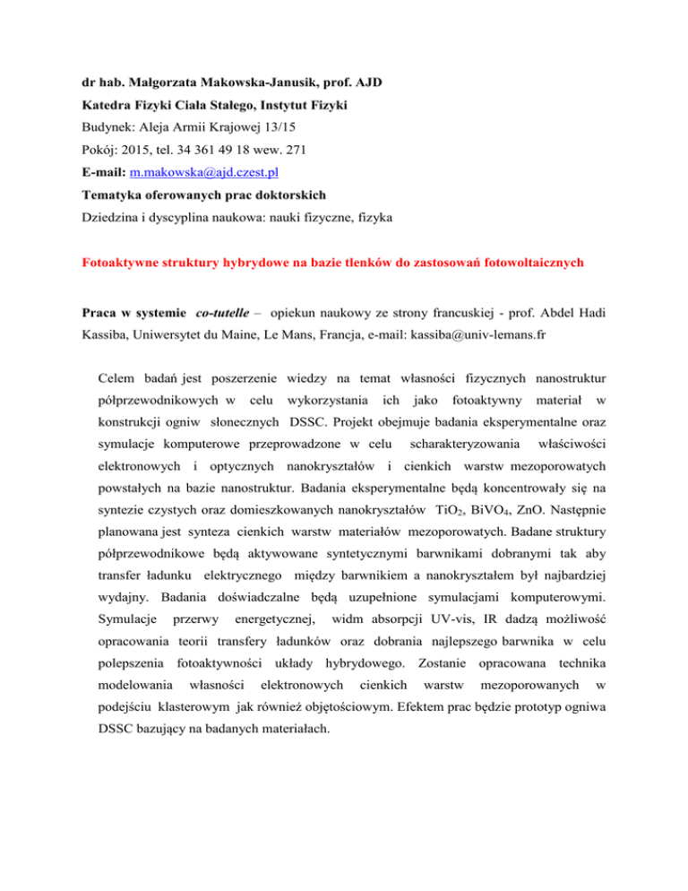 dr hab. Małgorzata Makowska-Janusik, prof. AJD Katedra Fizyki Ciała Stałego, Instytut Fizyki Budynek: Aleja Armii Krajowej 13/15 Pokój: 2015, tel. 34 361 49 18 wew. 271 E-mail: [email protected] Tematyka oferowanych prac doktorskich Dziedzina i dyscyplina naukowa: nauki fizyczne, fizyka Fotoaktywne struktury hybrydowe na bazie tlenków do zastosowań fotowoltaicznych Praca w systemie co-tutelle – opiekun naukowy ze strony francuskiej - prof. Abdel Hadi Kassiba, Uniwersytet du Maine, Le Mans, Francja, e-mail: [email protected] Celem badań jest poszerzenie wiedzy na temat własności fizycznych nanostruktur półprzewodnikowych w celu wykorzystania ich jako fotoaktywny materiał w konstrukcji ogniw słonecznych DSSC. Projekt obejmuje badania eksperymentalne oraz symulacje komputerowe przeprowadzone w celu scharakteryzowania właściwości elektronowych i optycznych nanokryształów i cienkich warstw mezoporowatych powstałych na bazie nanostruktur. Badania eksperymentalne będą koncentrowały się na syntezie czystych oraz domieszkowanych nanokryształów TiO2, BiVO4, ZnO. Następnie planowana jest synteza cienkich warstw materiałów mezoporowatych. Badane struktury półprzewodnikowe będą aktywowane syntetycznymi barwnikami dobranymi tak aby transfer ładunku elektrycznego między barwnikiem a nanokryształem był najbardziej wydajny. Badania doświadczalne będą uzupełnione symulacjami komputerowymi. Symulacje przerwy energetycznej, widm absorpcji UV-vis, IR dadzą możliwość opracowania teorii transfery ładunków oraz dobrania najlepszego barwnika w celu polepszenia fotoaktywności układy hybrydowego. Zostanie opracowana technika modelowania własności elektronowych cienkich warstw mezoporowanych w podejściu klasterowym jak również objętościowym. Efektem prac będzie prototyp ogniwa DSSC bazujący na badanych materiałach.