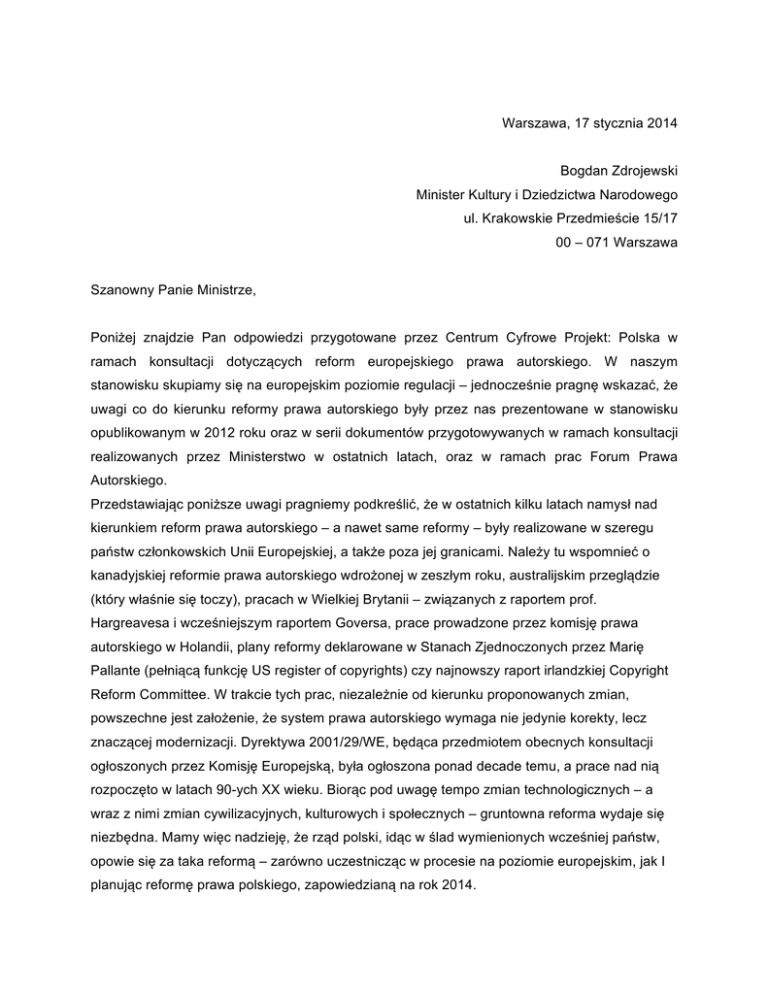 Warszawa, 17 stycznia 2014 Bogdan Zdrojewski Minister Kultury i Dziedzictwa Narodowego ul. Krakowskie Przedmieście 15/17 00 – 071 Warszawa Szanowny Panie Ministrze, Poniżej znajdzie Pan odpowiedzi przygotowane przez Centrum Cyfrowe Projekt: Polska w ramach konsultacji dotyczących reform europejskiego prawa autorskiego. W naszym stanowisku skupiamy się na europejskim poziomie regulacji – jednocześnie pragnę wskazać, że uwagi co do kierunku reformy prawa autorskiego były przez nas prezentowane w stanowisku opublikowanym w 2012 roku oraz w serii dokumentów przygotowywanych w ramach konsultacji realizowanych przez Ministerstwo w ostatnich latach, oraz w ramach prac Forum Prawa Autorskiego. Przedstawiając poniższe uwagi pragniemy podkreślić, że w ostatnich kilku latach namysł nad kierunkiem reform prawa autorskiego – a nawet same reformy – były realizowane w szeregu państw członkowskich Unii Europejskiej, a także poza jej granicami. Należy tu wspomnieć o kanadyjskiej reformie prawa autorskiego wdrożonej w zeszłym roku, australijskim przeglądzie (który właśnie się toczy), pracach w Wielkiej Brytanii – związanych z raportem prof. Hargreavesa i wcześniejszym raportem Goversa, prace prowadzone przez komisję prawa autorskiego w Holandii, plany reformy deklarowane w Stanach Zjednoczonych przez Marię Pallante (pełniącą funkcję US register of copyrights) czy najnowszy raport irlandzkiej Copyright Reform Committee. W trakcie tych prac, niezależnie od kierunku proponowanych zmian, powszechne jest założenie, że system prawa autorskiego wymaga nie jedynie korekty, lecz znaczącej modernizacji. Dyrektywa 2001/29/WE, będąca przedmiotem obecnych konsultacji ogłoszonych przez Komisję Europejską, była ogłoszona ponad decade temu, a prace nad nią rozpoczęto w latach 90-ych XX wieku. Biorąc pod uwagę tempo zmian technologicznych – a wraz z nimi zmian cywilizacyjnych, kulturowych i społecznych – gruntowna reforma wydaje się niezbędna. Mamy więc nadzieję, że rząd polski, idąc w ślad wymienionych wcześniej państw, opowie się za taka reformą – zarówno uczestnicząc w procesie na poziomie europejskim, jak I planując reformę prawa polskiego, zapowiedzianą na rok 2014. Chcemy też zwrócić uwagę na znaczenie badań o charakterze społecznym, ekonomicznym i kulturowym, pozwalających oprzeć planowaną reformę na faktycznej wiedzy o rzeczywistości i procesach, które prawo ma za zadanie regulować. Szczególnie istotne – a przy tym niezmiernie trudne – jest przeanalizowanie aspektów ekonomicznych obowiązującego dziś prawa autorskiego oraz jego zmian. Stoimy na stanowisku że analiza ekonomiczna powinna być podstawą definiowania na przykład okresu obowiązywania praw autorskich, zakresu dozwolonego użytku czy ochrony interesów posiadaczy praw. Pragniemy przypomnieć, że powołanie konsorcjum złożonego z organizacji rządowych i pozarządowych, którego zadaniem byłoby opracowanie takich analiz, było jednym z niewielu wspólnych rekomendacji międzysektorowych warsztatów dotyczących reformy prawa autorskiego, których współorganizatorem w 2012 roku było MKiDN. Doceniając ekspertyzy zamówione i częściowo upublicznione przez Państwa resort w 2013 roku, uważamy że nie mogą one zastąpić analiz prowadzonych przez dedykowany, międzysektorowy zespół. Ze względu na niezmiernie krótki okres konsultacji przesyłamy odpowiedzi jedynie na wybrane pytania. Jednocześnie pragniemy zwrócić uwagę, że jest to okres zbyt krótki (zostały one ogłoszone 23 grudnia 2013 roku z terminem odpowiedzi w ciągu dwudziestu dni – przy czym pierwszy tydzień konsultacji przypadał na okres świąteczny) – szczególnie biorąc pod uwagę szeroki zakres i złożoność konsultowanych kwestii. Rozumiejąc ograniczenia wynikające z terminów konsultacji ogłoszonych przez Komisję Europejską (które także były wskazywane przez wiele organizacji jako zbyt krótkie) zwracam się z uprzejmą prośbą, by w przyszłości konsultacje takie trwały dłużej. Poniżej przesyłam odpowiedzi na przedstawione do konsultacji pytania. I. Zakres i ochrona praw oraz funkcjonowanie jednolitego rynku UE I.1. Terytorialność prawa autorskiego 1. Czy terytorialny charakter prawa autorskiego stanowi utrudnienie przy świadczeniu bądź dostępie do legalnych usług online, zarówno z punktu widzenia licencjodawców, licencjobiorców jak i użytkowników końcowych (konsumentów)? Terytorialny charakter prawa autorskiego stanowi utrudnienie zarówno przy świadczeniu, jak i dostępie do usług online, gdyż różnice w zakresach praw obowiązujących w ramach wspólnego rynku powodują brak pewności prawnej. Ogranicza to zarówno rozwój Wspólnego Rynku Cyfrowego jak i pozarynkowe korzystanie z utworów – na przykład dostęp do zasobów dziedzictwa lub wyników badań. W szczególności terytorialny charakter prawa autorskiego utrudnia realizowanie transgranicznych działań mających z założenia korzystać z wyjątków i ograniczeń prawa autorskiego. Wreszcie różnice w zakresach obowiązujących praw są dużym wyzwaniem i źródłem niepewności dla użytkowników treści. W niedawno wydanej opinii Rzecznik Generalny Europejskiego Trybunału Sprawiedliwości stwierdza: „(…) w gestii państw członkowskich pozostawiono szerokie uprawnienia dyskrecjonalne, a wiele aspektów nie jest zharmonizowanych. Na przykład to, jaka rekompensata jest godziwa i w jaki sposób powinna być przewidziana? Samo istnienie 20 opcjonalnych wyjątków lub ograniczeń w odniesieniu do prawa do zwielokrotniania utworu, z których 17 obejmuje dalszą opcję dotyczącą godziwej rekompensaty, co jest dalekie od osiągnięcia jednolitości lub harmonizacji, zdaje się praktycznie oznaczać rezygnację z tych celów”1 2. Jakie trudności wiążą się z brakiem określenia terytorialnego zakresu korzystania z utworu w taki sposób, aby każdy m