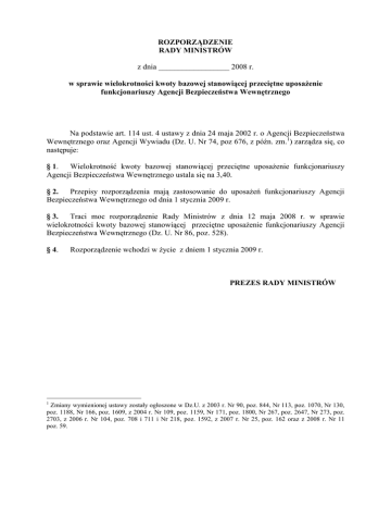 ROZPORZĄDZENIE RADY MINISTRÓW z dnia __________________ 2008 r. w sprawie wielokrotności kwoty bazowej stanowiącej przeciętne uposaŜenie funkcjonariuszy Agencji Bezpieczeństwa Wewnętrznego Na podstawie art. 114 ust. 4 ustawy z dnia 24 maja 2002 r. o Agencji Bezpieczeństwa Wewnętrznego oraz Agencji Wywiadu (Dz. U. Nr 74, poz 676, z późn. zm.1) zarządza się, co następuje: § 1. Wielokrotność kwoty bazowej stanowiącej przeciętne uposaŜenie funkcjonariuszy Agencji Bezpieczeństwa Wewnętrznego ustala się na 3,40. § 2. Przepisy rozporządzenia mają zastosowanie do uposaŜeń funkcjonariuszy Agencji Bezpieczeństwa Wewnętrznego od dnia 1 stycznia 2009 r. § 3. Traci moc rozporządzenie Rady Ministrów z dnia 12 maja 2008 r. w sprawie wielokrotności kwoty bazowej stanowiącej przeciętne uposaŜenie funkcjonariuszy Agencji Bezpieczeństwa Wewnętrznego (Dz. U. Nr 86, poz. 528). § 4. Rozporządzenie wchodzi w Ŝycie z dniem 1 stycznia 2009 r. PREZES RADY MINISTRÓW 1 Zmiany wymienionej ustawy zostały ogłoszone w Dz.U. z 2003 r. Nr 90, poz. 844, Nr 113, poz. 1070, Nr 130, poz. 1188, Nr 166, poz. 1609, z 2004 r. Nr 109, poz. 1159, Nr 171, poz. 1800, Nr 267, poz. 2647, Nr 273, poz. 2703, z 2006 r. Nr 104, poz. 708 i 711 i Nr 218, poz. 1592, z 2007 r. Nr 25, poz. 162 oraz z 2008 r. Nr 11 poz. 59. 2 UZASADNIENIE Projekt rozporządzenia Rady Ministrów w sprawie wielokrotności kwoty bazowej stanowiącej przeciętne uposaŜenie funkcjonariuszy Agencji Bezpieczeństwa Wewnętrznego został opracowany na podstawie delegacji art. 114 ust. 4 ustawy z dnia 24 maja 2002 r. o Agencji Bezpieczeństwa Wewnętrznego oraz Agencji Wywiadu (Dz. U. Nr 74, poz. 676, z późn. zm.). W projekcie rozporządzenia ustala się z dniem 1 stycznia 2009 r. wielokrotność kwoty bazowej w wysokości 3,40 co jednocześnie oznacza, Ŝe mnoŜnik ten będzie miał zastosowanie do uposaŜeń funkcjonariuszy Agencji Bezpieczeństwa Wewnętrznego na 2009 r. Obecnie wysokość tego wskaźnika wynosi 3,34. Ustalenie wielokrotności kwoty bazowej w wysokości 3,40 ma pełne zabezpieczenie w budŜecie ABW na rok przyszły bowiem przy uwzględnieniu kwoty bazowej na 2009 r. w wysokości 1.523, 29 zł oraz przyjętego limitu funkcjonariuszy ABW na rok bieŜący mnoŜnik ten pozwala określić fundusz wynagrodzeń funkcjonariuszy ABW w kwocie wynikającej z załącznika nr 10 do projektu ustawy budŜetowej na 2009 r., w części 57 budŜetu państwa – Agencja Bezpieczeństwa Wewnętrznego. Projekt rozporządzenia podlega udostępnieniu na stronie Biuletynu Informacji Publicznej, zgodnie z art. 5 ustawy z dnia 7 lipca 2005 r. o działalności lobbingowej w procesie stanowienia prawa (Dz. U. Nr 169, poz. 1414). OCENA SKUTÓW REGULACJI (OSR) 1. Podmioty, na które oddziałuje projekt aktu prawnego. Projektowane zmiany oddziałują na funkcjonariuszy Agencji Bezpieczeństwa Wewnętrznego. 2. Konsultacje społeczne. Ze względu na zakres regulacji, odnoszący się jedynie do funkcjonariuszy Agencji Bezpieczeństwa Wewnętrznego – nie jest konieczne poddawanie przedłoŜonego projektu rozporządzenia konsultacjom społecznym. 3. Wpływ regulacji na sektor finansów publicznych, w tym budŜet państwa i budŜety jednostek samorządu terytorialnego. Skutki finansowe związane z wprowadzeniem wielokrotności kwoty bazowej stanowiącej przeciętne uposaŜenie funkcjonariuszy ABW w wysokości 3,40 znajdują pokrycie w zaplanowanych na 2009 r. środkach budŜetowych przeznaczonych na fundusz uposaŜeń funkcjonariuszy ABW. Bowiem w projekcie ustawy budŜetowej na 2009 r. fundusz wynagrodzeń funkcjonariuszy ABW określony został w kwocie 341.142 tys. zł. na co składa się fundusz wynagrodzeń, łącznie z podwyŜkami w kwocie 327.369 tys. zł. oraz dodatkowe uposaŜenie roczne w kwocie 13.773 tys. zł. Planowane rozporządzeniem podwyŜszenie wielokrotności kwoty bazowej będzie wynosiło o 0,06 punktu bowiem z dotychczasowego wskaźnika w wysokości 3,34 osiągnie wielkość 3,40. 4. Wpływ regulacji na rynek pracy. Wejscie w Ŝycie rozporządzenia w sposób pośredni moŜe wpłynąć na sytuację na rynku pracy, gdyŜ wyŜszy poziom uposaŜenia moŜe skutkować w przyszłości większym zainteresowaniem słuŜbą w ABW. 5. Wpływ regulacji na konkurencyjność gospodarki i przedsiębiorczość, w tym na funkcjonowanie przedsiębiorstw, na sytuację i rozwój regionalny. Przedmiotowy projekt nie wywoła skutków społecznych, w szczególności mających wpływ na konkurencyjność gospodarki i przedsiębiorczość, w tym funkcjonowanie przedsiębiorstw, oraz sytuację i rozwój regionalny. 6. Zgodność regulacji z prawem Unii Europejskiej. Zakres rozporządzenia nie jest objęty prawem Unii Europejskiej.