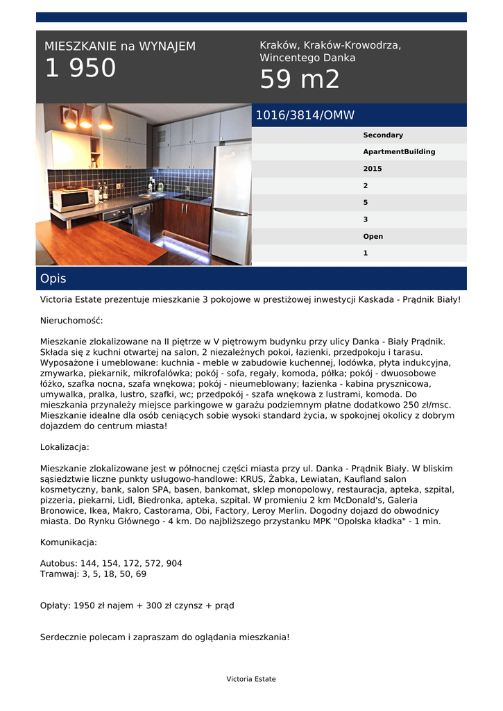 Kraków, Kraków-Krowodrza, Wincentego Danka MIESZKANIE na WYNAJEM 1 950 59 m2 1016/3814/OMW Secondary ApartmentBuilding 2015 2 5 3 Open 1 Opis Victoria Estate prezentuje mieszkanie 3 pokojowe w prestiżowej inwestycji Kaskada - Prądnik Biały! Nieruchomość: Mieszkanie zlokalizowane na II piętrze w V piętrowym budynku przy ulicy Danka - Biały Prądnik. Składa się z kuchni otwartej na salon, 2 niezależnych pokoi, łazienki, przedpokoju i tarasu. Wyposażone i umeblowane: kuchnia - meble w zabudowie kuchennej, lodówka, płyta indukcyjna, zmywarka, piekarnik, mikrofalówka; pokój - sofa, regały, komoda, półka; pokój - dwuosobowe łóżko, szafka nocna, szafa wnękowa; pokój - nieumeblowany; łazienka - kabina prysznicowa, umywalka, pralka, lustro, szafki, wc; przedpokój - szafa wnękowa z lustrami, komoda. Do mieszkania przynależy miejsce parkingowe w garażu podziemnym płatne dodatkowo 250 zł/msc. Mieszkanie idealne dla osób ceniących sobie wysoki standard życia, w spokojnej okolicy z dobrym dojazdem do centrum miasta! Lokalizacja: Mieszkanie zlokalizowane jest w północnej części miasta przy ul. Danka - Prądnik Biały. W bliskim sąsiedztwie liczne punkty usługowo-handlowe: KRUS, Żabka, Lewiatan, Kaufland salon kosmetyczny, bank, salon SPA, basen, bankomat, sklep monopolowy, restauracja, apteka, szpital, pizzeria, piekarni, Lidl, Biedronka, apteka, szpital. W promieniu 2 km McDonald's, Galeria Bronowice, Ikea, Makro, Castorama, Obi, Factory, Leroy Merlin. Dogodny dojazd do obwodnicy miasta. Do Rynku Głównego - 4 km. Do najbliższego przystanku MPK "Opolska kładka" - 1 min. Komunikacja: Autobus: 144, 154, 172, 572, 904 Tramwaj: 3, 5, 18, 50, 69 Opłaty: 1950 zł najem + 300 zł czynsz + prąd Serdecznie polecam i zapraszam do oglądania mieszkania! Victoria Estate Natalia Sujdak tel. +48 516 547 102 email: [email protected] Victoria Estate Powered by TCPDF (www.tcpdf.org)