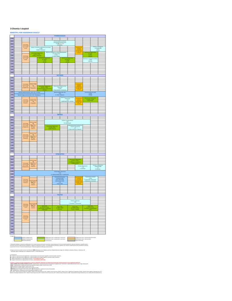 3 Chemia I stopień SEMESTR 6, ROK AKADEMICKI 2016/17 PONIEDZIAŁEK 07.00 08.00 09.00 10.00 Technologia chemiczna (I) gr. 1, s.F06 T.Janiak 11.00 12.00 13.00 14.00 Technologia chemiczna (I) gr. 2, s.F06 T.Janiak Kontrola jakości surowców i produktów kosmetycznych s.D2 (I) 8.30-10.00 B.Grobelna Chemia i biochemia wybranych biomolekuł s.C109 K.Rolka, P.Rekowski Seminarium dyplomowe gr. KB, s.C109, K.Rolka, P.Rekowski Aktywność biologiczna i synteza glikopeptydów i ich prekursorów s. F101 A. Prahl, J. Madaj Seminarium dyplomowe gr. KChO I, s. F101, A.Prahl 15.00 Kontrola jakości surowców i produktów kosmetycznych gr.1 (I), s.F209 A.Cirocka Seminarium dyplomowe gr. KChO II, s. C109, J.Madaj Chemia i radiochemia środowiska (II) s.G317 T.Puzyn Seminarium dyplomowe gr. KChT, s.C309, P.Skurski Rozmowy o strukturze molekuł s.C309 P.Skurski 16.00 17.00 18.00 19.00 WTOREK 07.00 08.00 09.00 10.00 Technologia chemiczna (I) gr. 3, s.F06 A.Gołąbiewska 11.00 Biotechnologia żywności (chż) (II) Seminarium dyplomowe gr. 1, s.G237 gr.KTŚ I, s.F201, Z.Maćkiewicz A. Bielicka-Giełdoń, A.Pieczyńska, J. Nadolna 12.00 Kontrola jakości żywności (chż) s.F8, R.Tylingo 13.00 Biotechnologia żywności (chż) s.F8, Z.Maćkiewicz Biotechnologia (chb, chk) s.D3 W. Śledź , B.Banecki 14.00 15.00 16.00 Technologia chemiczna (I) gr. 4, s.F06 D.Wileńska Kontrola jakości surowców i produktów kosmetycznych gr.2 (I), s.F209 A.Cirocka Nowoczesne metody syntezy chemicznej s.C109 F.Kasprzykowski, E.Jankowska Chemia praktyczna (aid) s.D102 J.Madaj Nowoczesne techniki analizy środowiska s.F8 A.Białk-Bielińska, Ł.Haliński Biotechnologia żywności (chż) (II) gr. 2, s.G237 E.Czajkowska Kontrola jakości surowców i produktów kosmetycznych gr.3 (I), s.F209 A.Cirocka Seminarium dyplomowe gr. KChF, s.C209 K.Krzymiński 17.00 18.00 19.00 ŚRODA 07.00 08.00 09.00 10.00 Technologia chemiczna (I) gr. 5, s.F06 A.Gołąbiewska Biotechnologia (II) (chb, chk) gr. 1 MWB-s.024 W. Śledź, B.Banecki Technologia chemiczna (I) gr. 6, s.F06 D.Wileńska Biotechnologia (II) (chb, chk) gr. 2 MWB-s.024 W. Śledź, B.Banecki 11.00 Chemia a społeczeństwo s.D1 M. Kwiatkowski Seminarium dyplomowe gr. KAŚ, s.F101, A.Białk-Bielińska Podstawy genetyki molekularnej i inżynierii genetycznej s.F7 A.Żylicz-Stachula, P.Skowron 12.00 13.00 14.00 15.00 16.00 17.00 18.00 19.00 CZWARTEK 07.00 08.00 09.00 10.00 Technologia chemiczna (I) gr. 7, s.F06 A.Gołąbiewska Seminarium dyplomowe gr.KTŚ II, s.F201, E.Siedlecka, E. Grabowska, A.Malankowska Biotechnologia (II) (chb, chk) gr. 3 MWB-s.024 W. Śledź, B.Banecki Energia Odnawialna s. D3 E. Siedlecka 11.00 12.00 Technologia chemiczna s.D3 A. Zaleska-Medyńska, E. Grabowska 13.00 14.00 15.00 16.00 Chemia i radiochemia środowiska (I) s.F7 B. Skwarzec Technologia chemiczna (I) gr. 8, s.F06 D.Wileńska 17.00 Przemysł kosmetyczny w praktyce (chk) w dn.: 9.03; 23.03; 13.04; 20.04 i 04.05. s.D3 K.Grużewska Biotechnologia (II) (chb, chk) gr. 4 MWB-s.024 W. Śledź, B.Banecki Kontrola jakości surowców i produktów kosmetycznych gr.4 (I), s.F209 B.Grobelna Fizykochemia molekuł s.C313 K. Krzymiński, P.Storoniak, B.Zadykowicz, A.Sikorski 18.00 19.00 PIĄTEK 07.00 08.00 09.00 10.00 Technologia chemiczna (I) gr. 9, s.F06 T.Janiak 11.00 Biotechnologia (II) (chb, chk) gr. 5 MWB-s.024 W. Śledź, B.Banecki Chemia roztworów s.D3 T. Ossowski, L.Chmurzyński Semin.dypl. gr. KChOiN, s.C209, L.Chmurzyński, A.Chylewska, J.Makowska Semin.dypl. gr. KBM, s.F201 P.Skowron Semin.dypl. gr. KChRŚ, s.F301, T.Puzyn, K.Jagiełło Semin.dypl. gr. KChA, s.C212 T.Ossowski, D.Zarzeczańska, J.Kira 12.00 13.00 14.00 Technologia chemiczna (I) gr. 10, s.F06 T.Janiak 15.00 16.00 17.00 18.00 19.00 1. Legenda: wykłady obligatoryjne; wykłady fakultatywne; lektoraty językowe obligatoryjne ćwicz. audytoryjne i seminaria; fakultatywne ćwicz. audytoryjne i seminaria; konwersatoria obligatoryjne ćwicz. laboratoryjne/terenowe fakultatywne ćwicz. laboratoryjne zajęcia terenowe 2. Wszystkie wykłady i ćwiczenia audytoryjne (o ile nie jest inaczej zaznaczone na planie) rozpoczynają się 15 minut po pełnej godzinie, jaka jest wskazana na grafiku planu, natomiast ćwiczenia laboratoryjne dokładnie o godzinie wskazanej na planie. Po każdej godzinie lekcyjnej wykładu oraz ćwiczeń audytoryjnych jest przewidziana przerwa w wymiarze 15 minut. Ćwiczenia laboratoryjne i lektoraty językowe odbywają się bez przerw. 3. Zajęcia oznaczone przed numerem sali literami MWB odbywają się na Międzyuczelniany Wydział Biotechnologii UG i GUMed w Gdańsku-Oliwie ul. Abrahama 58 pozostałe zajęcia odbywają się na Wydziale Chemii, ul. Wita Stwosza 63. 4. Oznaczenia: (n) - zajęcia w naprzemiennych tygodniach, rozpoczynające się w pierwszym tygodniu semestru/części semestru, (p) - zajęcia w naprzemiennych tygodniach, rozpoczynające się w drugim tygodniu semestru/części semestru; (I) - zajęcia realizowane w I-szej połowie semestru; od 13 lutego 2017 roku (II) - zajęcia realizowane w II-giej połowie semestru; od 10 kwietnia 2017 roku 5. Zajęcia w ramach pracowni dyplomowej w wymiarze 60 godzin odbywają się według harmonogramów obowiązujących w poszczególnych Katedrach: - KChA, KChBM, KChF, KChiRŚ, KChOiN oraz KTŚ: indywidualnie z opiekunem pracy licencjackiej w uzgodnionych terminach i salach/laboratoriach przez niego wskazanych. - KChO: indywidualnie z opiekunem pracy licencjackiej w piątki w godz. 10.00-14.30 s.C108 - KChT: grupowo w piątki w godz. 10.00-14.30 s.C311 - KAŚ: grupowo w piątki w godz. 10.00-14.30 s.F108 (od 10.03) - KBM: (I) grupowo w piątki 12.00-16.30 s.G237; (II) indywidualnie z opiekunem pracy licencjackiej - KB: indywidualnie z opiekunem pracy licencjackiej w piątki w s.C103 gdzie: KChA - Katedra Chemii Analitycznej, KChBM - Katedra Chemii Biomedycznej, KChF - Katedra Chemii Fizycznej, KChiRŚ - Katedra Chemii i Radiochemii Środowiska, KChOiN - Katedra Chemii Ogólnej 