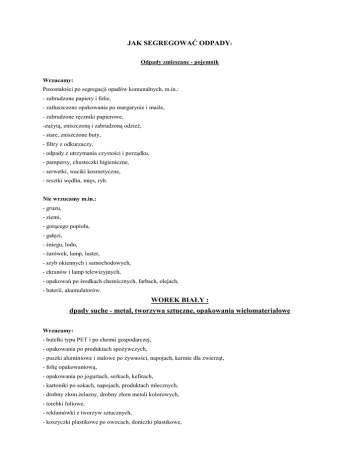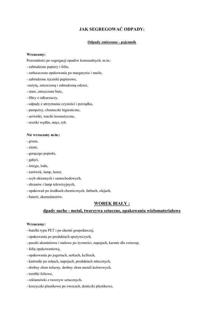 JAK SEGREGOWAĆ ODPADY: Odpady zmieszane - pojemnik Wrzucamy: Pozostałości po segregacji opadów komunalnych, m.in.: - zabrudzone papiery i folie, - zatłuszczone opakowania po margarynie i maśle, - zabrudzone ręczniki papierowe, -zużytą, zniszczoną i zabrudzoną odzież, - stare, zniszczone buty, - filtry z odkurzaczy, - odpady z utrzymania czystości i porządku, - pampersy, chusteczki higieniczne, - serwetki, waciki kosmetyczne, - resztki wędlin, mięs, ryb. Nie wrzucamy m.in.: - gruzu, - ziemi, - gorącego popiołu, - gałęzi, - śniegu, lodu, - żarówek, lamp, luster, - szyb okiennych i samochodowych, - ekranów i lamp telewizyjnych, - opakowań po środkach chemicznych, farbach, olejach, - baterii, akumulatorów. WOREK BIAŁY : dpady suche - metal, tworzywa sztuczne, opakowania wielomateriałowe Wrzucamy: - butelki typu PET i po chemii gospodarczej, - opakowania po produktach spożywczych, - puszki aluminiowe i stalowe po żywności, napojach, karmie dla zwierząt, - folię opakowaniową, - opakowania po jogurtach, serkach, kefirach, - kartoniki po sokach, napojach, produktach mlecznych, - drobny złom żelazny, drobny złom metali kolorowych, - torebki foliowe, - reklamówki z tworzyw sztucznych, - koszyczki plastikowe po owocach, doniczki plastikowe, - czyste karnistry plastikowe. Nie wrzucamy m.in.: - tworzyw piankowych, silikonów, gum, styropianu - pojemników po środkach chemicznych, farbach, olejach, smarach - tworzyw sztucznych zastosowania medycznego. Pamiętaj! Odkręć nakrętkę, usuń resztki produktów z opakowań, zgnieć opakowanie, a kartony, torebki papierowe złóż na płasko!!! WOREK ZIELONY: Odpady szklane – szkło opakowaniowe Wrzucamy: - opakowania szklane, - białe i kolorowe butelki po: napojach, sokach, alkoholach, żywności, - słoiki po dżemach i przetworach, - szklane opakowania po kosmetykach. Nie wrzucamy m.in.: - porcelany, ceramiki, szkła stołowego, - zniczy szklanych, - żarówek, lamp, reflektorów, luster, - szyb okiennych i samochodowych, - opakowań po lekach, - kineskopów, - opakowań szklanych z jakąkolwiek zawartością. Pamiętaj! Z opakowań szklanych należy usunąć zakrętki, przykrywki, kapsle oraz korki!!! WOREK NIEBIESKI: Papier Wrzucamy: - gazety, papier, książki, zeszyty, - kartony i pudła kartonowe, - katalogi i ulotki, - worki papierowe, - ścinki drukarskie. Nie wrzucamy m.in.: - papieru przebitkowego (kalka), - tłustego papieru, np. po maśle, - zużytych pampersów, - zużytych papierów higienicznych, - opakowań z zawartością, np. żywnością, wapnem, cementem, - lakierowanego lub foliowanego papieru z folderów reklamowych. Pamiętaj! Papier nie może być mokry. Papier nie może być zanieczyszczony przez kleje, farby, pleśń oraz grzyby!!! WOREK BRĄZOWY: Odpady komunalne ulegające biodegradacji Wrzucamy: - odpady kuchenne, np.: resztki owoców, warzyw, produktów mlecznych, skorupki jaj, łupiny orzechów, - fusy po kawie, herbacie razem z filtrem papierowym, - ściętą trawę, chwasty, - liście, - drobne gałązki, - spady owocowe, - zwiędłe kwiaty cięte, doniczkowe, - ziemię z doniczek. Nie wrzucamy: - resztek mięs, wędlin, ryb, kości, - kamieni i ziemi innej niż z doniczek.