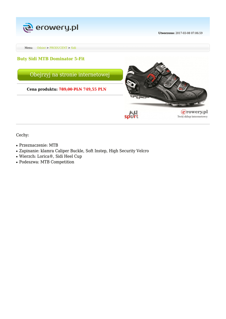 Utworzono: 2017-03-08 07:06:59 Menu: Odzież > PRODUCENT > Sidi Buty Sidi MTB Dominator 5-Fit Obejrzyj na stronie internetowej Cena produktu: 789,00 PLN 749,55 PLN Cechy: ● ● ● ● Przeznaczenie: MTB Zapinanie: klamra Caliper Buckle, Soft Instep, High Security Velcro Wierzch: Lorica®, Sidi Heel Cup Podeszwa: MTB Competition W 1960 firma Sidi rozpoczęła działalność jako warsztat produkcji obuwia sportowo-górskiego. Od 1970 roku Sidi specjalizuje się w obuwiu kolarskim, motocyklowym i butach do jazdy terenowej. Dino Signori, założyciel Sidi, łączy w sobie pasję do jazdy z ponad 50-cio letnim doświadczeniem w produkcji innowacyjnego obuwia sportowego. Dzięki tej pasji i głębokiej,intuicyjnej wiedzy, Sidi stała się liderem na rynku rowerowych i motocyklowych butów. Tradycyjne wartości i zaangażowanie w połączeniu z wydajną, międzynarodową siecią dystrybucji sprawiają że Sidi to firma, która jest obecna na całym świecie. Ze względu na wysoką jakość, obuwie Sidi zostało wybrane przez miliony sportowców. Przez lata Sidi wypracowała sobie własną, niezawodną technikę, która pozwala na osiągnięcie maksymalnej niezawodności i komfortu. Łącząc innowacje z półwieczem doświadczeń, Sidi to czysta pasja, która sprawia że nie jest tylko zwyczajną firmą. Przeznaczenie Marka Sidi Podeszwa Kolor MTB Turystyczne Tworzywo sztuczne - Mimo dołożenia wszelkich starań nie gwarantujemy, że publikowane opisy i specyfikacje techniczne niezawierają uchybień lub błędów, które nie mogą jednak być podstawą do roszczeń. W przypadku jakichkolwiek wątpliwości, przed podjęciem decyzji prosimy o kontakt. Adres: www.erowery.pl Telefon: 605 515 185, 34 361 16 71 Email: [email protected]