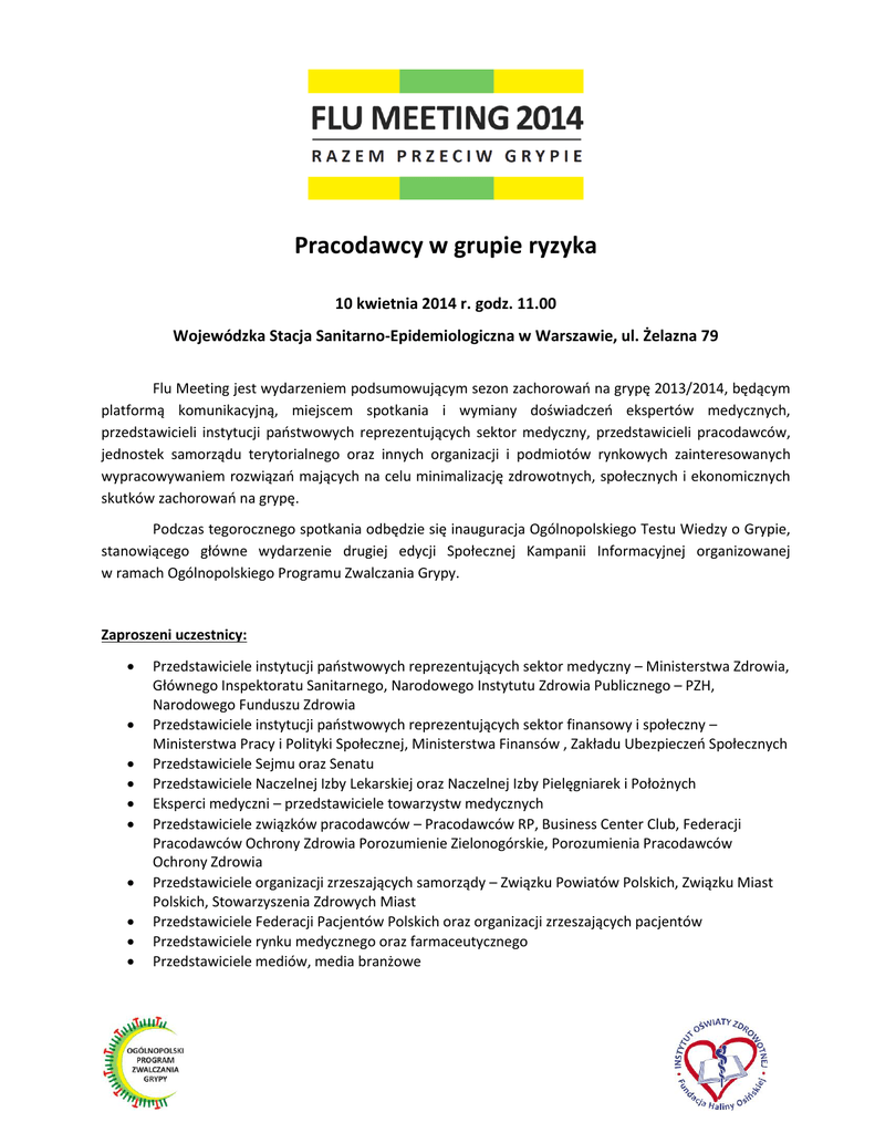 Pracodawcy w grupie ryzyka 10 kwietnia 2014 r. godz. 11.00 Wojewódzka Stacja Sanitarno-Epidemiologiczna w Warszawie, ul. Żelazna 79 Flu Meeting jest wydarzeniem podsumowującym sezon zachorowań na grypę 2013/2014, będącym platformą komunikacyjną, miejscem spotkania i wymiany doświadczeń ekspertów medycznych, przedstawicieli instytucji państwowych reprezentujących sektor medyczny, przedstawicieli pracodawców, jednostek samorządu terytorialnego oraz innych organizacji i podmiotów rynkowych zainteresowanych wypracowywaniem rozwiązań mających na celu minimalizację zdrowotnych, społecznych i ekonomicznych skutków zachorowań na grypę. Podczas tegorocznego spotkania odbędzie się inauguracja Ogólnopolskiego Testu Wiedzy o Grypie, stanowiącego główne wydarzenie drugiej edycji Społecznej Kampanii Informacyjnej organizowanej w ramach Ogólnopolskiego Programu Zwalczania Grypy. Zaproszeni uczestnicy: Przedstawiciele instytucji państwowych reprezentujących sektor medyczny – Ministerstwa Zdrowia, Głównego Inspektoratu Sanitarnego, Narodowego Instytutu Zdrowia Publicznego – PZH, Narodowego Funduszu Zdrowia Przedstawiciele instytucji państwowych reprezentujących sektor finansowy i społeczny – Ministerstwa Pracy i Polityki Społecznej, Ministerstwa Finansów , Zakładu Ubezpieczeń Społecznych Przedstawiciele Sejmu oraz Senatu Przedstawiciele Naczelnej Izby Lekarskiej oraz Naczelnej Izby Pielęgniarek i Położnych Eksperci medyczni – przedstawiciele towarzystw medycznych Przedstawiciele związków pracodawców – Pracodawców RP, Business Center Club, Federacji Pracodawców Ochrony Zdrowia Porozumienie Zielonogórskie, Porozumienia Pracodawców Ochrony Zdrowia Przedstawiciele organizacji zrzeszających samorządy – Związku Powiatów Polskich, Związku Miast Polskich, Stowarzyszenia Zdrowych Miast Przedstawiciele Federacji Pacjentów Polskich oraz organizacji zrzeszających pacjentów Przedstawiciele rynku medycznego oraz farmaceutycznego Przedstawiciele mediów, media branżowe PROGRAM KONFERENCJI: 11:00 - 11.30 – Przywitanie gości i otwarcie spotkania Prof. Adam Antczak, Dziekan Wydziału Lekarskiego Uniwersytetu Medycznego w Łodzi Wystąpienia gości honorowych: Igor Radziewicz-Winnicki, Sekretarz Stanu w Ministerstwie Zdrowia (oczekiwanie na potwierdzenie) Marek Posobkiewicz, Główny Inspektor Sanitarny Dr Andrzej Mądrala, v-ce Prezydent Pracodawców RP Prof. Andrzej Wojtczak, Przewodniczący Rady Sanitarno-Epidemiologicznej (oczekiwanie na potwierdzenie) 11.30 - 11.45 – Status działań Ogólnopolskiego Programu Zwalczania Grypy Prof. Adam Antczak, Dziekan Wydziału Lekarskiego Uniwersytetu Medycznego w Łodzi 11.45 - 12.00 – Epidemiologia grypy – podsumowanie sezonu zachorowań 2013/2014 Prof. Andrzej Zieliński (oczekiwanie na potwierdzenie) 12.00 - 12.15 – Nadzór epidemiologiczny nad grypą w Polsce Marek Posobkiewicz, Główny Inspektor Sanitarny 12.15 - 12.30 – Pracodawcy w grupie ryzyka – bariery promocji profilaktyki grypy przez pracodawców Dr n. med. Grzegorz Juszczyk, Warszawski Uniwersytet Medyczny 12.30 - 12.45 – Budowanie motywacji do szczepień przeciw grypie wśród pracowników ochrony zdrowia – punkt widzenia pracodawcy Dr Bożena Janicka, Porozumienie Pracodawców Ochrony Zdrowia (oczekiwanie na potwierdzenie) 12.45 - 13.00 - Procedury AOTM w realizacji samorządowych programów zdrowotnych Marek Wójcik, Związek Powiatów Polskich 13.00 - 13.30 – Inauguracja Ogólnopolskiego Testu Wiedzy o Grypie Dr hab. n. med. Aneta Nitsch-Osuch, Warszawski Uniwersytet Medyczny, Dr n. med. Agnieszka Mastalerz-Migas, Uniwersytet Medyczny we Wrocławiu 13.30 - 14.00 – Podsumowanie konferencji, zakończenie spotkania. Zaproszenie na poczęstunek