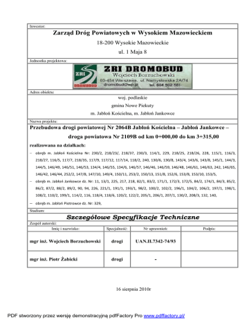 Inwestor: Zarząd Dróg Powiatowych w Wysokiem Mazowieckiem 18-200 Wysokie Mazowieckie ul. 1 Maja 8 Jednostka projektowa: Adres obiektu: woj. podlaskie gmina Nowe Piekuty m. Jabłoń Kościelna, m. Jabłoń Jankowce Nazwa projektu: Przebudowa drogi powiatowej Nr 2064B Jabłoń Kościelna – Jabłoń Jankowce – droga powiatowa Nr 2109B od km 0+000,00 do km 3+315,00 realizowana na działkach: − obręb m. Jabłoń Kościelna Nr: 230/2, 218/23/, 218/37, 230/3, 114/1, 229, 218/25, 218/26, 228, 115/1, 116/3, 218/27, 116/5, 117/7, 218/35, 117/9, 117/12, 117/14, 118/2, 240, 130/6, 130/8, 143/4, 143/6, 143/8, 145/1, 144/3, 144/5, 146/49, 146/51, 146/53, 134/4, 146/55, 134/6, 146/57, 146/46, 146/59, 146/48, 146/61, 146/63, 242, 146/65, 146/42, 146/44, 252/2, 147/8, 147/10, 149/4, 150/11, 253/2, 150/13, 151/8, 152/6, 153/8, 153/10, 153/5, − obręb m. Jabłoń Jankowce dz. Nr: 11, 13/1, 225, 217, 218, 82/1, 83/2, 171/1, 172/3, 172/5, 84/2, 174/1, 84/3, 85/2, 86/2, 87/2, 88/2, 89/2, 90, 94, 226, 221/1, 191/1, 193/1, 98/2, 100/2, 102/2, 196/1, 104/2, 106/2, 197/1, 198/1, 108/2, 110/2, 199/1, 114/2, 116, 118/4, 118/6, 120/2, 122/2, 205/1, 206/1, 207/1, 130/2, 208/3, 132, 140, − obręb m. Jabłoń Piotrowce dz. Nr: 329, Stadium: Szczegółowe Specyfikacje Techniczne Zespół autorski: Imię i nazwisko: Specjalność: Nr uprawnień: mgr inż. Wojciech Borzuchowski drogi UAN.II.7342-74/93 mgr inż. Piotr Żabicki drogi - 16 sierpnia 2010r PDF stworzony przez wersję demonstracyjną pdfFactory Pro www.pdffactory.pl/ Podpis: SPIS SZCZEGÓŁOWYCH SPECYFIKACJI TECHNICZNYCH 1. D.M.00.00.00 Wymagania ogólne 2. D.01.01.01 Odtworzenie trasy i punktów wysokościowych str.15 3. D.01.02.01 Usunięcie drzew i krzaków str.19 4. D.01.02.02 Zdjęcie warstwy humusu str.23 5. D.01.02.03 Rozbiórki obiektów kubaturowych str.25 6. D.01.02.04 Rozbiórki elementów dróg str.29 7. D.02.01.01 Wykonanie wykopów w gruntach kat. I-IV str.33 8. D.02.03.01 Wykonanie nasypów str.39 9. D.03.01.03 Czyszczenie urządzeń odwadniających str.45 10. D.03.02.01A Regulacja pionowa studzienek urządzeń podziemnych str.47 11. D.04.03.01 Oczyszczenie i skropienie warstw konstrukcyjnych str.51 12. D.04.04.01 Podbudowa z kruszywa naturalnego stab. mechanicznie str.57 13. D.04.04.02 Podbudowa z kruszywa łamanego stab. mechanicznie str.63 14. D.04.07.01 Podbudowa z betonu asfaltowego str.69 15. D.05.03.05 Nawierzchnia z betonu asfaltowego str.99 16. D.05.03.23 Nawierzchnia z kostki betonowej brukowej str.133 17. D.06.01.01 Umocnienie skarp brukiem, rowów i ułożenie ścieków str.139 18. D.06.02.01 Przepusty pod zjazdami. str.145 19. D.07.01.01 Oznakowanie poziome str.149 20. D.07.02.01 Oznakowanie pionowe str.157 21. D.07.06.02 Urządzenia zabezpieczające ruch pieszych str.167 22. D.08.01.01 Krawężniki betonowe str.173 23. D.08.02.02 Chodniki z kostek brukowych betonowych str.179 24. D.08.03.01 Obrzeża betonowe str.185 25. D.08.05.01 Nawierzchnie na przejazdach kolejowych str.189 ZRI DROMOBUD PDF stworzony przez wersję demonstracyjną pdfFactory Pro www.pdffactory.pl/ str.3 2 D-M-00.00.00 Wymagania ogólne SZCZEGÓŁOWA SPECYFIKACJA TECHNICZNA D-M-00.00.00 WYMAGANIA OGÓLNE 1. WSTĘP Roboty objęte zakresem n/n Szczegółowej Specyfikacji Technicznej opisane są następującym kodem CPV: KOD CPV: 45233000-9 1.1. Przedmiot Szczegółowej Specyfikacji Technicznej Szczegółowa Specyfikacja Techniczna D.M.00.00.00 - “Wymagania Ogólne” odnosi się do wymagań wspólnych dla poszczególnych wymagań technicznych dotyczących wykonania i odbioru robót, które zostaną wykonane w ramach przebudowy drogi powiatowej Nr 2064B Jabłoń Kościelna – Jabłoń Jankowce – droga powiatowa Nr 2109B od km 0+000,00 do km 1+255,85 – odcinek I, od km 1+255,85 do km 1+336,55 – odcinek II oraz od km 1+336,55 do km 3+315,00 – odcinek III. 1.2. Zakres stosowania SST Szczegółowa Specyfikacja Techniczna jest stosowana jako dokument przetargowy i kontraktowy przy zlecaniu i realizacji robót wymienionych w pkt. 1.1. 1.3. Zakres robót objętych SST Ustalenia zawarte w n/n SST obejmują wymagania wspólne dla robót objętych niżej wymienionymi Szczegółowymi Specyfikacjami Technicznymi: D.01.01.01 Odtworzenie trasy i punktów wysokościowych D.01.02.01 Usunięcie drzew i krzaków D.01.02.02 Zdjęcie warstwy humusu D.01.02.03 Rozbiórki obiektów kubaturowych D.01.02.04 Rozbiórki elementów dróg D.02.01.01 Wykonanie wykopów w gruntach kat. I-IV D.02.03.01 Wykonanie nasypów D.03.01.03 Czyszczenie urządzeń odwadniających D.03.02.01A Regulacja pionowa studzienek urządzeń podziemnych D.04.03.01 Oczyszczenie i skropienie warstw konstrukcyjnych D.04.04.01 Podbudowa z kruszywa naturalnego stabilizowanego mechanicznie D.04.04.02 Podbudowa z kruszywa łamanego stabilizowanego mechanicznie D.04.07.01 Podbudowa z betonu asfaltowego D.05.03.05 Nawierzchnia z betonu asfaltowego D.05.03.23 Nawierzchnia z kostki betonowej brukowej D.06.01.02 Umocnienie skarp brukiem, rowów i ułożenie ścieków D.06.02.01 Przepusty pod zjazdami D.07.01.01 Oznakowanie poziome D.07.02.01 Oznakowanie pionowe D.07.06.02 Urządzenia zabezpieczające ruch pieszych D.08.01.01 Krawężniki betonowe D.08.02.02 Chodniki z kostek betonowych brukowych D.08.03.01 Obrzeza betonowe D.10.04.01 Nawierzchnia na przejazdach kolejowych 1.4. Określenia podstawowe Użyte w SST wymienione poniżej określenia należy rozumieć w każdym przypadku następująco: 1.4.1. Budowla drogowa - obiekt budowlany, nie będący budynkiem, stanowiący całość techniczno-użytkową (drogę) albo jego część stanowiąca odrębny element konstrukcyjny lub technologiczny (obiekt mostowy, korpus ziemny, węzeł) ZRI DROMOBUD PDF stworzony przez wersję demonstracyjną pdfFactory Pro www.pdffactory.pl/ 3 D-M-00.00.00 Wymagania ogólne 1.4.2. 1.4.3. 1.4.4. 1.4.5. 1.4.6. 1.4.7. 1.4.8. 1.4.9. 1.4.10. 1.4.11. 1.4.12. 1.4.13. 1.4.14. 1.4.15. 1.4.16. 1.4.17. 1.4.18. 1.4.19. 1.4.20. 1.4.21. 1.4