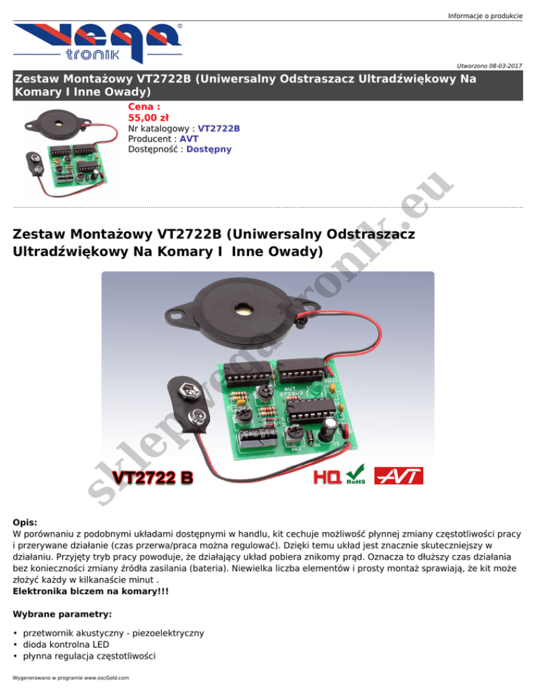 Informacje o produkcie Utworzono 08-03-2017 Zestaw Montażowy VT2722B (Uniwersalny Odstraszacz Ultradźwiękowy Na Komary I Inne Owady) Cena : 55,00 zł k. eu Nr katalogowy : VT2722B Producent : AVT Dostępność : Dostępny sk le p. ve g atr on i Zestaw Montażowy VT2722B (Uniwersalny Odstraszacz Ultradźwiękowy Na Komary I Inne Owady) Opis: W porównaniu z podobnymi układami dostępnymi w handlu, kit cechuje możliwość płynnej zmiany częstotliwości pracy i przerywane działanie (czas przerwa/praca można regulować). Dzięki temu układ jest znacznie skuteczniejszy w działaniu. Przyjęty tryb pracy powoduje, że działający układ pobiera znikomy prąd. Oznacza to dłuższy czas działania bez konieczności zmiany źródła zasilania (bateria). Niewielka liczba elementów i prosty montaż sprawiają, że kit może złożyć każdy w kilkanaście minut . Elektronika biczem na komary!!! Wybrane parametry: • przetwornik akustyczny - piezoelektryczny • dioda kontrolna LED • płynna regulacja częstotliwości Wygenerowano w programie www.oscGold.com • płynna regulacja czasu trwania i przerwy sygnału • zasilanie 6..18 VDC. Sugerowane zasilanie: 1 akumulator lub bateria 9V • wymiary płytki: 50×49 mm w zestawie płytka drukowana, komplet elementów i dokumentacja zestaw w wersji B do zlutowania ● ● sk le p. ve g atr on i k. eu Dokumentacja >> LINK <<