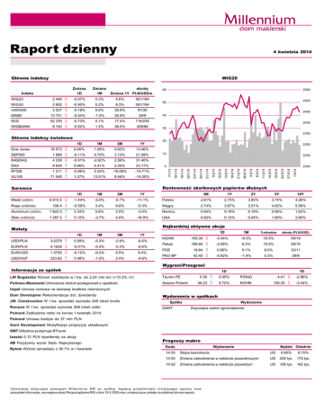 Raport dzienny 4 kwietnia 2014 Gł€wne indeksy WIG20 Indeks Zmiana 1D Zmiana 1M obroty Zmiana 1Y PLN/USDm WIG20 2 449 -0.97% 0.3% 4.6% 561/184 WIG30 2 602 -0.90% 0.2% 8.3% 591/194 mWIG40 3 527 -0.18% 0.6% 35.9% 91/30 MIS80 13 731 -0.54% -1.4% 26.9% 29/9 WIG 52 376 -0.73% 0.1% 17.4% 716/235 8 740 -0.92% 1.2% 38.6% 208/68 WIGBANKI 60 2550 2500 50 2450 40 2400 30 2350 Gł€wne indeksy światowe 20 1D 1M 3M 1Y 16 573 0.00% 1.08% 0.62% 13.46% S&P500 1 889 -0.11% 0.79% 3.13% 21.08% NASDAQ 4 238 -0.91% -2.62% 2.56% 31.40% DAX 9 629 0.06% 0.41% 2.05% 23.17% RTSI$ 1 211 -0.96% 2.24% -16.08% -14.71% XU100 71 545 1.27% 13.51% 8.46% -14.05% 1D 1M 3M 1Y 3M 1Y 2Y 5Y 10Y 6 610.5 -1.44% -5.0% -9.7% -11.1% Polska 2.61% 2.75% 3.00% 3.74% 4.26% Ropa (USD/bbl) 10 2250 1/4/14 27/3/14 24/3/14 19/3/14 14/3/14 6/3/14 11/3/14 3/3/14 26/2/14 21/2/14 18/2/14 13/2/14 5/2/14 10/2/14 31/1/14 28/1/14 23/1/14 20/1/14 15/1/14 2200 7/1/14 0 Rentowność skarbowych papier€w dłużnych Surowce Miedź (USD/t) 2300 10/1/14 Dow Jones 109.4 -0.59% 3.4% 9.6% -0.3% Węgry 2.74% 3.07% 3.51% 4.82% 5.58% Aluminium (USD/t) 1 822.5 0.33% 5.8% 2.0% -3.0% Niemcy 0.04% 0.16% 0.19% 0.68% 1.62% Złoto (USD/OZ) 1 287.2 0.12% -3.7% 4.0% -16.9% USA 0.02% 0.12% 0.45% 1.80% 2.80% Najbardziej aktywne akcje Waluty 1D 1M 3M 1Y USD/PLN 3.0378 0.09% -0.3% -0.8% -6.6% EUR/PLN 4.1638 -0.01% -0.5% -0.3% -0.6% EUR/USD 1.3705 -0.12% -0.2% 0.5% 6.4% USD/HUF 223.92 0.48% -1.5% 2.4% -4.6% 1D 1M % obrot•w obroty (PLN/USD) KGHM 105.30 -3.44% -9.3% 10.5% 59/19 Pekao 195.60 -2.08% 6.3% 10.5% 59/19 PGE 19.84 0.66% 9.1% 6.0% 33/11 PKO BP 42.40 -0.82% -1.4% 5.3% 29/9 Wygrani/Przegrani Informacje ze sp€łek 1D LW Bogdanka Wzrost wydobycia w I kw. do 2.24 mln ton (+10.2% r/r) Tauron PE Polimex-Mostostal Umorzenie dw‚ch postępowań o upadłość Asseco Poland 1D 5.30 0.95% PGNiG 4.41 -2.86% 46.23 0.72% KGHM 105.30 -3.44% Impel Umowa ramowa na dostawę środk‚w chemicznych Dom Developme Rekomendacja dot. dywidendy JW. Construction W I kw. sprzedaż wyniosła 248 lokali brutto Ronson W I kw. sprzedaż wyniosła 206 lokali netto Wydarzenia w sp€łkach Sp•łka GANT Wydarzenie Zwyczajne walne zgromadzenie Polnord Zadłużenie netto na koniec I kwartału 2014 Polnord Umowa kredytu do 37 mln PLN Gant Development Modyfikacja propozycji układowych SMT iAlbatros przejmuje BTravel Izostal 0.12 PLN dywidendy na akcję AB Pozytywny wyrok Sądu Najwyższego Bytom Wzrost sprzedaży o 36.1% w I kwartale Prognozy makro Godz. Wydarzenie Będzie Ostatnio 14:30 Stopa bezrobocia US 6.60% 6.70% 14:30 Zmiana zatrudnienia w sektorze pozarolniczym US 200 tys. 175 tys. 14:30 Zmiana zatrudnienia w sektorze prywatnym US 195 tys. 162 tys. Informacje dotyczące powiązań Millennium DM ze sp‚łką, będącą przedmiotem niniejszego raportu oraz pozostałe informacje, wymagane przez Rozporządzenie RM z dnia 19.X.2005 roku umieszczone zostały na ostatniej stronie raportu. Informacje ze sp€łek LW Bogdanka Wzrost wydobycia w I kw. do 2.24 mln ton (+10.2% r/r) Sp‚łka podała, że wydobycie węgla w I kw. br. wzrosło do 2.24 mln ton (+10.2% r/r, +6.2% kw/kw). Sp‚łka podtrzymuje, plan wydobycia na cały 2014 rok na poziomie o co najmniej 1 mln ton wyższym w por‚wnaniu do 2013 roku, tj. ok. 9.3-10 mln ton (w 2013 roku wydobycie wyniosło 8.35 mln ton). Polimex-Mostostal Umorzenie dw•ch postępowań o upadłość Sp‚łka poinformowała o wydaniu przez Sąd nieprawomocnych postanowień o umorzeniu dw‚ch postępowań w sprawie ogłoszenia upadłości sp‚łki - w dniu 3 marca br. wszczętego na wniosek sp‚łki Montin Korizola sp. z o.o. z Krakowa, a w dniu 17 marca br. wszytego na wniosek sp‚łki Agencja Finansowa ASSIST Zbigniew Dyllus, Marek Gw‚źdź sp.j. z siedzibą w Tychach. Impel Umowa ramowa na dostawę środk•w chemicznych Impel Cleaning Sp. z o.o. (sp‚łka zależna) podpisała w dniu 31 marca br. umowę ramową z Ecolab Europe GmbH z Szwajcarii, kt‚rej przedmiotem jest dostawa przez Ecolab środk‚w chemicznych do czyszczenia i odkażania, a także maszyn i urządzeń czyszczących i innego sprzętu specjalistycznego oraz usług wspierających. Umowa została zawarta na okres 5 lat, a jej wartość w okresie obowiązywania szacowana jest na kwotę 70.15 mln PLN. Dom Development Rekomendacja dot. dywidendy Zgodnie z uchwałą Zarządu proponowany dzień dywidendy ustalony został na 12 czerwca, zaś dzień wypłaty dywidendy na 27 czerwca 2014 roku JW. Construction W I kw. sprzedaż wyniosła 248 lokali brutto Sp‚łka poinformowała że sprzedaż w I kwartale wyniosła 248 lokali brutto wobec 189 lokali brutto w analogicznym okresie roku ubiegłego. Małgorzata Szwarc-Sroka, dyrektor pionu ekonomicznego poinformowała, że w całym roku deweloper planuje sprzedaż rzędu ok. 1,800 lokali. Ronson W I kw. sprzedaż wyniosła 206 lokali netto Sp‚łka poinformowała że sprzedaż w I kwartale wyniosła 206 lokali netto wobec 132 lokali netto w analogicznym okresie roku ubiegłego. Plan na cały rok zakładają sprzedaż ok. 650 lokali. Polnord Zadłużenie netto na koniec I kwartału 2014 Sp‚łka poinformowała, że nominalne zadłużenie netto grupy z tytułu zaciągniętych kredyt‚w i wyemitowanych obligacji, na dzień 31 marca br. ukształtowało się na poziomie 484 mln PLN (wobec 499.4 mln PLN na koniec 2013r.). Zadłużenie uwzględnia 49% udział zobowiązań i środk‚w pieniężnych sp‚łki Fadesa Polnord Polska Sp. z o.o. z jej sp‚łkami zależnymi. Polnord Umowa kredytu do 37 mln PLN Sp‚łka zawarla w dniu 3 kwietnia br. umowę kredytu inwestycyjnego z Getin Noble Bank SA do kwoty 37 mln PLN z ostatecznym terminem spłaty przypadającym w dniu 20.12.2016 r. Kredyt przeznaczony jest na sfinansowanie całkowitej spłaty zadłużenia Polnord wobec DZ BANK AG Deutsche Zentral-Genossenschaftsbank, Frankfurt am Main Sp‚łka Akcyjna Oddział w Polsce (d. DZ BANK POLSKA SA) Gant Development Modyfikacja propozycji układowych S