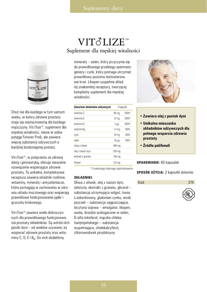 Suplementy diety VITyLIZE TM Suplement dla m´skiej witalnoÊci minerały – selen, który przyczynia si´ do prawidłowego przebiegu spermatogenezy i cynk, który pomaga utrzymaç prawidłowy poziomu testosteronu we krwi. Likopen uzupełnia skład tej znakomitej receptury, tworzàcej kompletny suplement dla m´skiej witalnoÊci. ZawartoÊç sk∏adników od˝ywczych Choç nie dla ka˝dego w tym samym wieku, w koƒcu zdrowie prostaty staje si´ wa˝nà kwestià dla ka˝dego m´˝czyzny. Vitylize TM , suplement dla m´skiej witalnoÊci, niesie w sobie pot´g´ Forever Pro6, ale zawiera wi´cej substancji od˝ywczych o bardziej biodost´pnej postaci. Vitylize TM , w połàczeniu ze zdrowà dietà i gimnastykà, oferuje naturalne rozwiàzanie wspierajàce zdrowie prostaty. Ta unikalna, kompleksowa receptura zawiera składniki roÊlinne, witaminy, minerały i antyutleniacze, które pomagajà w zachowaniu w zdrowiu układu moczowego oraz wspierajà prawidłowe funkcjonowanie jàder i gruczołu krokowego. Vitylize TM zawiera wiele dobroczynnych dla prawidłowego funkcjonowania prostaty składników. Sà wÊród nich pestki dyni – od wieków u˝ywane, by wspieraç zdrowie prostaty oraz witaminy C, D, E i B6. Do nich dodaliÊmy 2 kapsu∏ki witamina C 80 mg 100%* witamina E 12 mg 100%* witamina D 5 µg 100%* witamina B6 1,4 mg 100% cynk 10 mg 100% selen 55 µg 100% oliwa z oliwek 490 mg olej z nasion dyni 250 mg ekstrakt z granatu 150 mg likopen 2,5 mg * % zalecanego dziennego zapotrzebowania • Z awiera olej z pestek dyni • Unikalna mieszanka składników od˝ywczych dla pełnego wsparcia zdrowia prostaty • èródło polifenoli OPAKOWANIE: 60 kapsułek SPOSÓB U˚YCIA: 2 kapsułki dziennie. SK¸ADNIKI: Oliwa z oliwek, olej z nasion dyni, ˝elatyna, ekstrakt z granatu, glicerol – substancja utrzymujàca wilgoç, kwas L-askorbinowy, glukonian cynku, wosk pszczeli – substancja zag´szczajàca, lecytyna sojowa – emulgator, likopen, woda, dro˝d˝e wzbogacone w selen, D-alfa-tokoferol, màczka chleba Êwi´tojaƒskiego – substancja wypełniajàca, cholekalcyferol, chlorowodorek pirydoksyny. 35 Kod: 374
