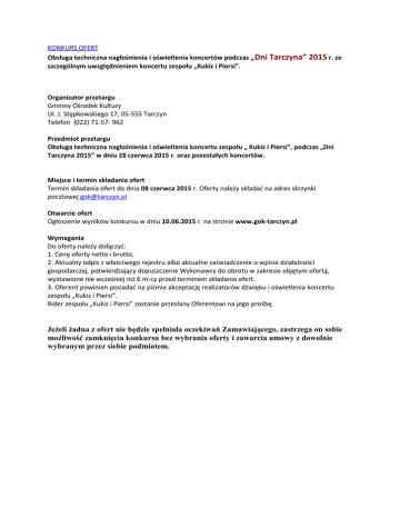 KONKURS OFERT Obsługa techniczna nagłośnienia i oświetlenia koncertów podczas „Dni Tarczyna” 2015 r. ze szczególnym uwzględnieniem koncertu zespołu „Kukiz i Piersi”. Organizator przetargu Gminny Ośrodek Kultury Ul. J. Stępkowskiego 17, 05-555 Tarczyn Telefon (022) 71-57- 962 Przedmiot przetargu Obsługa techniczna nagłośnienia i oświetlenia koncertu zespołu „ Kukiz i Piersi”, podczas „Dni Tarczyna 2015” w dniu 28 czerwca 2015 r. oraz pozostałych koncertów. Miejsce i termin składania ofert Termin składania ofert do dnia 08 czerwca 2015 r. Oferty należy składać na adres skrzynki pocztowej [email protected] Otwarcie ofert Ogłoszenie wyników konkursu w dniu 10.06.2015 r. na stronie www.gok-tarczyn.pl Wymagania Do oferty należy dołączyć: 1. Cenę oferty netto i brutto, 2. Aktualny odpis z właściwego rejestru albo aktualne zaświadczenie o wpisie działalności gospodarczej, potwierdzający dopuszczenie Wykonawcy do obrotu w zakresie objętym ofertą, wystawione nie wcześniej niż 6 m-cy przed terminem składania ofert. 3. Oferent powinien posiadać na piśmie akceptację realizatorów dźwięku i oświetlenia koncertu zespołu „Kukiz i Piersi”. Rider zespołu „Kukiz i Piersi” zostanie przesłany Oferentowi na jego prośbę. Jeżeli żadna z ofert nie będzie spełniała oczekiwań Zamawiającego, zastrzega on sobie możliwość zamknięcia konkursu bez wybrania oferty i zawarcia umowy z dowolnie wybranym przez siebie podmiotem.