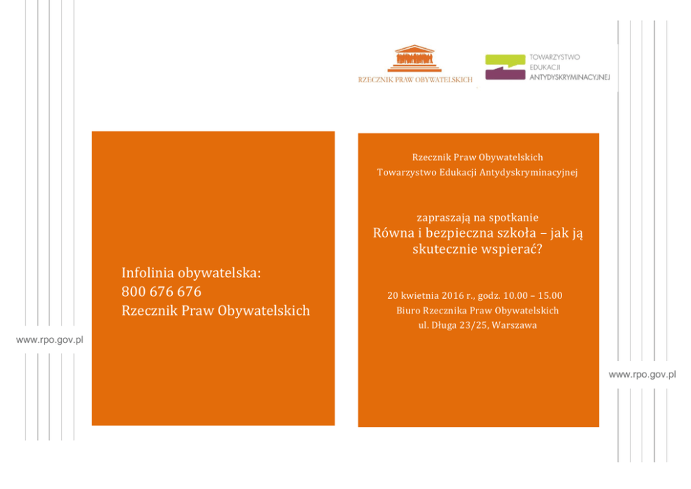 Rzecznik Praw Obywatelskich Towarzystwo Edukacji Antydyskryminacyjnej zapraszają na spotkanie Równa i bezpieczna szkoła – jak ją skutecznie wspierać? Infolinia obywatelska: 800 676 676 Rzecznik Praw Obywatelskich 20 kwietnia 2016 r., godz. 10.00 – 15.00 Biuro Rzecznika Praw Obywatelskich ul. Długa 23/25, Warszawa www.rpo.gov.pl www.rpo.gov.pl Celem spotkania współorganizowanego przez Biuro Rzecznika Praw Obywatelskich oraz Towarzystwo Edukacji Antydyskryminacyjnej (TEA) jest podjęcie wspólnej dyskusji na temat skutecznych rozwiązań służących zapewnieniu wszystkim uczniom i uczennicom pełnego bezpieczeństwa i ochrony przed dyskryminacją w szkołach w Polsce. Punktem wyjścia do dyskusji będą wyniki badań zrealizowanych przez Towarzystwo Edukacji Antydyskryminacyjnej. Najnowszy raport TEA „Edukacja antydyskryminacyjna. Ostatn i dzwonek!” oparty jest na rocznym monitoringu mediów oraz działań instytucji systemu edukacji. Publikacja ukazuje konkretne przypadki naruszeń bezpieczeństwa uczniów i uczennic, wynikających z nierównego traktowania i przemocy motywowanej uprzedzeniami, które miały miejsce w roku 2015. Jednocześnie raport przybliża, w jaki sposób na zidentyfikowaną przemoc reagowały instytucje działające w obszarze oświaty. Spotkanie jest wydarzeniem zamkniętym, skierowanym do przedstawicieli i przedstawicielek instytucji publicznych, instytucji badawczych i organizacji pozarządowych działających w obszarze edukacji i ochrony praw dziecka. Spotkanie zorganizowane jest dzięki wsparciu finansowemu Fundacji im. Heinricha Bölla. Badanie i raport TEA powstały w ramach programu Obywatele dla Demokracji, finansowanego z funduszy EOG. Prosimy o potwierdzenie udziału do dnia 13 kwietnia 2016 r. (środa) na adres: [email protected]. PROGRAM 10.00 10.15 11.00 12.15 12.30 13.45 15.00 Powitanie i otwarcie spotkania dr Sylwia Spurek, Zastępczyni Rzecznika Praw Obywatelskich Edukacja antydyskryminacyjna. Ostatni dzwonek! – prezentacja wyników raportu Magdalena Chustecka, Marta Rawłuszko, Towarzystwo Edukacji Antydyskryminacyjnej (TEA) Perspektywa praw dziecka w systemie edukacji formalnej Magdalena Chustecka, Towarzystwo Edukacji Antydyskryminacyjnej Komentarz Ministerstwa Edukacji Narodowej Komentarz Rzecznika Praw Dziecka Komentarz Ośrodka Rozwoju Edukacji Podsumowanie Rzecznika Praw Obywatelskich Przerwa na kawę Rozwijanie kompetencji przeciwdziałania i reagowania na dyskryminację kadr systemu edukacji formalnej Marta Rawłuszko, Towarzystwo Edukacji Antydyskryminacyjnej Komentarz Ministerstwa Edukacji Narodowej Komentarz Rzecznika Praw Dziecka Komentarz Ośrodka Rozwoju Edukacji Podsumowanie Rzecznika Praw Obywatelskich Rozwiązania systemowe na rzecz równej i bezpiecznej szkoły Dyskusja Lunch Konferencja odbędzie się w przestrzeni dostosowanej do potrzeb osób z niepełnosprawnością ruchową. Dla osób, którym koszty dojazdu mogłyby uniemożliwić uczestnictwo w wydarzeniu, istnieje możliwość pokrycia kosztów podróży. Spotkanie organizowane dzięki wsparciu finansowemu Fundacji im. Heinricha Bölla w Polsce. Spotkanie zorganizowane w ramach projektu „Edukacja antydyskryminacyjna – sprawdzam! wspieram”, realizowanego w ramach programu Obywatele dla Demokracji, finansowanego z funduszy EOG.