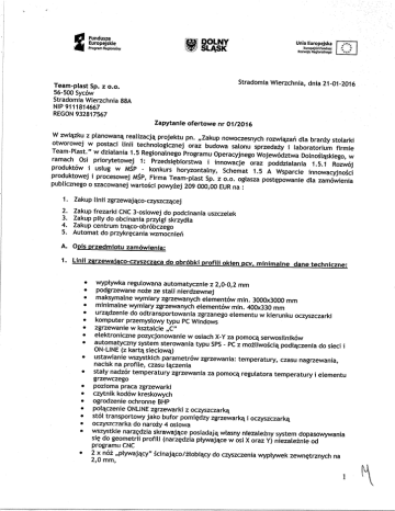 W nawiązaniu do zapytania ofertowego nr 1/2016 z dnia 21.01.2016 informujemy, iż zapytanie ofertowe dotyczy zakupu: 1. Zakup linii zgrzewająco-czyszczącej – 1 SZTUKA 2. Zakup frezarki CNC 3-osiowej do podcinania uszczelek – 3 SZTUKI 3. Zakup piły do obcinania przylgi skrzydła – 1 SZTUKA 4. Zakup centrum tnąco-obróbczego – 1 SZTUKA 5. Automat do przykręcania wzmocnień – 1 SZTUKA Jednocześnie w przypadku Zakup linii zgrzewająco-czyszczącej jako minimalny parametr techniczny wymagany jest dodatkowo: • komplet podpór do profili do zgrzewania dla systemu typu Veka lub równoważny i typu Gealan lub równoważny Pozostała treść zapytania pozostaje bez zmian. Stosowne sprostowanie do Ogłoszenia o zamówieniu - Zapytanie ofertowe nr 01/2016 PL utworzone : 21/01/2016 14:12, wysłane : 21/01/2016 14:14, opublikowane: 23/01/2016 zostało umieszczone w Dzienniku Urzędowym UE. Dodatkowa informacja lub sprostowanie - Zapytanie ofertowe nr 01/2016 PL. Utworzone : 26/01/2016 14:51, wysłane : 26/01/2016 14:51