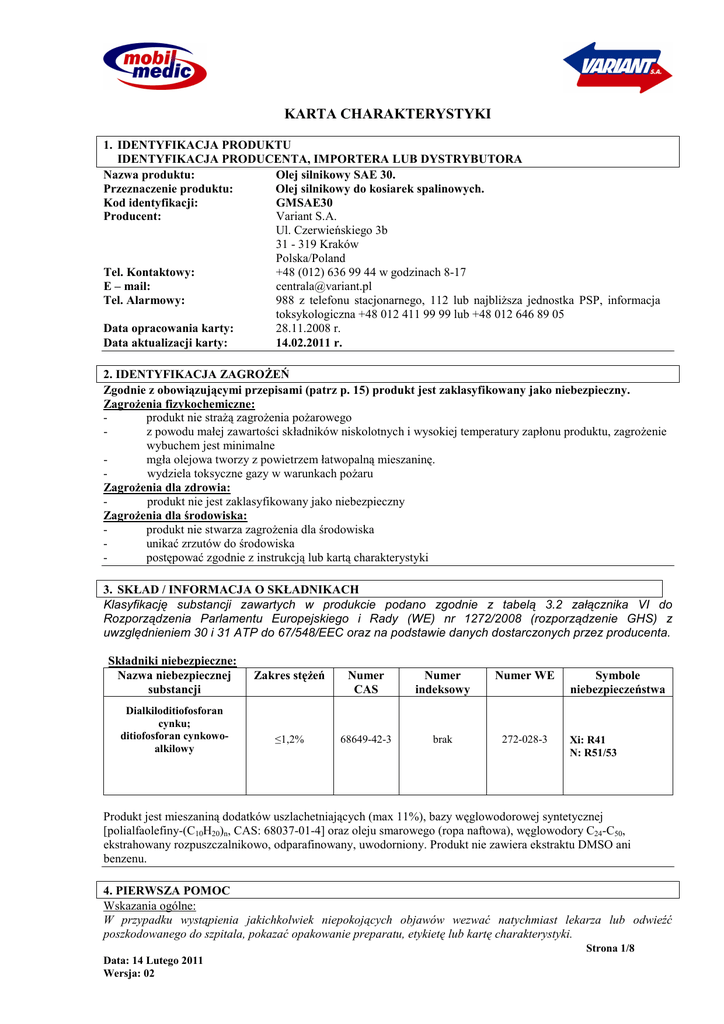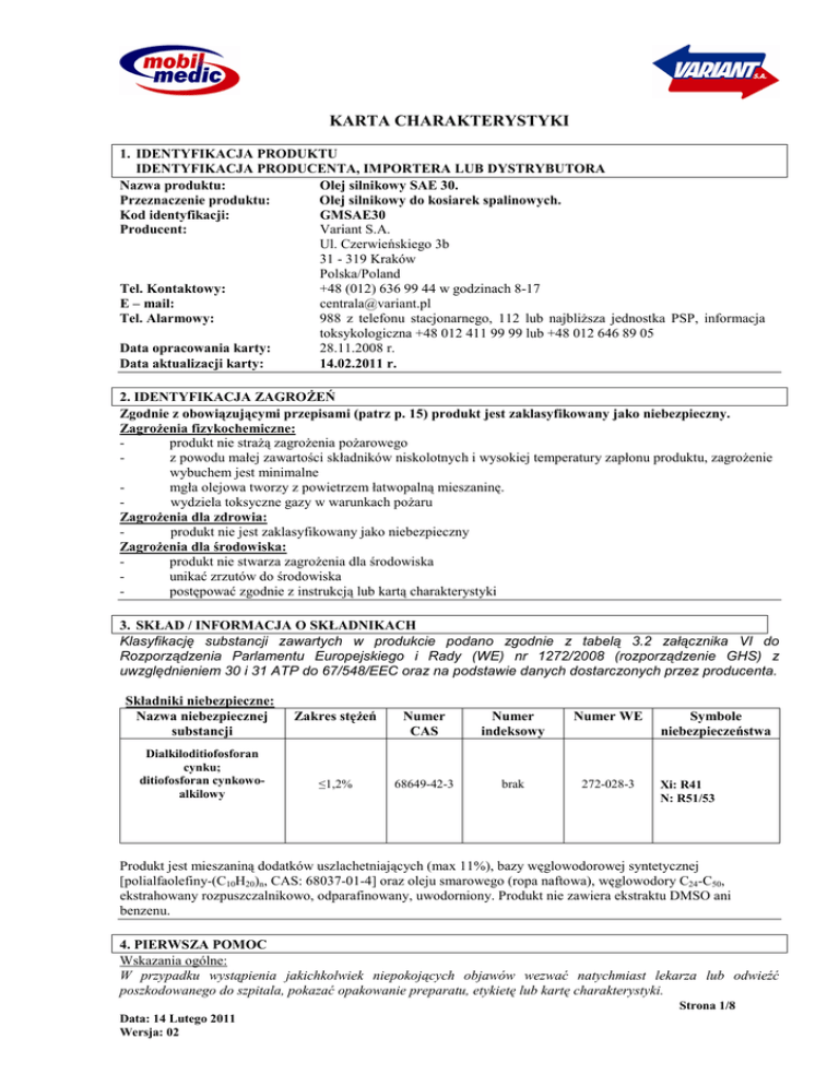 KARTA CHARAKTERYSTYKI 1. IDENTYFIKACJA PRODUKTU IDENTYFIKACJA PRODUCENTA, IMPORTERA LUB DYSTRYBUTORA Nazwa produktu: Olej silnikowy SAE 30. Przeznaczenie produktu: Olej silnikowy do kosiarek spalinowych. Kod identyfikacji: GMSAE30 Producent: Variant S.A. Ul. Czerwieńskiego 3b 31 - 319 Kraków Polska/Poland Tel. Kontaktowy: +48 (012) 636 99 44 w godzinach 8-17 E – mail: [email protected] Tel. Alarmowy: 988 z telefonu stacjonarnego, 112 lub najbliŜsza jednostka PSP, informacja toksykologiczna +48 012 411 99 99 lub +48 012 646 89 05 Data opracowania karty: 28.11.2008 r. Data aktualizacji karty: 14.02.2011 r. 2. IDENTYFIKACJA ZAGROśEŃ Zgodnie z obowiązującymi przepisami (patrz p. 15) produkt jest zaklasyfikowany jako niebezpieczny. ZagroŜenia fizykochemiczne: produkt nie straŜą zagroŜenia poŜarowego z powodu małej zawartości składników niskolotnych i wysokiej temperatury zapłonu produktu, zagroŜenie wybuchem jest minimalne mgła olejowa tworzy z powietrzem łatwopalną mieszaninę. wydziela toksyczne gazy w warunkach poŜaru ZagroŜenia dla zdrowia: produkt nie jest zaklasyfikowany jako niebezpieczny ZagroŜenia dla środowiska: produkt nie stwarza zagroŜenia dla środowiska unikać zrzutów do środowiska postępować zgodnie z instrukcją lub kartą charakterystyki 3. SKŁAD / INFORMACJA O SKŁADNIKACH Klasyfikację substancji zawartych w produkcie podano zgodnie z tabelą 3.2 załącznika VI do Rozporządzenia Parlamentu Europejskiego i Rady (WE) nr 1272/2008 (rozporządzenie GHS) z uwzględnieniem 30 i 31 ATP do 67/548/EEC oraz na podstawie danych dostarczonych przez producenta. Składniki niebezpieczne: Nazwa niebezpiecznej substancji Dialkiloditiofosforan cynku; ditiofosforan cynkowoalkilowy Zakres stęŜeń Numer CAS Numer indeksowy Numer WE ≤1,2% 68649-42-3 brak 272-028-3 Symbole niebezpieczeństwa Xi: R41 N: R51/53 Produkt jest mieszaniną dodatków uszlachetniających (max 11%), bazy węglowodorowej syntetycznej [polialfaolefiny-(C10H20)n, CAS: 68037-01-4] oraz oleju smarowego (ropa naftowa), węglowodory C24-C50, ekstrahowany rozpuszczalnikowo, odparafinowany, uwodorniony. Produkt nie zawiera ekstraktu DMSO ani benzenu. 4. PIERWSZA POMOC Wskazania ogólne: W przypadku wystąpienia jakichkolwiek niepokojących objawów wezwać natychmiast lekarza lub odwieźć poszkodowanego do szpitala, pokazać opakowanie preparatu, etykietę lub kartę charakterystyki. Strona 1/8 Data: 14 Lutego 2011 Wersja: 02 KARTA CHARAKTERYSTYKI Pierwsza pomoc przy naraŜeniu inhalacyjnym: osobę poszkodowaną przenieść do dobrze wentylowanego pomieszczenia osobę poszkodowaną umieścić w pozycji półleŜącej, rozluźnić ubranie, upewnić się czy w ustach osoby poszkodowanej nie zalegają przedmioty lub wydzielina utrudniające oddychanie zwrócić się o pomoc lekarską Pierwsza pomoc przy skaŜeniu oczu: skaŜone oczy płukać, przy rozwartych powiekach, ciągłym strumieniem bieŜącej wody przez 10-15 minut; unikać silnego strumienia wody, który moŜe stworzyć ryzyko uszkodzenia rogówki nie uŜywać Ŝadnych płynów do przemywania oczu ani Ŝadnych maści przed konsultacją medyczną w przypadku, gdy osoba poszkodowana nosi szkła kontaktowe zdjąć je zwrócić się o pomoc lekarską jeŜeli wystąpiły niepokojące onjawy Pierwsza pomoc przy skaŜeniu skóry: zdjąć zanieczyszczone ubranie do mycia skóry nie uŜywać Ŝadnych rozpuszczalników ani rozcieńczalników w przypadku oblania się produktem, miejsca zmoczone naleŜy zmyć obficie czystą wodą miejsce naraŜone na kontakt lub tylko podejrzane o kontakt z produktem przemyć duŜą ilością wody z mydłem zwrócić się o pomoc lekarską jeŜeli wystąpiły niepokojące objawy Pierwsza pomoc przy przyjęciu doustnym: wypłukać usta duŜą ilością bieŜącej wody nie powodować wymiotów konieczna pomoc lekarska 5. POSTĘPOWANIE W PRZYPADKU POśARU ZagroŜenia poŜarowe: produkt nie straŜą zagroŜenia poŜarowego z powodu małej zawartości składników niskolotnych i wysokiej temperatury zapłonu produktu, zagroŜenie wybuchem jest minimalne mgła olejowa tworzy z powietrzem łatwopalną mieszaninę. wydziela toksyczne gazy w warunkach poŜaru Polecane środki gaśnicze: ditlenek węgla (CO2) proszki gaśnicze piany odporne na alkohol woda - prądy rozproszone Nie polecane środki gaśnicze: woda - silny strumień ZagroŜenia specjalne: pojemniki naraŜone na działanie ognia lub wysokiej temperatury chłodzić wodą z bezpiecznej odległości, a jeŜeli to moŜliwe usunąć je z obszaru zagroŜenia podczas spalania preparatu powstają dymy zawierające niebezpieczne dla zdrowia substancje chemiczne, m.in. tlenek i ditlenek węgla w warunkach poŜaru moŜe nastąpić wybuch pojemnika Zalecenia ogólne: zaalarmować o poŜarze z obszaru zagroŜenia usunąć wszystkie osoby nie biorące udziału w akcji gaśniczej w razie potrzeby zarządzić ewakuację unikać wdychania dymu usunąć wszystkie źródła zapłonu stosować odzieŜ i sprzęt ochronny chronić układ oddechowy chłodzić wodą pojemniki naraŜone na kontakt z ogniem nie dopuścić do przedostania się wód gaśniczych do kanalizacji Niebezpieczne produkty spalania: tlenki węgla toksyczne gazy i dymy Środki ochrony osobistej: Strona 2/8 Data: 14 Lutego 2011 Wersja: 02 KARTA CHARAKTERYSTYKI - niezaleŜny aparat do oddychania i odzieŜ ochronna 6. POSTĘPOWANIE W PRZYPADKU NIEZAMIERZONEGO UWOLNIENIA DO ŚRODOWISKA Zalecenia ogólne: usunąć z obszaru zagroŜenia osoby nie biorące udziału w likwidowaniu awarii Środki ochrony osobistej: załoŜyć niezaleŜny aparat do oddychania z maską podczas usuwania nie wdychać par i aerozoli unikać kontaktu z uwalniającym się produktem stosować rękawice ochronne i ubranie ochronne uŜywać dobrze dopasowanych i przylegających okularów ochronnych z ochroną boczną lub odpowiedniej maski ochronnej Zalecenia szczegółowe: usunąć wszystkie źródła zapłonu nie palić tytoniu Środki ostro