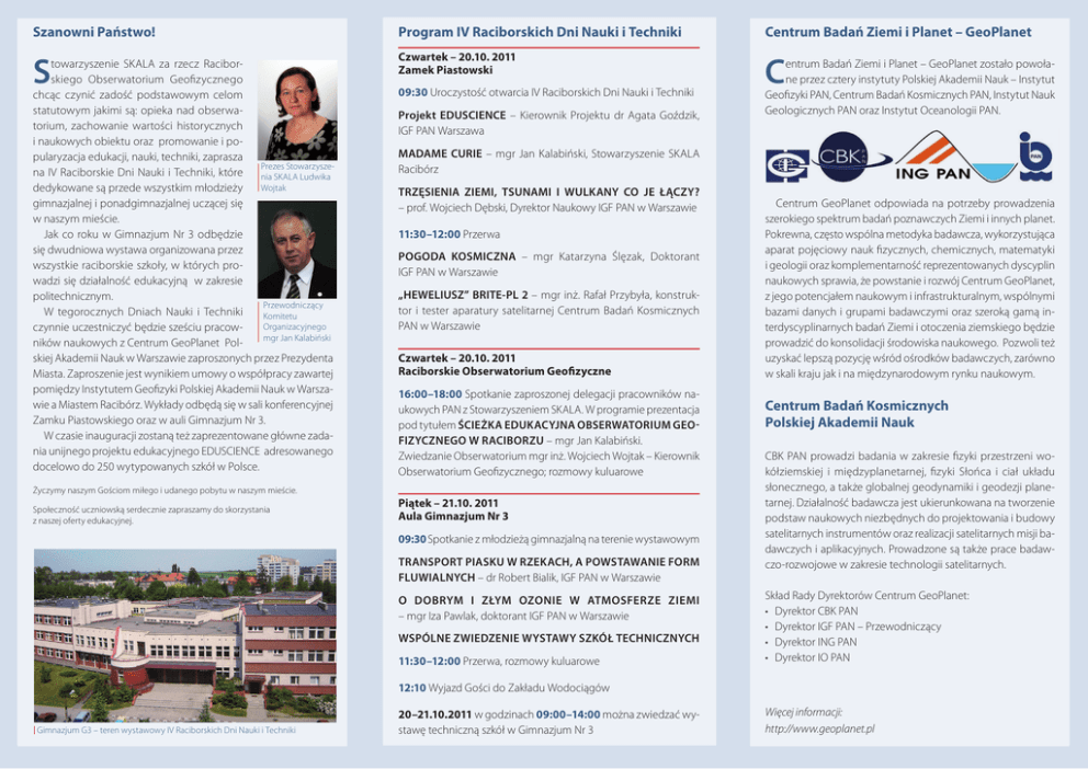 Szanowni Państwo! Program IV Raciborskich Dni Nauki i Techniki Centrum Badań Ziemi i Planet – GeoPlanet S Czwartek – 20.10. 2011 Zamek Piastowski C towarzyszenie SKALA za rzecz Raciborskiego Obserwatorium Geofizycznego chcąc czynić zadość podstawowym celom statutowym jakimi są: opieka nad obserwatorium, zachowanie wartości historycznych i naukowych obiektu oraz promowanie i popularyzacja edukacji, nauki, techniki, zaprasza Prezes Stowarzyszena IV Raciborskie Dni Nauki i Techniki, które nia SKALA Ludwika Wojtak dedykowane są przede wszystkim młodzieży gimnazjalnej i ponadgimnazjalnej uczącej się w naszym mieście. Jak co roku w Gimnazjum Nr 3 odbędzie się dwudniowa wystawa organizowana przez wszystkie raciborskie szkoły, w których prowadzi się działalność edukacyjną w zakresie politechnicznym. Przewodniczący W tegorocznych Dniach Nauki i Techniki Komitetu Organizacyjnego czynnie uczestniczyć będzie sześciu pracowmgr Jan Kalabiński ników naukowych z Centrum GeoPlanet Polskiej Akademii Nauk w Warszawie zaproszonych przez Prezydenta Miasta. Zaproszenie jest wynikiem umowy o współpracy zawartej pomiędzy Instytutem Geofizyki Polskiej Akademii Nauk w Warszawie a Miastem Racibórz. Wykłady odbędą się w sali konferencyjnej Zamku Piastowskiego oraz w auli Gimnazjum Nr 3. W czasie inauguracji zostaną też zaprezentowane główne zadania unijnego projektu edukacyjnego EDUSCIENCE adresowanego docelowo do 250 wytypowanych szkół w Polsce. 09:30 Uroczystość otwarcia IV Raciborskich Dni Nauki i Techniki Projekt EDUSCIENCE – Kierownik Projektu dr Agata Goździk, IGF PAN Warszawa MADAME CURIE – mgr Jan Kalabiński, Stowarzyszenie SKALA Racibórz TRZĘSIENIA ZIEMI, TSUNAMI I WULKANY CO JE ŁĄCZY? – prof. Wojciech Dębski, Dyrektor Naukowy IGF PAN w Warszawie 11:30–12:00 Przerwa POGODA KOSMICZNA – mgr Katarzyna Ślęzak, Doktorant IGF PAN w Warszawie „HEWELIUSZ” BRITE-PL 2 – mgr inż. Rafał Przybyła, konstruktor i tester aparatury satelitarnej Centrum Badań Kosmicznych PAN w Warszawie Czwartek – 20.10. 2011 Raciborskie Obserwatorium Geofizyczne 16:00–18:00 Spotkanie zaproszonej delegacji pracowników naukowych PAN z Stowarzyszeniem SKALA. W programie prezentacja pod tytułem Ścieżka edukacyjna Obserwatorium Geofizycznego w Raciborzu – mgr Jan Kalabiński. Zwiedzanie Obserwatorium mgr inż. Wojciech Wojtak – Kierownik Obserwatorium Geofizycznego; rozmowy kuluarowe Życzymy naszym Gościom miłego i udanego pobytu w naszym mieście. Społeczność uczniowską serdecznie zapraszamy do skorzystania z naszej oferty edukacyjnej. entrum Badań Ziemi i Planet – GeoPlanet zostało powołane przez cztery instytuty Polskiej Akademii Nauk – Instytut Geofizyki PAN, Centrum Badań Kosmicznych PAN, Instytut Nauk Geologicznych PAN oraz Instytut Oceanologii PAN. Piątek – 21.10. 2011 Aula Gimnazjum Nr 3 09:30 Spotkanie z młodzieżą gimnazjalną na terenie wystawowym Transport piasku w rzekach, a powstawanie form fluwialnych – dr Robert Bialik, IGF PAN w Warszawie O doBrym i złym ozonie w atmosferze Ziemi – mgr Iza Pawlak, doktorant IGF PAN w Warszawie Wspólne zwiedzenie Wystawy Szkół Technicznych 11:30–12:00 Przerwa, rozmowy kuluarowe Centrum GeoPlanet odpowiada na potrzeby prowadzenia szerokiego spektrum badań poznawczych Ziemi i innych planet. Pokrewna, często wspólna metodyka badawcza, wykorzystująca aparat pojęciowy nauk fizycznych, chemicznych, matematyki i geologii oraz komplementarność reprezentowanych dyscyplin naukowych sprawia, że powstanie i rozwój Centrum GeoPlanet, z jego potencjałem naukowym i infrastrukturalnym, wspólnymi bazami danych i grupami badawczymi oraz szeroką gamą interdyscyplinarnych badań Ziemi i otoczenia ziemskiego będzie prowadzić do konsolidacji środowiska naukowego. Pozwoli też uzyskać lepszą pozycję wśród ośrodków badawczych, zarówno w skali kraju jak i na międzynarodowym rynku naukowym. Centrum Badań Kosmicznych Polskiej Akademii Nauk CBK PAN prowadzi badania w zakresie fizyki przestrzeni wokółziemskiej i międzyplanetarnej, fizyki Słońca i ciał układu słonecznego, a także globalnej geodynamiki i geodezji planetarnej. Działalność badawcza jest ukierunkowana na tworzenie podstaw naukowych niezbędnych do projektowania i budowy satelitarnych instrumentów oraz realizacji satelitarnych misji badawczych i aplikacyjnych. Prowadzone są także prace badawczo-rozwojowe w zakresie technologii satelitarnych. Skład Rady Dyrektorów Centrum GeoPlanet: • Dyrektor CBK PAN • Dyrektor IGF PAN – Przewodniczący • Dyrektor ING PAN • Dyrektor IO PAN 12:10 Wyjazd Gości do Zakładu Wodociągów Gimnazjum G3 – teren wystawowy IV Raciborskich Dni Nauki i Techniki 20–21.10.2011 w godzinach 09:00–14:00 można zwiedzać wystawę techniczną szkół w Gimnazjum Nr 3 Więcej informacji: http://www.geoplanet.pl RADA UPOWSZECHNIANIA NAUKI z wizytą podczas III Raciborskich Dniach Nauki i Techniki Migawki z poprzednich edycji Raciborskich Dni Nauki i Techniki 20–21 października 2011 r. O statnia w kadencji Sesja Plenarna RUN odbyła się 7 października br. w Raciborzu. Członkowie RUN i ich goście wzięli następnie udział w III. Raciborskich Dniach Nauki i Techniki. Sesja Plenarna poświęcona była podsumowaniu działalności RUN w kadencji 2007–2010. Sprawozdanie merytoryczne przedstawiła Przewodnicząca, prof. Magdalena Fikus, sprawozdanie finansowe – Sekretarz RUN, dr Patrycja Dołowy. W dyskusji członkowie RUN uznali za celowe kontynuację działań RUN. Rada ze względu na ogólnopolski charakter i budowany autorytet, ma możliwość wsparcia bardzo różnorodnych lokalnych inicjatyw popularyzatorskich w Polsce, reagowania na ważne zjawiska z zakresu nauki i jej obrzeży. RACIBORSKIE DNI NAUKI I TECHNIKI Podpisanie umowy o współpracy IGF PAN – Miasto Racibórz Seminarium w PWSZ Wizyta w muzeum Spotkanie w Obserwatorium Geofizycznym Zamek Piastowski K