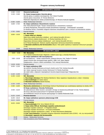 Program ramowy konferencji 24 marca 2011, czwartek 13.00 – 13.30 Otwarcie konferencji 13.30 – 15.00 S1. Sesja inauguracyjna: Zawroty głowy Zawroty głowy w praktyce neurologicznej. Prof. Antoni Prusiński Zawroty głowy naczyniowe. Dr Tomasz Berkowicz Możliwości diagnostyczne układu przedsionkowego. Dr Marzena Kubiczek-Jagielska 15.00 – 16.00 Obiad. Restauracja Czerwona 16.00 – 17.30 S2. Sesja wykładowa: Stwardnienie rozsiane Prof. Halina Bartosik-Psujek: Terapie niestandardowe w stwardnieniu rozsianym Dr Maciej Maciejowski: Nowoczesna terapia stwardnienia rozsianego – teraźniejszość i przyszłość Dr Klaudiusz Kumor: Przewlekła mózgowo-rdzeniowa niewydolność żylna u chorych na stwardnienie rozsiane 17.30 – 18.00 Przerwa kawowa 18.00 – 19.30 20.00 W1. Warsztaty 1 .Sesja wideo pt. Ataksje Skale oceny ataksji (dysfunkcji móżdżku) - prof. Andrzej Szczudlik (30 min.) Obrazy kliniczne ataksji dziedzicznych - dr Monika Rudzińska (30 min.) Diagnostyka różnicowa ataksji móżdżkowych - prof. Andrzej Szczudlik (30 min.) 2. Dr Maciej Maciejowski: Wybrane aspekty diagnostyki różnicowej stwardnienia rozsianego. 3. Warsztat satelitarny dla farmaceutów (Bayer): Rola apteki szpitalnej w badaniach klinicznych (początek 17.45) Kolacja. Restauracja Czerwona 25 marca 2011, piątek 8.00 – 8.50 9.00 – 10.30 W2. Warsztaty 1. Dr Gabiela Kłodowska-Duda: Otępienie z ciałami Lewy' ego, a choroba Parkinsona S5. Sesja wykładowa: Ból neuropatyczny Ból neuropatyczny – zasady rozpoznawania, postacie kliniczne. Prof. Teofan M. Domżał Zasady leczenia bólu neuropatycznego zgodnie z EBM. Prof. Adam Stępień Postępowanie z chorym z bólem przewlekłym. Prof. Andrzej Potemkowski 10.30 - 10.50 Przerwa kawowa 10.50 – 12.20 S4. Sesja wykładowa GSK Jak odróżnić chorobę Parkinsona od innych chorób ruchu? Prof. Andrzej Szczudlik Jak i kiedy rozpocząć leczenie choroby Parkinsona? Dr Monika Rudzińska Jak radzić sobie z objawami niepożądanymi leczenia dopaminergicznego? Małgorzata Dec 12.20 – 12.40 Przerwa 12.40 – 13.30 W3. Warsztaty 1. Neurologia dziecięca (Prof. Barbara Steinborn): Stany napadowe niepadaczkowe u dzieci i młodzieży 2. Neuroradiologia (dr Cezary Szary) 3. Warsztat satelitarny (Sanofi-Aventis) 13.30 – 14.50 Obiad. Restauracja Czerwona 14.00 – 16.00 Wycieczka szkoleniowa do Ustrońskiego Centrum Psychoterapii (po wcześniejszej rejestracji na stoisku UCP) 14.50 – 16.20 S3 Sesja wykładowa: Choroba Parkinsona Jak optymalizować efekty leczenia i prowadzić chorego na bezpiecznej politerapii? dr hab. Monika Białecka Jak leczyć zaburzenia pozaruchowe? Dr Agnieszka Gorzkowska Jak kwalifikować chorych do leczenia operacyjnego? Dr Gabiela Kłodowska-Duda 16.20 – 16.40 Przerwa kawowa 16.40 – 18.10 S6. Sesja wykładowa sponsora platynowego UCB 18.10 – 18.30 Przerwa kawowa 18.30 – 20.00 20.00 21.00 W4. Warsztaty 1. Neuroradiologia (Prof. Jerzy Walecki) 90 min 2. Sesja wideo-EEG pt. Semiologia napadów padaczkowych Semiologia napadów czołowych - dr Magdalena Bosak Semiologia napadów skroniowych - dr Krystyna Niedzielska Semiologia napadów ogniskowych u dzieci - dr Maria Mazurkiewicz-Bełdzińska 3. Prof. Jerzy Kotowicz: Przewlekła mózgowo-rdzeniowa niewydolność żylna (CCSVI) - mit, czy rzeczywistość? 4. Warsztaty i egzamin dla farmaceutów Kolacja – Restauracja Czerwona, Gala prowadzona przez Piotra Galińskiego © 2011 Medforum Sp. z o.o. Wszelkie prawa zastrzeżone. v. 21/02/2011 Materiał ten jest chroniony prawami autorskimi i nie może być wykorzystany, kopiowany, publikowany i rozprowadzany w żadnej formie. ul. Brynowska 70, 40-584 Katowice, tel.: 032 700 71 71, fax. 032 700 71 81, e-mail: [email protected], www.medforum.com.pl 1/2 Program ramowy konferencji 26 marca 2011, sobota 8.00 – 8.50 9.00 – 10.30 10.30 – 11.00 11.00 - 12.30 12.30 - 13.00 13.00 W5. Warsztaty 1. Neuroradiologia (dr Cezary Szary) S7. Sesja wykładowa: Stany nagłe w neurologii („udary” - prof. Anna Członkowska) Tromboliza - czy można leczyć więcej chorych? Prof. Anna Członkowska Pomyłki diagnostyczne. Dr Adam Kobayashi Rzadkie przypadki. Dr Beata Błażejewska-Hyżorek Przerwa kawowa S8. Sesja wykładowa: Neuropsychiatria Dr hab. Tomasz Sobów: Stan psychiczny a wybór leku przeciwpadaczkowego u chorych z padaczką Prof. Irena Krupka-Matuszczyk: Leki psychotropowe w neurologii Dr hab. Tadeusz Parnowski: Zaburzenia psychiczne (BPSD) w otępieniu Dyskusja panelowa Podsumowanie i zakończenie konferencji © 2011 Medforum Sp. z o.o. Wszelkie prawa zastrzeżone. v. 21/02/2011 Materiał ten jest chroniony prawami autorskimi i nie może być wykorzystany, kopiowany, publikowany i rozprowadzany w żadnej formie. ul. Brynowska 70, 40-584 Katowice, tel.: 032 700 71 71, fax. 032 700 71 81, e-mail: [email protected], www.medforum.com.pl 2/2