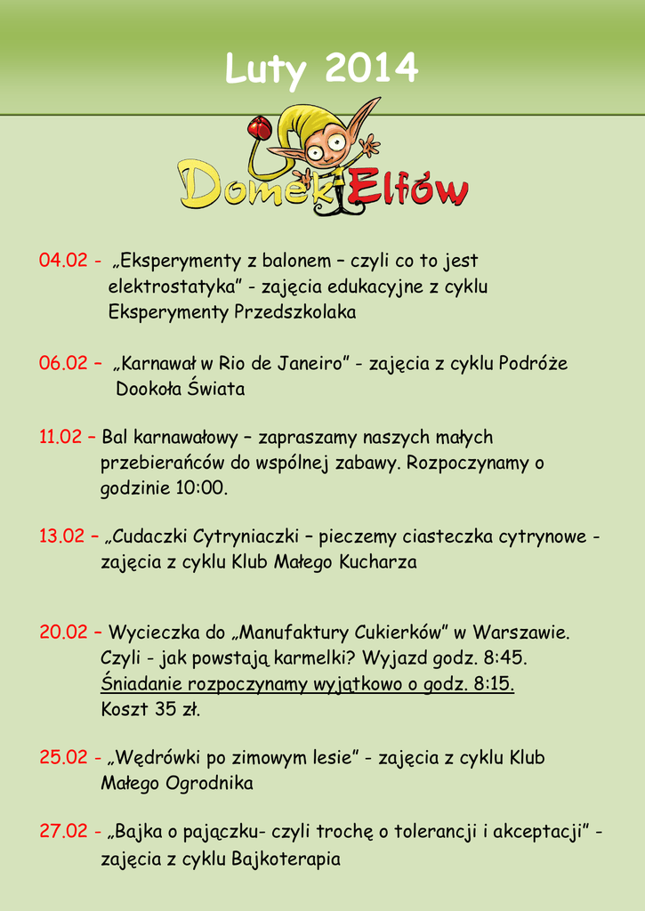 Luty 2014 04.02 - „Eksperymenty z balonem – czyli co to jest elektrostatyka” - zajęcia edukacyjne z cyklu Eksperymenty Przedszkolaka 06.02 – „Karnawał w Rio de Janeiro” - zajęcia z cyklu Podróże Dookoła Świata 11.02 – Bal karnawałowy – zapraszamy naszych małych przebierańców do wspólnej zabawy. Rozpoczynamy o godzinie 10:00. 13.02 – „Cudaczki Cytryniaczki – pieczemy ciasteczka cytrynowe zajęcia z cyklu Klub Małego Kucharza 20.02 – Wycieczka do „Manufaktury Cukierków” w Warszawie. Czyli - jak powstają karmelki? Wyjazd godz. 8:45. Śniadanie rozpoczynamy wyjątkowo o godz. 8:15. Koszt 35 zł. 25.02 - „Wędrówki po zimowym lesie” - zajęcia z cyklu Klub Małego Ogrodnika 27.02 - „Bajka o pajączku- czyli trochę o tolerancji i akceptacji” zajęcia z cyklu Bajkoterapia