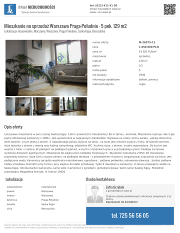 tel. (022) 412 41 50 email: [email protected] www: scn.waw.pl Mieszkanie na sprzedaż Warszawa Praga-Południe - 5 pok. 129 m2 Lokalizacja: mazowieckie, Warszawa, Warszawa, Praga-Południe, Saska Kępa, Berezyńska numer oferty M-26575-11 cena 1 850 000 PLN cena m 14 381 PLN/m2 mieszkanie sprzedaż, metraż 129 m2 piętro 2/2 liczba pokoi 5 rok budowy 1936 informacje dodatkowe balkon, piwnica materiał budynku cegła 2 Opis oferty Luksusowe mieszkanie w sercu starej Saskiej Kępy. 128 m powierzchni mieszkalnej i 65 m tarasu , kominek. Mieszkanie zajmuje całe 2-gie piętro odnowionej kamienicy z 1936 r. Jest wykończone w najwyższym standardzie. Wystawa na cztery strony świata , pokoje słoneczne, dwie łazienki, w tym jedna z oknem. Z największego pokoju wyjście na taras , na taras jest również wyjście z hollu. W salonie kominek, duża łazienka z oknem z wanną oraz kabiną natryskową, oddzielnie WC. Kuchnia duża, z oknem, w pełni wyposażona. Do kuchni jest wejście z hollu i z salonu. W pokojach na podłogach parkiet, w kuchni i łazienkach gres a w przedpokoju granit. Podłoga na tarasie wyłożona drewnem egzotycznym. Mieszkanie do wejścia bez nakładów finansowych . Wysokość mieszkania 2,95m Do mieszkania przynależy piwnica -duża 16m z dużym oknem, na podłodze terakota - z powodzeniem można tu zorganizować pracownię lub biuro, jest podłączona woda. Kamienicą zarządza wspólnota mieszkaniowa, ogrodzona , zadbane podwórko, odnowiona elewacja , bardzo zadbana klatka schodowa. Domofon przy furtce i przy wejściu do klatki schodowej. Tylko 6 mieszkań w kamienicy. Z tarasu przepiękny widok na Saską Kępę. Uliczka bardzo kameralna, same wille i kamienice z ogrodami, jednokierunkowa. Samo serce Saskiej Kępy. Pośrednik prowadzący Magdalena Armijak, nr licencji 19420 Lokalizacja Osoba kontaktowa Zofia Grzybek województwo mazowieckie powiat Warszawa [email protected] miasto Warszawa dzielnica Praga-Południe osiedle Saska Kępa Chętnie udzielę dodatkowych informacji związanych z tą ofertą. Zapraszam do kontaktu! ulica Berezyńska tel. 725 56 56 05 Zawsze dążymy do tego, aby informacje o proponowanych przez nas ofertach były jak najbardziej dokładne. Niekiedy jednak, ze względu na fakt, iż uzyskujemy je od osób trzecich nie jest możliwe ich zweryfikowanie, wobec czego należy traktować je orientacyjnie i nie stanowią one oferty w rozumieniu kodeksu cywilnego.