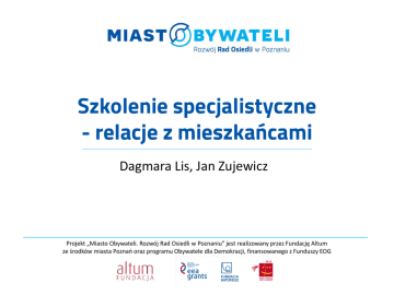 Szkolenie specjalistyczne - relacje z mieszkańcami Dagmara Lis, Jan Zujewicz Projekt „Miasto Obywateli. Rozwój Rad Osiedli w Poznaniu” jest realizowany przez Fundację Altum ze środków miasta Poznań oraz programu Obywatele dla Demokracji, finansowanego z Funduszy EOG Miasto Obywateli - działania Działania w ramach projektu: • badania opinii dotyczące rad osiedli, • konferencja podsumowująca 4 lata działalności rad osiedli, • kampania frekwencyjna przed wyborami do rad osiedli, • portal o działalności rad osiedli www.osiedla.poznan.pl, • podręcznik dla nowych radnych osiedlowych, • wsparcie edukacyjne dla nowych radnych: szkolenia + asystent, Projekt „Miasto Obywateli. Rozwój Rad Osiedli w Poznaniu” jest realizowany ze środków miasta Poznań oraz programu Obywatele dla Demokracji, finansowanego z Funduszy EOG. Asystent Rady 693 356 164 782 685 090 [email protected] Projekt „Miasto Obywateli. Rozwój Rad Osiedli w Poznaniu” jest realizowany ze środków miasta Poznań oraz programu Obywatele dla Demokracji, finansowanego z Funduszy EOG. Szkolenie specjalistyczne Dagmara Lis, Jan Zujewicz Projekt „Miasto Obywateli. Rozwój Rad Osiedli w Poznaniu” jest realizowany przez Fundację Altum ze środków miasta Poznań oraz programu Obywatele dla Demokracji, finansowanego z Funduszy EOG Po co? Jaki jest sens komunikowania się z mieszkańcami? • • • • • • • • lepsze spełnianie potrzeb mieszkańców, lepsze wypełnianie celów statutowych, lepsze wydatkowanie pieniędzy, budowanie wspólnoty (odpowiedzialność), promocja organizowanych wydarzeń, „pochwalenie się”, wyższa frekwencja w wyborach do rad osiedli, poparcie społeczne dla realizacji konkretnego zadania Projekt „Miasto Obywateli. Rozwój Rad Osiedli w Poznaniu” jest realizowany przez Fundację Altum ze środków miasta Poznań oraz programu Obywatele dla Demokracji, finansowanego z Funduszy EOG Jak? Najważniejsze zasady komunikacji z mieszkańcami • • • • • • • • • uczciwość, klarowność, kwestie czasowe, uniwersalność – wykorzystanie kilku kanałów komunikacyjnych naraz, unikanie nieporozumień, inicjatywa, zrozumiały język, formułowanie informacji w łatwy do zapamiętania sposób, ograniczona ilość informacji Projekt „Miasto Obywateli. Rozwój Rad Osiedli w Poznaniu” jest realizowany przez Fundację Altum ze środków miasta Poznań oraz programu Obywatele dla Demokracji, finansowanego z Funduszy EOG Czym? Najważniejsze kanały komunikacji • • • • • • • • • • • • • gazetka, media (TV, prasa, Internet, radio) media społecznościowe (np. Facebook), strona internetowa, plakaty, wypowiedzi publiczne, „poczta pantoflowa”, gablota, mailing, słupy ogłoszeniowe, telefon, ogłoszenia parafialne ulotki Projekt „Miasto Obywateli. Rozwój Rad Osiedli w Poznaniu” jest realizowany przez Fundację Altum ze środków miasta Poznań oraz programu Obywatele dla Demokracji, finansowanego z Funduszy EOG Facebook Zalety: • charakter bardzo społecznościowy: entuzjazm, radość, „lekkie życie”, • całkowicie darmowo Wady: • powierzchowne informacje, • hejting – krytyka, • wysokie zaangażowanie osób spoza osiedla, • • błyskawiczna reakcja, możliwość uruchomienia reklam Dobre przykłady: • facebook.com/radaosiedlawilda, • facebook.com/pages/Rada-OsiedlaNaramowice/ Najważniejsze zasady: • uaktualniać!!, • najrzadziej jeden post na tydzień, • jak najwięcej zdjęć, Projekt „Miasto Obywateli. Rozwój Rad Osiedli w Poznaniu” jest realizowany przez Fundację Altum ze środków miasta Poznań oraz programu Obywatele dla Demokracji, finansowanego z Funduszy EOG Strona internetowa Zalety: • gwarantuje świetny dostęp do dokumentów, • wszystkie informacje w jednym miejscu, w pigułce, • interaktywność: kontakt, zapisywanie się na wydarzenia, konsultacje itp. Wady: • im lepsza strona, tym wyższa cena, • wysoka zawodność, • Coraz mniej popularna forma komunikacja, kosztem Facebooka Najważniejsze zasady: • uaktualnianie!!, • nie przesadzać z rozbudowaniem strony, • wersja mobilna, • wysoka jakość informacji Przykłady: • www.swierczewo.poznan.pl, • www.jezyce.poznan.pl Projekt „Miasto Obywateli. Rozwój Rad Osiedli w Poznaniu” jest realizowany przez Fundację Altum ze środków miasta Poznań oraz programu Obywatele dla Demokracji, finansowanego z Funduszy EOG Poczta pantoflowa Zalety: • informacja rozprzestrzeniana jest stosunkowo szybko i daleko, • całkowicie darmowe i wymagające niewielkiego wysiłku, • skuteczny sposób dotarcia do ludzi bez dostępu do Internetu i mediów, Wady: • działa najlepiej tam, gdzie ludzie są zintegrowani, • wysokie prawdopodobieństwo zniekształcenia informacji, • negatywne informacje rozprzestrzeniają się szybciej niż te pozytywne Najważniejsze zasady: • przygotować zwięzłą informację, • rozpowszechnić w zintegrowanych i zainteresowanych grupach, • informacja musi być ciekawa Projekt „Miasto Obywateli. Rozwój Rad Osiedli w Poznaniu” jest realizowany przez Fundację Altum ze środków miasta Poznań oraz programu Obywatele dla Demokracji, finansowanego z Funduszy EOG Media lokalne Zalety: • bardzo duży zasięg oddziaływania, • może służyć jako siła nacisku w ważnej dla osiedla sprawie, • Budowanie pozytywnego wizerunku rady osiedla Wady: • przekazanie informacji w innym świetle niż planujemy, • może powodować napięcia wewnątrz osiedla, • nieprawidłowe wykorzystanie mediów może działać na niekorzyść Najważniejsze zasady: • proste, klarowne i rzeczowe wypowiedzi dla mediów, • autoryzacja, • upewnienie się czy dziennikarz zrozumiał przekaz • kontaktujemy się z mediami dopiero, jak wyczerpiemy wszystkie inne środki, Projekt „Miasto Obywateli. Rozwój Rad Osiedli w Poznaniu” jest realizowany przez Fundację Altum ze środków m