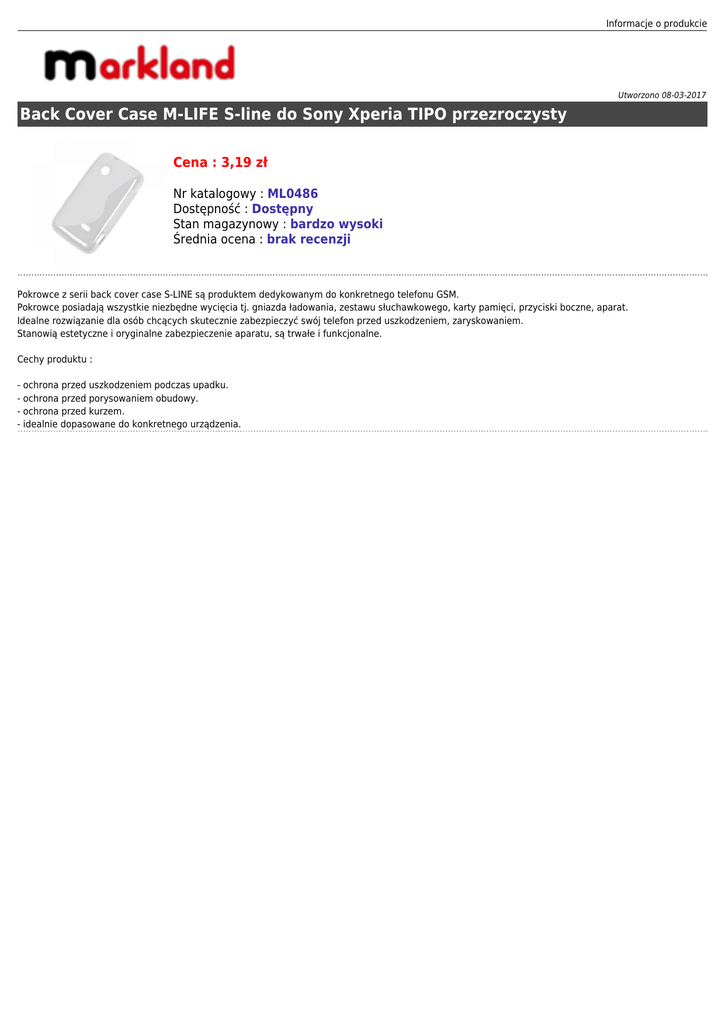 Informacje o produkcie Utworzono 08-03-2017 Back Cover Case M-LIFE S-line do Sony Xperia TIPO przezroczysty Cena : 3,19 zł Nr katalogowy : ML0486 Dostępność : Dostępny Stan magazynowy : bardzo wysoki Średnia ocena : brak recenzji Pokrowce z serii back cover case S-LINE są produktem dedykowanym do konkretnego telefonu GSM. Pokrowce posiadają wszystkie niezbędne wycięcia tj. gniazda ładowania, zestawu słuchawkowego, karty pamięci, przyciski boczne, aparat. Idealne rozwiązanie dla osób chcących skutecznie zabezpieczyć swój telefon przed uszkodzeniem, zaryskowaniem. Stanowią estetyczne i oryginalne zabezpieczenie aparatu, są trwałe i funkcjonalne. Cechy produktu : - ochrona przed uszkodzeniem podczas upadku. - ochrona przed porysowaniem obudowy. - ochrona przed kurzem. - idealnie dopasowane do konkretnego urządzenia.