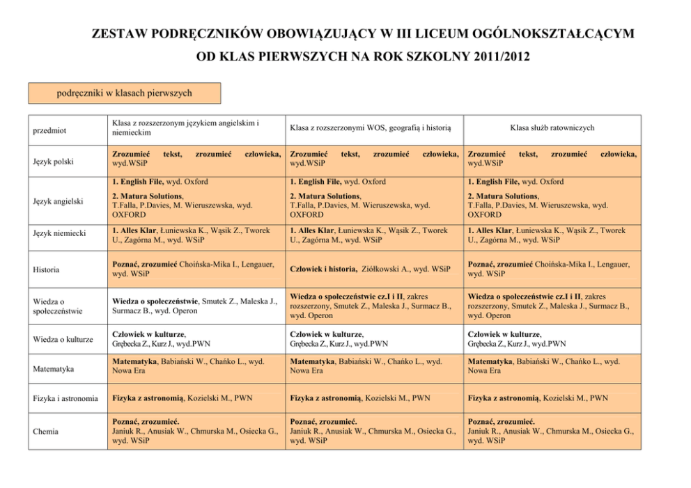 ZESTAW PODRĘCZNIKÓW OBOWIĄZUJĄCY W III LICEUM OGÓLNOKSZTAŁCĄCYM OD KLAS PIERWSZYCH NA ROK SZKOLNY 2011/2012 podręczniki w klasach pierwszych przedmiot Klasa z rozszerzonym językiem angielskim i niemieckim Klasa z rozszerzonymi WOS, geografią i historią Język polski Zrozumieć wyd.WSiP Zrozumieć wyd.WSiP tekst, zrozumieć człowieka, tekst, zrozumieć człowieka, Klasa służb ratowniczych Zrozumieć wyd.WSiP tekst, zrozumieć człowieka, 1. English File, wyd. Oxford 1. English File, wyd. Oxford 1. English File, wyd. Oxford 2. Matura Solutions, T.Falla, P.Davies, M. Wieruszewska, wyd. OXFORD 2. Matura Solutions, T.Falla, P.Davies, M. Wieruszewska, wyd. OXFORD 2. Matura Solutions, T.Falla, P.Davies, M. Wieruszewska, wyd. OXFORD Język niemiecki 1. Alles Klar, Łuniewska K., Wąsik Z., Tworek U., Zagórna M., wyd. WSiP 1. Alles Klar, Łuniewska K., Wąsik Z., Tworek U., Zagórna M., wyd. WSiP 1. Alles Klar, Łuniewska K., Wąsik Z., Tworek U., Zagórna M., wyd. WSiP Historia Poznać, zrozumieć Choińska-Mika I., Lengauer, wyd. WSiP Człowiek i historia, Ziółkowski A., wyd. WSiP Poznać, zrozumieć Choińska-Mika I., Lengauer, wyd. WSiP Wiedza o społeczeństwie Wiedza o społeczeństwie, Smutek Z., Maleska J., Surmacz B., wyd. Operon Wiedza o społeczeństwie cz.I i II, zakres rozszerzony, Smutek Z., Maleska J., Surmacz B., wyd. Operon Wiedza o społeczeństwie cz.I i II, zakres rozszerzony, Smutek Z., Maleska J., Surmacz B., wyd. Operon Wiedza o kulturze Człowiek w kulturze, Grębecka Z., Kurz J., wyd.PWN Człowiek w kulturze, Grębecka Z., Kurz J., wyd.PWN Człowiek w kulturze, Grębecka Z., Kurz J., wyd.PWN Matematyka Matematyka, Babiański W., Chańko L., wyd. Nowa Era Matematyka, Babiański W., Chańko L., wyd. Nowa Era Matematyka, Babiański W., Chańko L., wyd. Nowa Era Fizyka i astronomia Fizyka z astronomią, Kozielski M., PWN Fizyka z astronomią, Kozielski M., PWN Fizyka z astronomią, Kozielski M., PWN Chemia Poznać, zrozumieć. Janiuk R., Anusiak W., Chmurska M., Osiecka G., wyd. WSiP Poznać, zrozumieć. Janiuk R., Anusiak W., Chmurska M., Osiecka G., wyd. WSiP Poznać, zrozumieć. Janiuk R., Anusiak W., Chmurska M., Osiecka G., wyd. WSiP Język angielski 1. Podstawy życia. Tajemnice ludzkiego ciała. Pyłka-Gutowska E., Jastrzębska E., wyd. MAC Edukacja 1. Podstawy życia. Tajemnice ludzkiego ciała. Pyłka-Gutowska E., Jastrzębska E., wyd. MAC Edukacja 1. Podstawy życia. Tajemnice ludzkiego ciała. Pyłka-Gutowska E., Jastrzębska E., wyd. MAC Edukacja 2. Poznać, zrozumieć. Biologia Gąsińska B.,Kofta W, WSiP 2. Poznać, zrozumieć. Biologia Gąsińska B.,Kofta W, WSiP 2. Poznać, zrozumieć. Biologia Gąsińska B.,Kofta W, WSiP (wybór podręcznika uzależniony jest od nauczyciela) (wybór podręcznika uzależniony jest od nauczyciela) (wybór podręcznika uzależniony jest od nauczyciela) Geografia Geografia na czasie, Lenartowicz B., Wilczyńska E., Wójcik M., Wydawnictwo Szkolne PWN Geografia na czasie, Lenartowicz B., Wilczyńska E., Wójcik M., Wydawnictwo Szkolne PWN Geografia na czasie, Lenartowicz B., Wilczyńska E., Wójcik M., Wydawnictwo Szkolne PWN Podstawy przedsiębiorczości Przedsiębiorczość bez tajemnic, Gregorczyk S., Romanowska M., Sopińska A., Wachowiak P., wyd. WSiP Przedsiębiorczość bez tajemnic, Gregorczyk S., Romanowska M., Sopińska A., Wachowiak P., wyd. WSiP Przedsiębiorczość bez tajemnic, Gregorczyk S., Romanowska M., Sopińska A., Wachowiak P., wyd. WSiP Technologia informacyjna 1. Technologia informacyjna, Wrotek W., wyd. Helion 1. Technologia informacyjna, Wrotek W., wyd. Helion 1. Technologia informacyjna, Wrotek W., wyd. Helion Przysposobienie obronne I ty możesz żyć bezpiecznie, Siuda T., Zaczek Zaczyński K, Zimińska U., Oficyna Wydawnicza Adam I ty możesz żyć bezpiecznie, Siuda T., Zaczek Zaczyński K, Zimińska U., Oficyna Wydawnicza Adam I ty możesz żyć bezpiecznie, Siuda T., Zaczek Zaczyński K, Zimińska U., Oficyna Wydawnicza Adam Religia Jestem świadkiem Chrystusa w Kościele, wyd. WAM Kraków Jestem świadkiem Chrystusa w Kościele, wyd. WAM Kraków Jestem świadkiem Chrystusa w Kościele, wyd. WAM Kraków Biologia Służby ratownicze - - brak podręcznika literatura proponowana niebowiązkowa: Ratownictwo medyczne - - 1. Ratownik medyczny, Jakubaszko J., wyd. Medyczne Górnicki 2. Medycyna ratunkowa i katastrof, Zawadzki A., wyd. PZWL Podstawy prawa - - brak podręcznika Psychologia zachowań ekstremalnych - - brak podręcznika Język obcy w służbach ratowniczych - - brak podręcznika