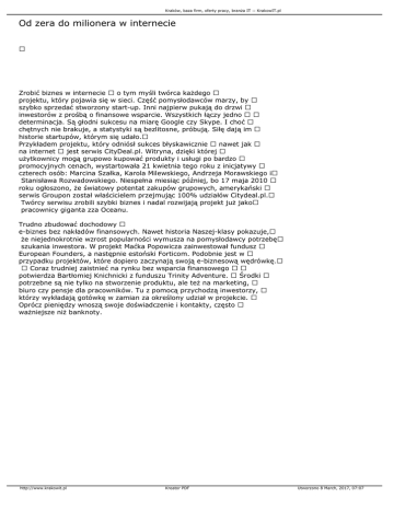 Kraków, baza firm, oferty pracy, branża IT :: KrakowIT.pl Od zera do milionera w internecie Zrobić biznes w internecie o tym myśli twórca każdego projektu, który pojawia się w sieci. Część pomysłodawców marzy, by szybko sprzedać stworzony start-up. Inni najpierw pukają do drzwi inwestorów z prośbą o finansowe wsparcie. Wszystkich łączy jedno determinacja. Są głodni sukcesu na miarę Google czy Skype. I choć chętnych nie brakuje, a statystyki są bezlitosne, próbują. Siłę dają im historie startupów, którym się udało. Przykładem projektu, który odniósł sukces błyskawicznie nawet jak na internet jest serwis CityDeal.pl. Witryna, dzięki której użytkownicy mogą grupowo kupować produkty i usługi po bardzo promocyjnych cenach, wystartowała 21 kwietnia tego roku z inicjatywy czterech osób: Marcina Szałka, Karola Milewskiego, Andrzeja Morawskiego i Stanisława Rozwadowskiego. Niespełna miesiąc później, bo 17 maja 2010 roku ogłoszono, że światowy potentat zakupów grupowych, amerykański serwis Groupon został właścicielem przejmując 100% udziałów Citydeal.pl. Twórcy serwisu zrobili szybki biznes i nadal rozwijają projekt już jako pracownicy giganta zza Oceanu. Trudno zbudować dochodowy e-biznes bez nakładów finansowych. Nawet historia Naszej-klasy pokazuje, że niejednokrotnie wzrost popularności wymusza na pomysłodawcy potrzebę szukania inwestora. W projekt Maćka Popowicza zainwestował fundusz European Founders, a następnie estoński Forticom. Podobnie jest w przypadku projektów, które dopiero zaczynają swoją e-biznesową wędrówkę. Coraz trudniej zaistnieć na rynku bez wsparcia finansowego potwierdza Bartłomiej Knichnicki z funduszu Trinity Adventure. Środki potrzebne są nie tylko na stworzenie produktu, ale też na marketing, biuro czy pensje dla pracowników. Tu z pomocą przychodzą inwestorzy, którzy wykładają gotówkę w zamian za określony udział w projekcie. Oprócz pieniędzy wnoszą swoje doświadczenie i kontakty, często ważniejsze niż banknoty. http://www.krakowit.pl Kreator PDF Utworzono 8 March, 2017, 07:07
