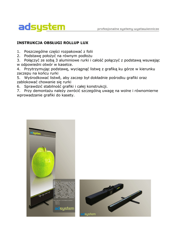 INSTRUKCJA OBSŁUGI ROLLUP LUX 1. Poszczególne części rozpakować z folii 2. Podstawę położyć na równym podłożu 3. Połączyć ze sobą 3 aluminiowe rurki i całość połączyć z podstawą wsuwając w odpowiedni otwór w kasetce. 4. Przytrzymując podstawę, wyciągnąć listwę z grafiką ku górze w kierunku zaczepu na końcu rurki 5. Wyśrodkować listwê, aby zaczep był dokładnie pośrodku grafiki oraz zablokować chowanie się rurki 6. Sprawdzić stabilność grafiki i całej konstrukcji. 7. Przy demontażu należy zwrócić szczególną uwagę na wolne i równomierne wprowadzanie grafiki do kasety.