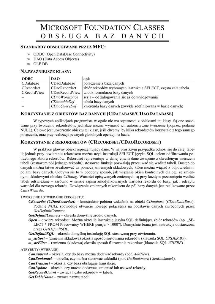 KORZYSTANIE Z OBIEKTÓW BAZ DANYCH (CDATABASE/CDAODATABASE)