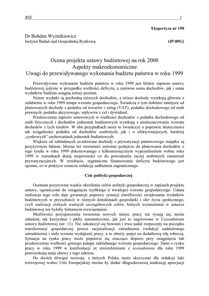 BSE 1 Ekspertyza nr 190 Dr Bohdan Wyżnikiewicz Instytut Badań nad Gospodarką Rynkową (IP-89G) Ocena projektu ustawy budżetowej na rok 2000 Aspekty makroekonomiczne Uwagi do przewidywanego wykonania budżetu państwa w roku 1999 Przewidywane wykonanie budżetu państwa w roku 1999 jest bliskie zapisom ustawy budżetowej jedynie w przypadku wielkości deficytu, a zarówno suma dochodów, jak i suma wydatków budżetu osiągną niższy poziom. Niższe wydatki są pochodną niższych dochodów, a niższe dochody wynikają głównie z osłabienia w roku 1999 tempa wzrostu gospodarczego. Świadczą o tym dobitnie mniejsze od planowanych dochody z podatku od towarów i usług (VAT), podatku dochodowego od osób prawnych, podatku akcyzowego, wpływów z ceł i dywidend. Przekroczenia zapisów ustawowych w wielkości dochodów z podatku dochodowego od osób fizycznych i dochodów jednostek budżetowych wynikają z niedoszacowania wzrostu dochodów z tych tytułów. W obu przypadkach może to świadczyć o poprawie skuteczności tak ściągalności podatku od dochodów osobistych, jak i o efektywniejszych, bardziej „rynkowych” zachowaniach jednostek budżetowych. Większe od zakładanych oczekiwane dochody z prywatyzacji państwowego majątku są pozytywnym faktem. Można też zrozumieć ostrożne podejście do planowania dochodów z tego tytułu w roku 1999 dokonywanego z kilkumiesięcznym wyprzedzeniem wobec roku 1999 w warunkach dużej niepewności co do powodzenia raczej ambitnych zamierzeń prywatyzacyjnych. W rezultacie, zagraniczne finansowanie deficytu budżetowego jest ujemne, co w praktyce oznacza redukcję zadłużenia zagranicznego. Cele polityki gospodarczej Oceniam pozytywnie wąskie określenie celów polityki gospodarczej w zapisach projektu ustawy, ograniczone do osiągnięcia szybkiego (i trwałego) wzrostu gospodarczego. Udana realizacja tego celu daje gwarancje poprawy sytuacji (możliwości zwiększania wydatków budżetowych w przyszłości) w różnych dziedzinach gospodarki i sfer życia społecznego, czyli realizacji różnych ważnych szczegółowych celów, których wymienianie w ustawie budżetowej nie byłoby fortunnym rozwiązaniem. Możliwości przyspieszenia tworzenia nowych miejsc pracy nie rysują się, moim zdaniem, tak korzystnie i jakby automatycznie, jak jest to sugerowane w Uzasadnieniu ustawy budżetowej (str. 11). Nie zakończył się bowiem i trwa nadal rozpoczęty na początku transformacji gospodarczej proces racjonalizacji zatrudnienia (redukcji nadmiernego zatrudnienia) i stale wzrasta wydajność pracy, a to obniży popyt na dodatkową siłę roboczą. Sytuacja na rynku pracy może poprawić się znacząco dopiero przy osiągnięciu lub przekroczeniu wielkości górnego pułapu zakładanego wzrostu gospodarczego. Dane o rynku pracy w roku 1999 w konfrontacji ze stwierdzeniami z uzasadnienia dla roku 1999 potwierdzają moje obawy z tego zakresu. Do dwóch dźwigni rozwoju, z których Polska może skorzystać dla redukcji luki rozwojowej wobec Unii Europejskiej można by dodać długookresową tendencję aprecjacji 2 BSE złotego. Zjawisko to powoduje redukcję luki dochodowej, co znajduje również wyraz w redukcji luki rozwojowej. Uwarunkowania zewnętrzne Przedstawione w Uzasadnieniu... uwarunkowania zewnętrzne rozwoju gospodarczego Polski w roku 2000 nie budzą poważniejszych kontrowersji i są rzetelnie naświetlone. Niemniej jednak warto zwrócić uwagę na niedocenianie w dokumencie wpływu sytuacji gospodarczej Rosji na stan koniunktury makroekonomicznej w Polsce. Doświadczenia lat 1998 i 1999 wyraźnie wskazują na silne pośrednie efekty złej sytuacji w Rosji. Jeżeli eksport do Rosji jest ograniczany (np. brakiem dewiz na zakupy w innych krajach), to tradycyjnie kierowane do Rosji towary (produkcja krajowa Polski i dodatkowo import z innych krajów nie sprzedany do Rosji) „zalewają” polski rynek. Wpływa to w istotny sposób na ograniczanie rozmiarów produkcji krajowej. Jest to szczególnie wyraźne w przemyśle spożywczym i lekkim. Znacząca poprawa sytuacji w Rosji może mieć podobny odwrotny efekt, czyli stanowić impuls wzrostowy dla gospodarki Polski. Realizacja celów Słusznie podnosi się niepokojącą kwestię niskiego poziomu stopy oszczędności krajowych, która może okazać się barierą dla szybkiego wzrostu gospodarczego. Nie jest jednak powiedziane, jak zamierza się zwiększać wzrost stopy oszczędności. Stwierdzenie (str. 22), że „niska inflacja jest istotnym czynnikiem stymulującym skłonność do oszczędzania” jest dość ryzykowne w przypadku Polski przełomu wieków, gdzie po latach wysokich nominalnych stóp oprocentowania depozytów, stosunkowo szybkie obniżenie tych stóp stwarza barierę psychologiczną dla zwiększania stopy oszczędzania. Równocześnie, po latach wyrzeczeń, wzrost siły nabywczej dochodów ludności i większa dostępność kredytów powodują bardziej wzrost skłonności do konsumpcji niż skłonności do oszczędzania. Narzędzia polityki gospodarczej Omówienie polityki strukturalnej jest przedstawieniem przeprowadzanych z wielkimi trudnościami i licznymi niepowodzeniami restrukturyzacji górnictwa, hutnictwa, PKP i przemysłu obronnego oraz przedstawieniem innych działań (prywatyzacji) w dziedziny gospodarki takich jak rynek pracy, rolnictwo i małe i średnie przedsiębiorstwa. Wszystkie te obszary od wielu lat wpływają negatywnie na wydolność strukturalną gospodarki Polski. Długookresowa strategia prywatyzacji w Polsce ukształtowana była trudno poddającymi się kontroli pozbawionymi wspólnej filozofii prywatyzacyjnej decyzjami kolejnych ministrów „przekształceń własnościowych”. Doprowadziło to do stanu, w którym kolejnemu etapowi prywatyzacji podlegać będą trudne do prywatyzacji sektory obejmujące duże przedsiębiorstwa (w dużej mierze pochodzące z czterech sektorów – przedmiotów programów restrukturyzacyjnych). W tym świe